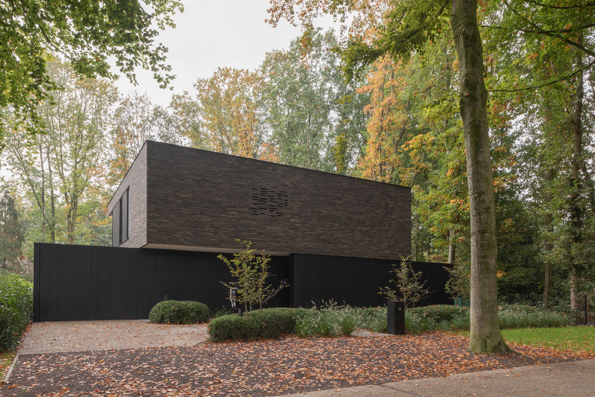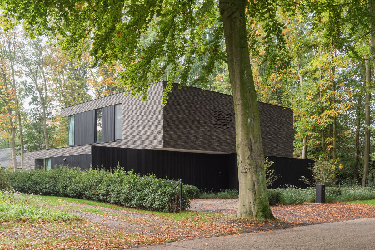 De keuze voor de exclusieve Infinitum 7012 gevelsteen vormde een belangrijk aspect omdat het natuurlijke kleurenpalet zich mooi in de groene bosrijke omgeving integreert en goed combineert met de zwart geoliede houten gevelbekleding en de zwarte aluminium ramen.