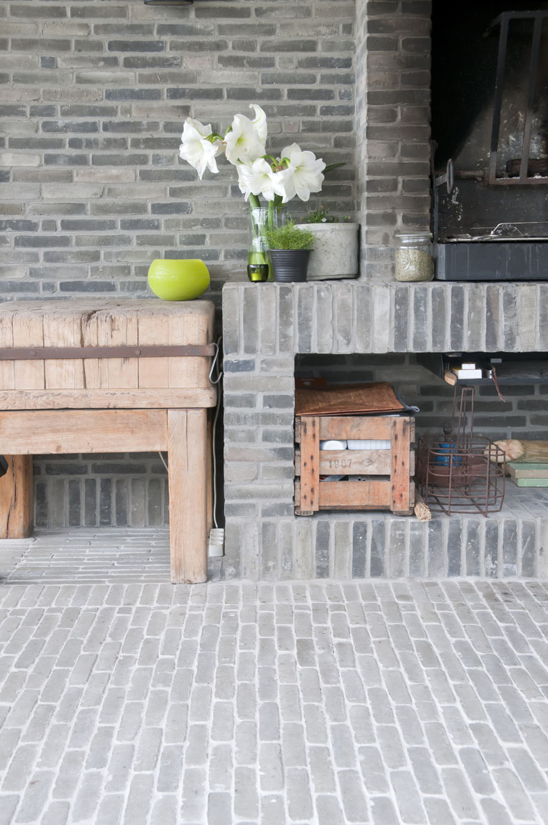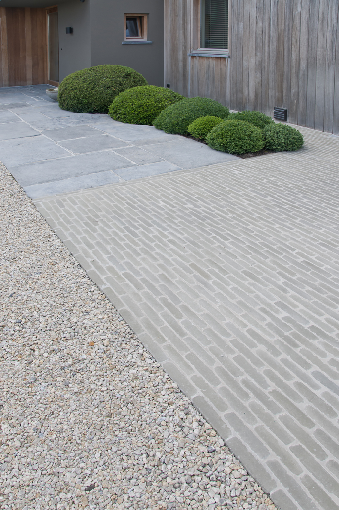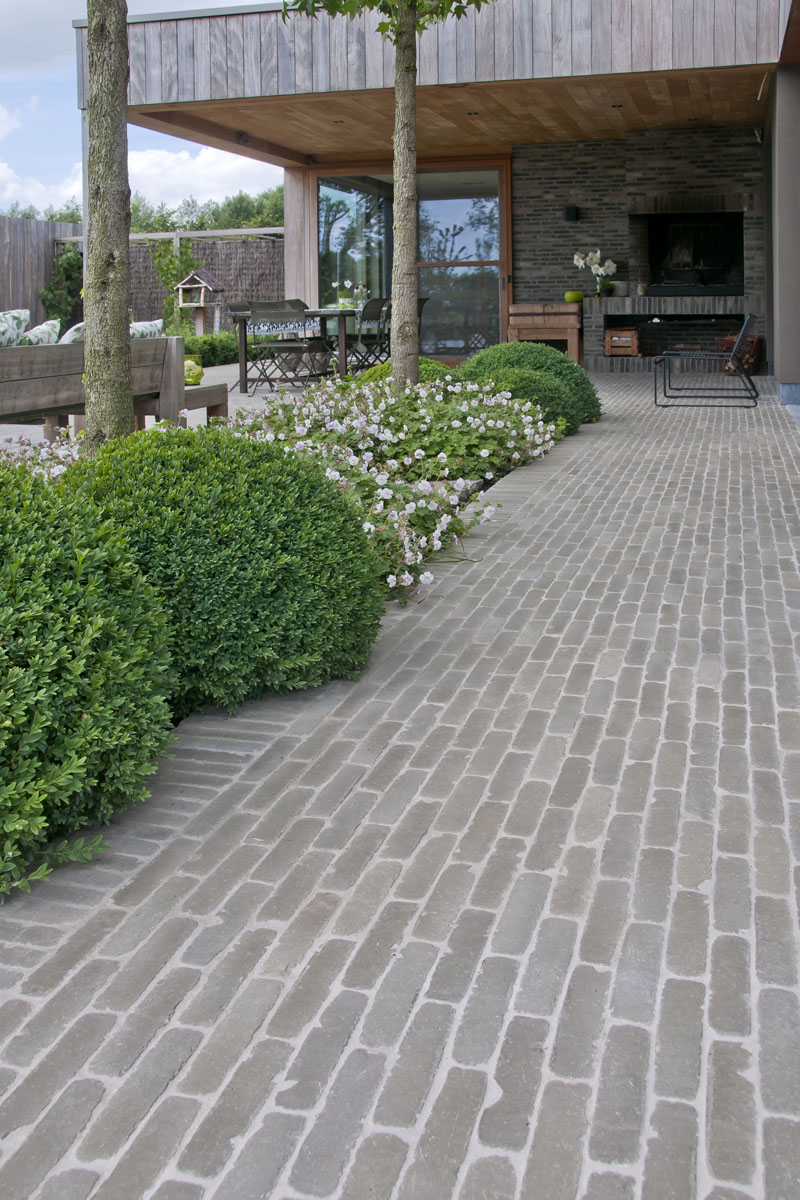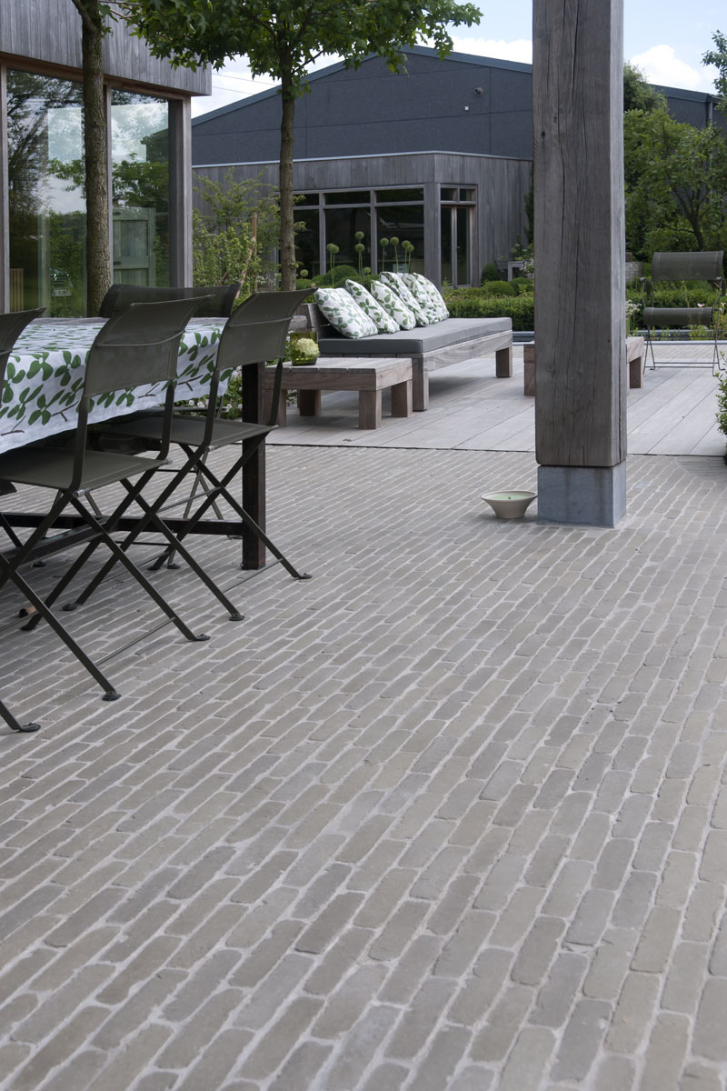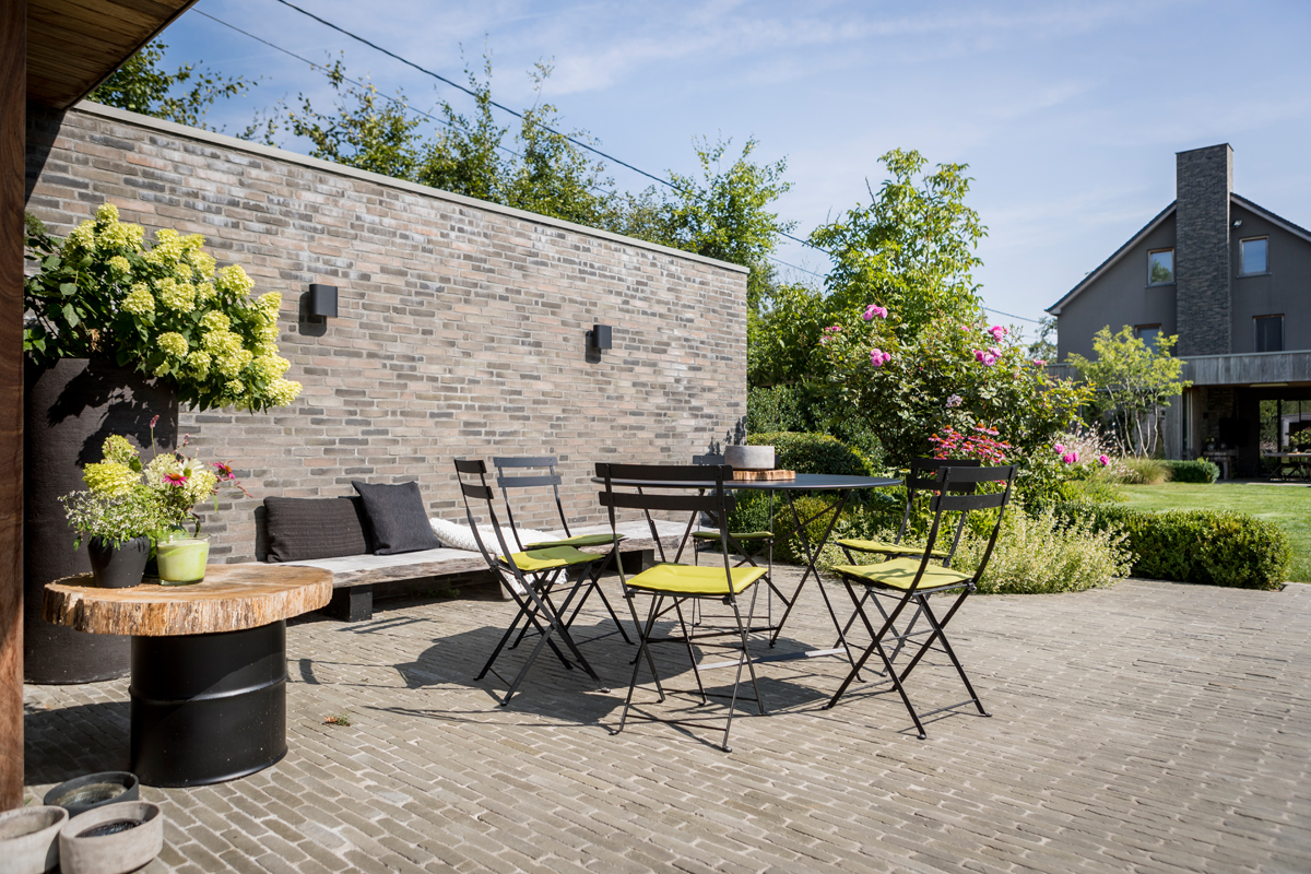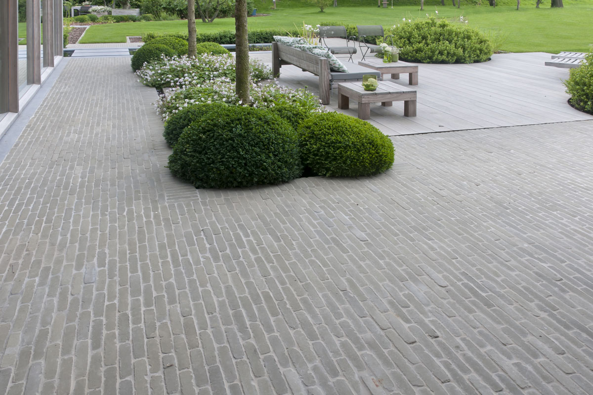 De Ancienne Belgique Parelgrijs kleiklinkers laten zien dat dit elegant verhardingsmateriaal in verschillende stijlen toegepast kan worden. De lichtgrijze tint past perfect bij zowel de donkergrijze Miniature Zwart-grijs gevelsteen als bij de blauwsteendallen en het Afrormosia hardhout.
