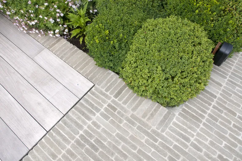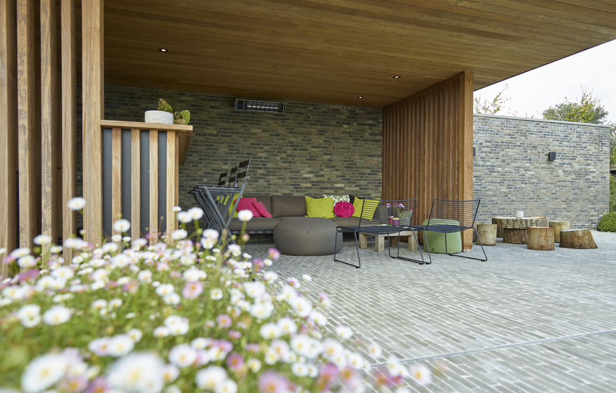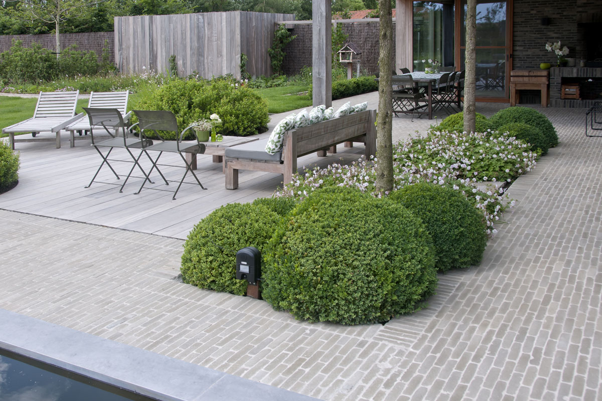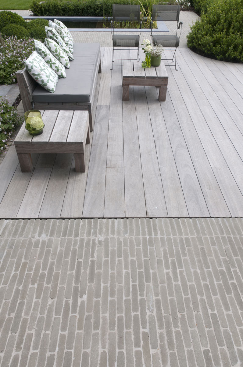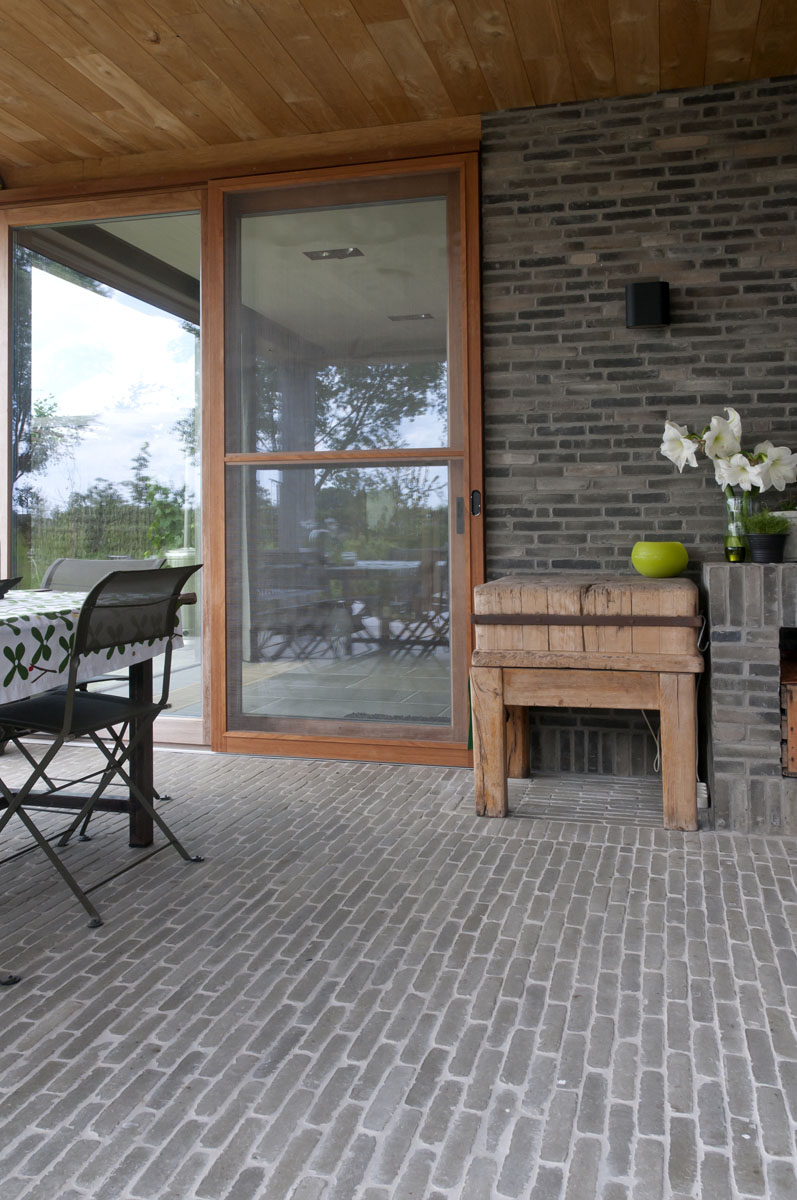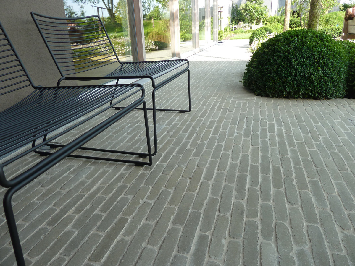 De Ancienne Belgique Parelgrijs kleiklinkers laten zien dat dit elegant verhardingsmateriaal in verschillende stijlen toegepast kan worden. De lichtgrijze tint past perfect bij zowel de donkergrijze Miniature Zwart-grijs gevelsteen als bij de blauwsteendallen en het Afrormosia hardhout.