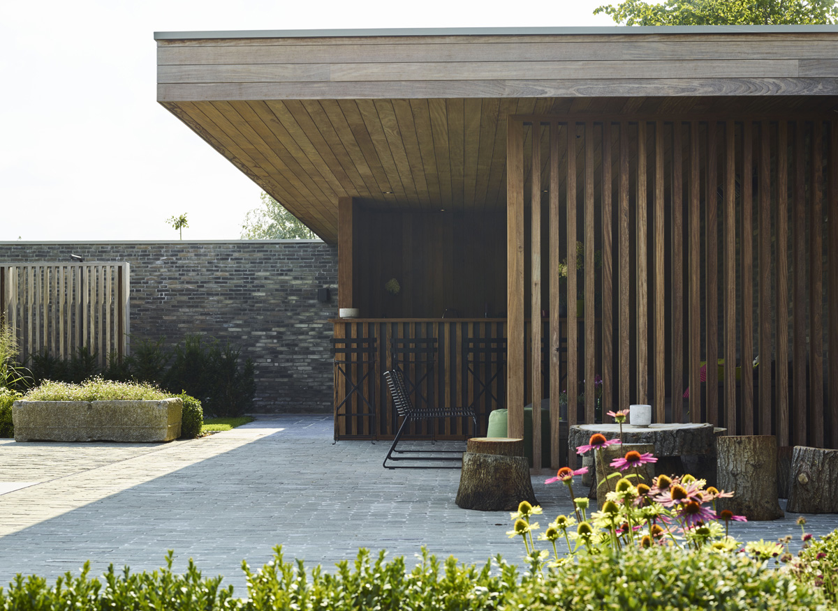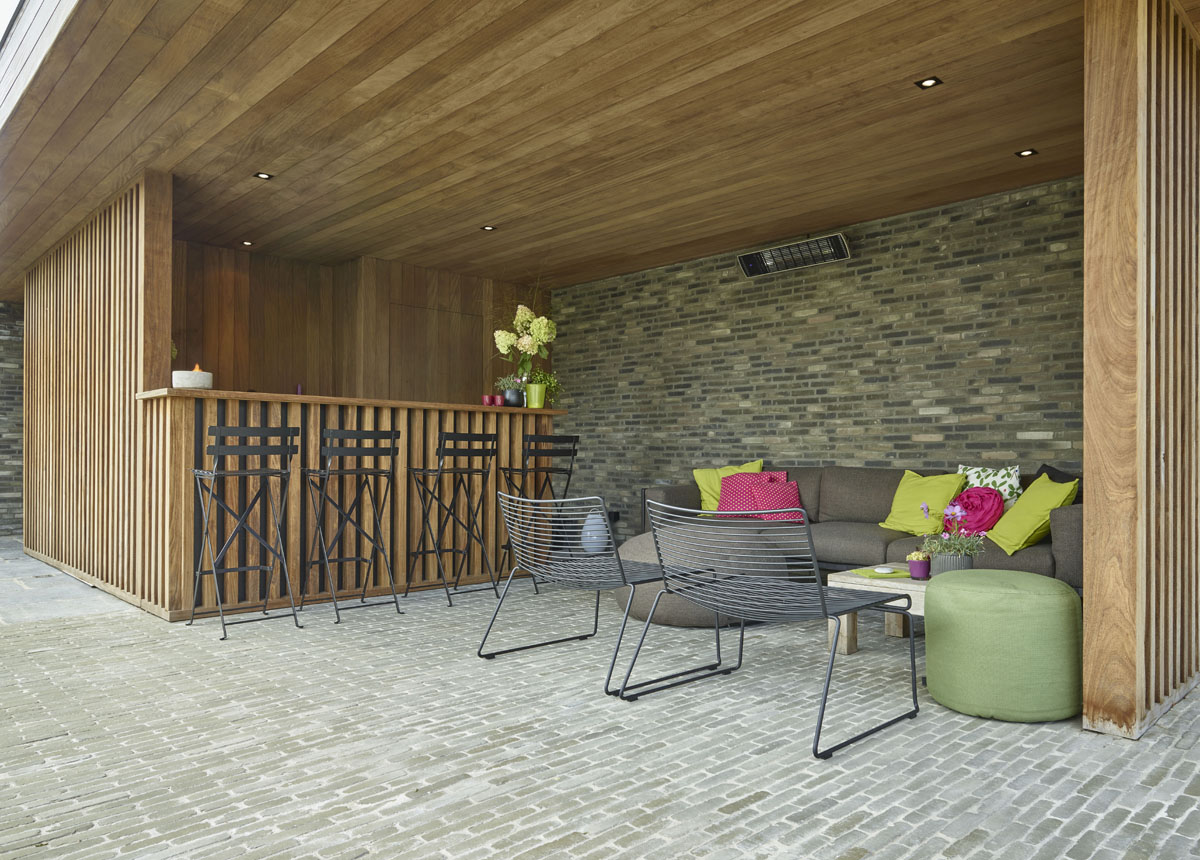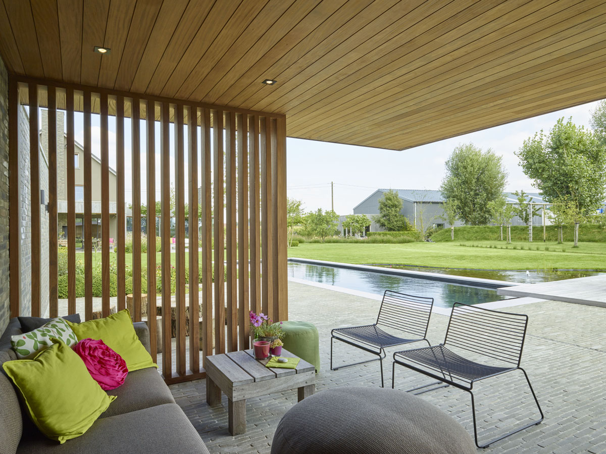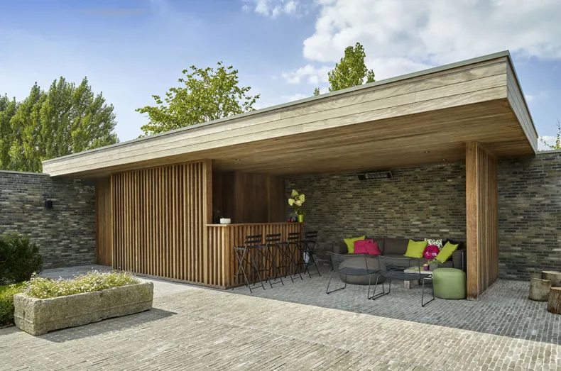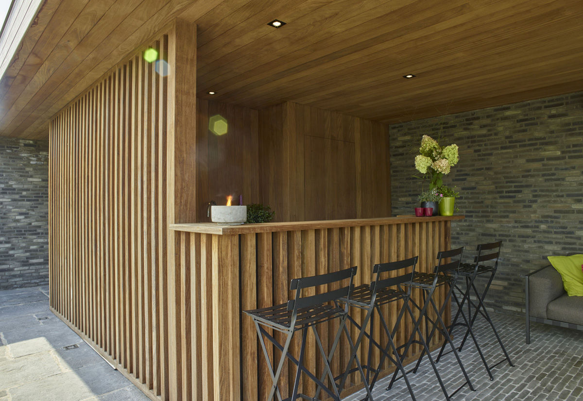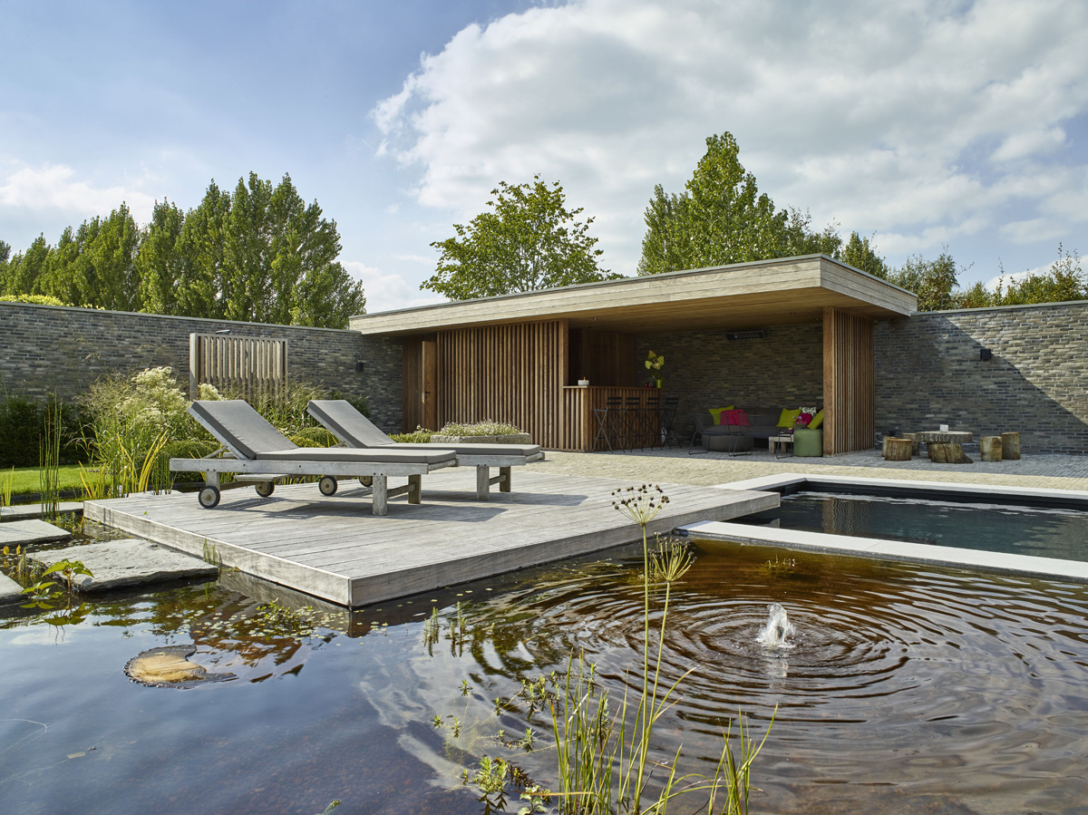 De poolhouse uitgewerkt in afrormosia is ommuurd met Miniature Zwart-grijs gevelstenen en biedt zo de bewoners optimaal comfort.