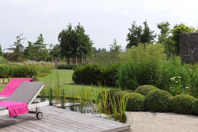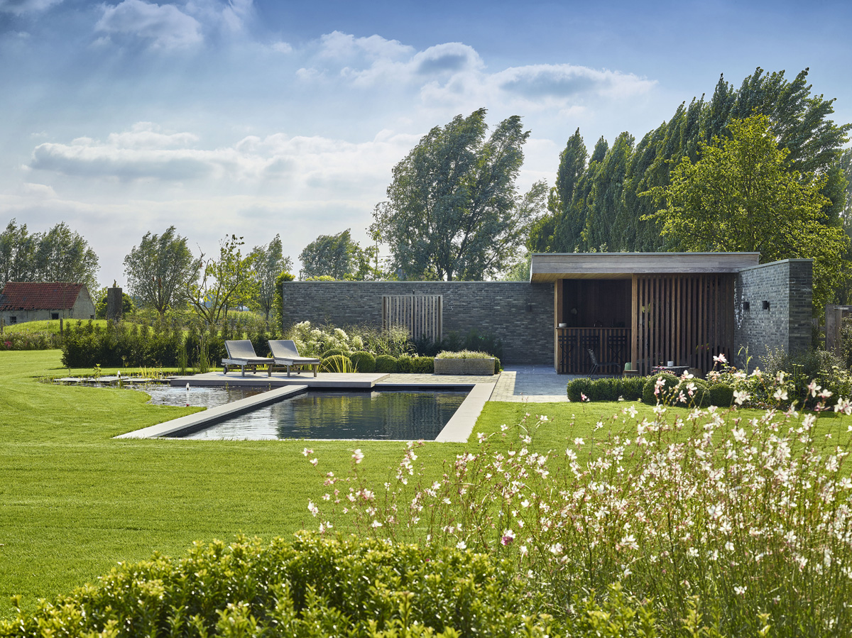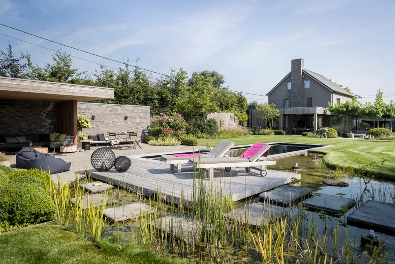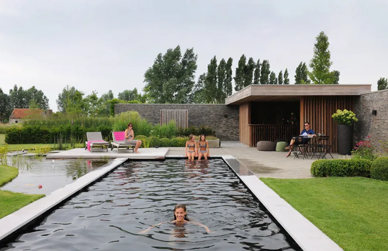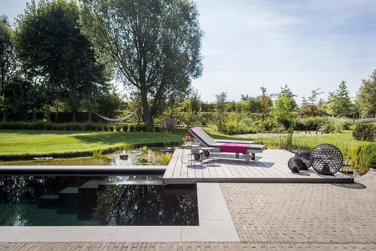 Het strak omlijnd zwembad kreeg de looks mee van een zwemvijver dankzij de donkere bodem en de overgang naar een natuurlijke waterpartij.