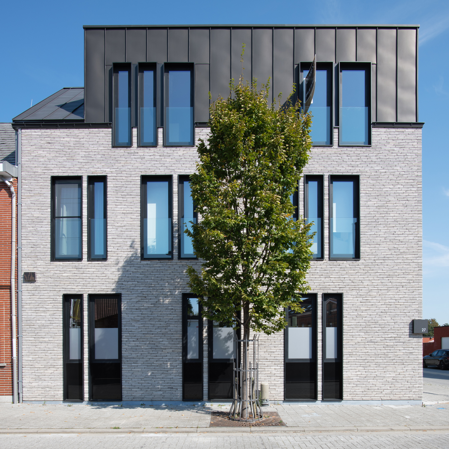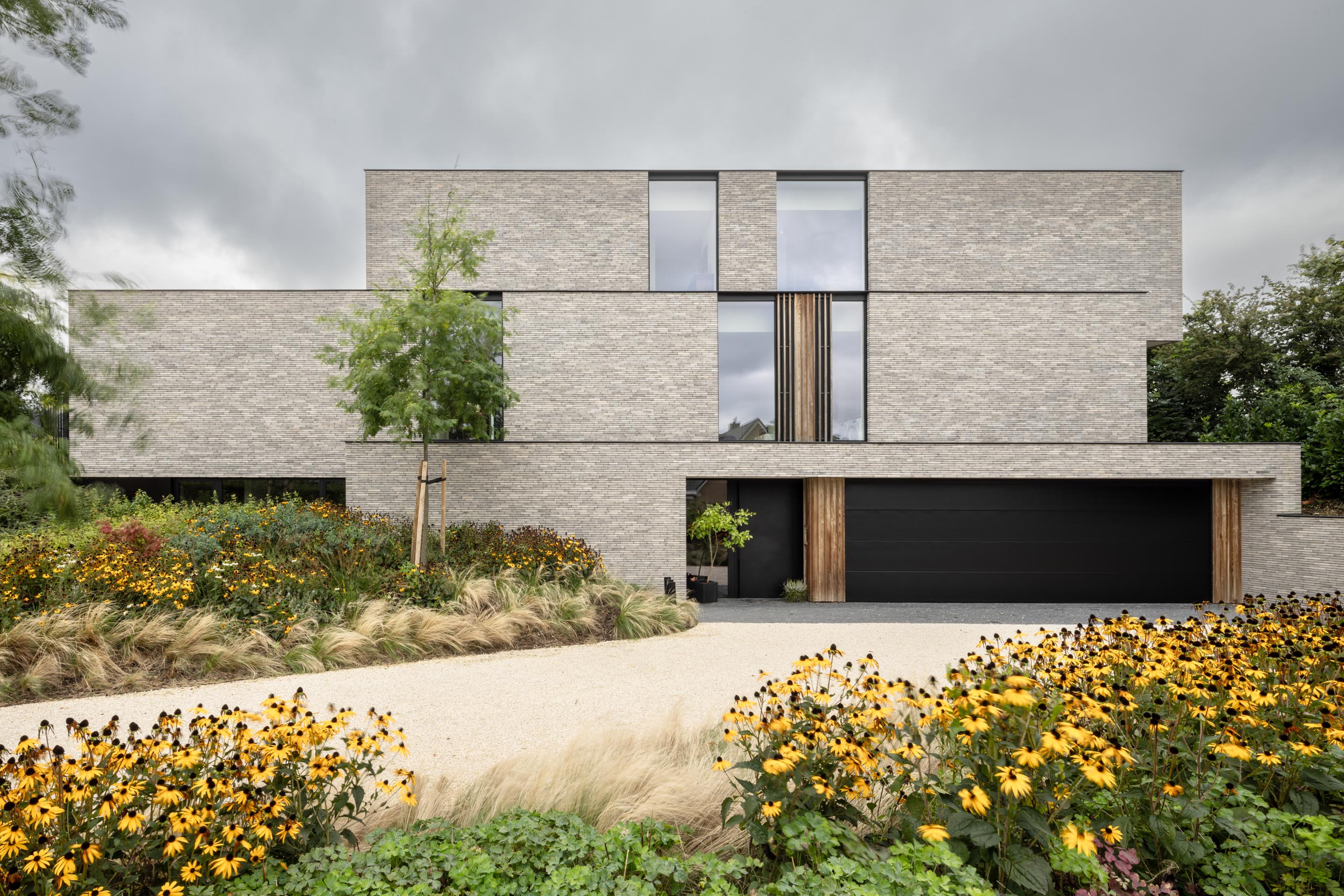 Dans un paysage pittoresque et vallonné, l'architecte Kris Van den Broeck a conçu une maison jumelée unique pour deux sœurs, un projet qui équilibre parfaitement la forme, la fonctionnalité et l'utilisation des matériaux. La maison est située sur un terrain en forte pente et s'étend sur trois étages, chacun ayant sa propre fonction. Le rez-de-chaussée, accessible depuis le niveau de la rue, comprend un spacieux garage, une cave et une maison d'amis. Le premier étage offre la première unité d'habitation avec une connexion directe au jardin, tandis que le deuxième étage offre de l'espace pour la deuxième unité d'habitation avec une terrasse sur le toit et une vue panoramique sur la nature environnante. Cette division claire donne lieu à un jeu architectural de trois volumes décalés en forme de poutres, qui glissent les uns sur les autres comme des unités séparées, formant ainsi un tout dynamique.