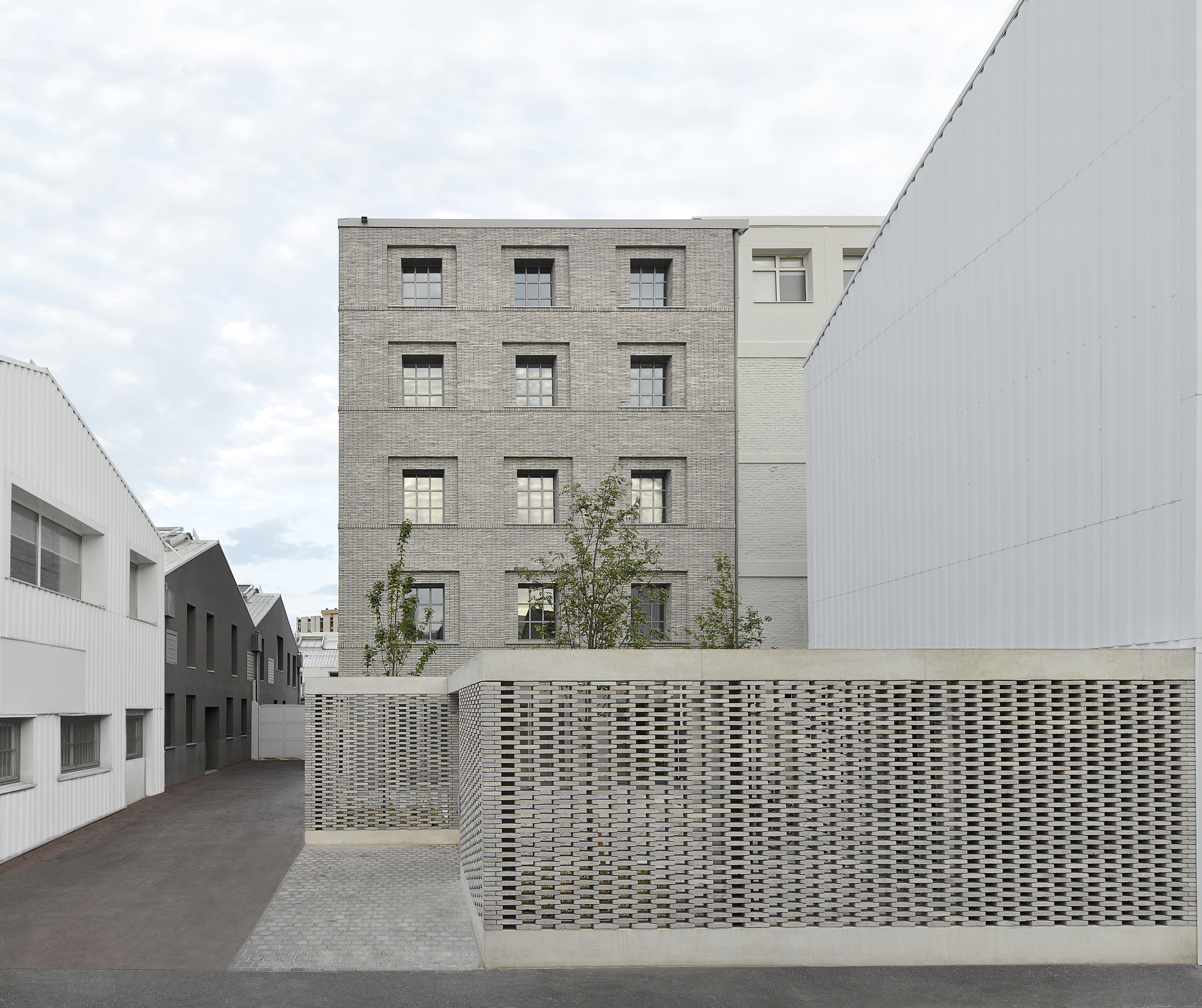 Palast architectes : « Ce projet est né d’une commande particulière : requalifier l’entrée d’un immeuble occupé par les ateliers Hermès à Pantin. Notre intervention est l’occasion de redéfinir le statut de ce délaissé urbain sous exploité en définissant ses contours.
