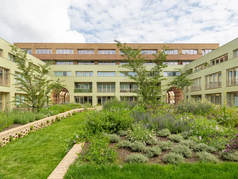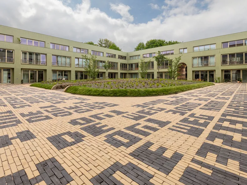 Le cœur du bâtiment est sa cour végétalisée, accessible par des portes qui se connectent aux routes informelles du quartier. Il y a des jardins communautaires dans lesquels les grands arbres existants ont été regroupés pour offrir une vue verte généreuse à la fois aux résidents du nouveau bâtiment et aux résidents des maisons adjacentes existantes. Le projet s'inscrit dans le cadre de la politique Rainproof de la ville d'Amsterdam. Des toitures vertes recueillent l'eau de pluie et l'espace public est aussi peu artificialisé que possible. En cas de stress thermique, l'abondance de verdure et les épaisses façades assureront le rafraîchissement. Les plantations sont destinées à fournir de la nourriture à la faune urbaine classique, comme les petits oiseaux chanteurs, les chauves-souris et les insectes. Des nichoirs pour les oiseaux, les martinets et les chauves-souris sont situés dans les avant-toits et les façades.