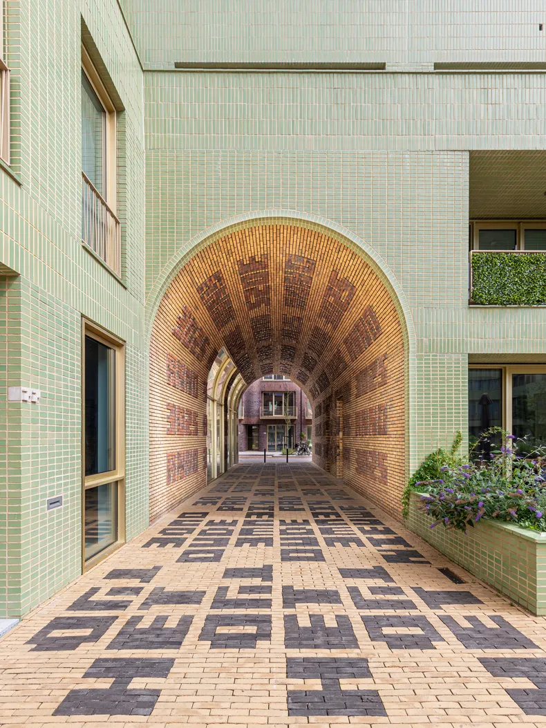 Il y a beaucoup de corps de passages dans le quartier ; je les vois comme une transgression, une porte d'une chose à une autre. Dans ces portes, j'ai voulu laisser les briques - le "pixel" de ce style architectural particulier - parler d'elles-mêmes, dans une phrase qui peut être lue de gauche à droite et de droite à gauche. Et qui, tout comme une porte, n'a ni début ni fin, car elle dépend uniquement du côté de la porte où l'on se trouve.