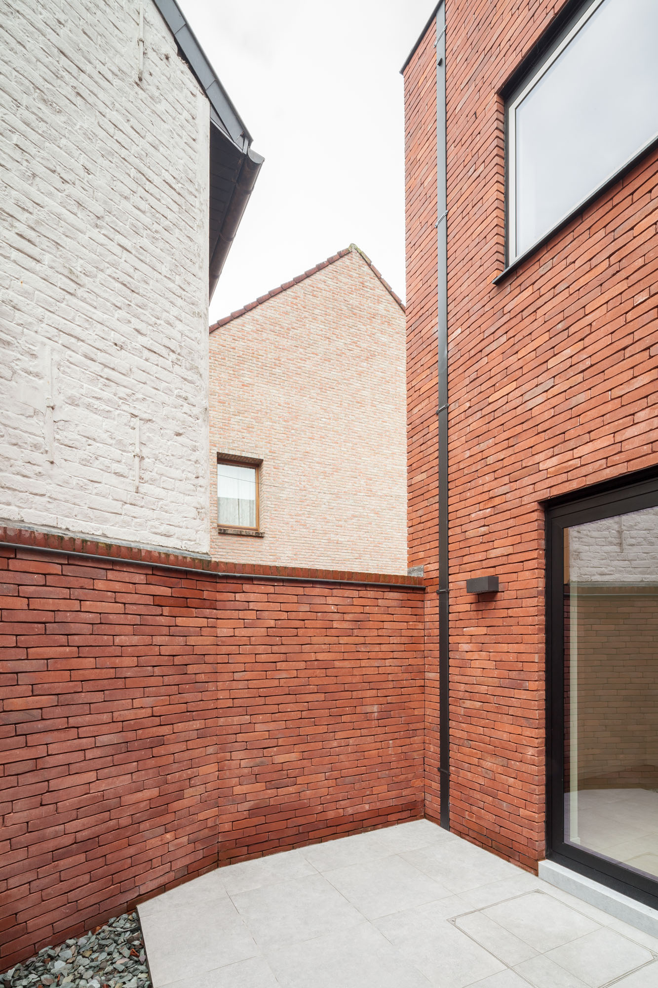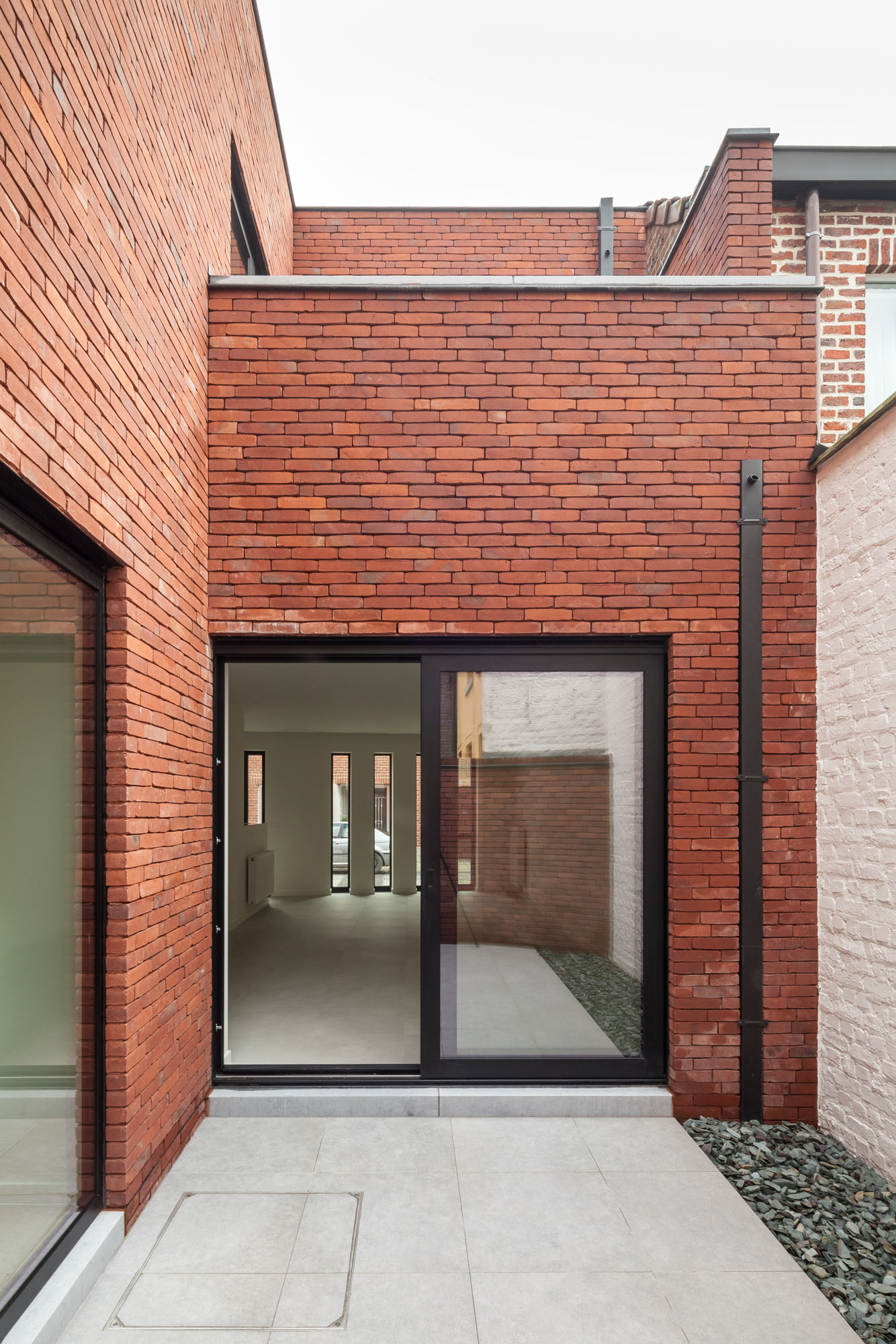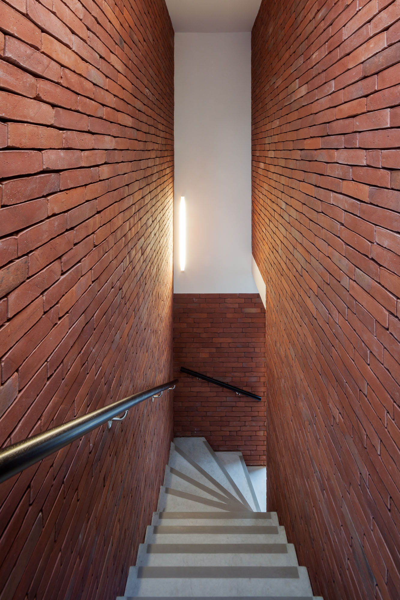 Les architectes ont réussi une parfaire intégration au contexte en utilisant une brique de teinte rouge, rappel des bâtiments du quartier et en particulier des ateliers industriels alentours. Cette brique a également été mise en œuvre dans la cage d’escalier menant à l’appartement de l’étage.
