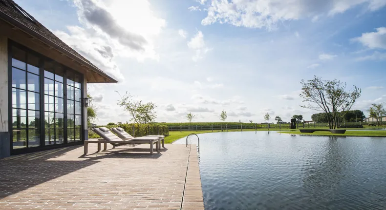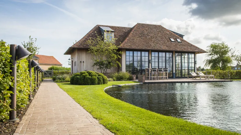 Celui-ci devait se nicher discrètement dans le paysage et intégrer une grand étang où puiser l’eau en cas d’incendie, condition indispensable pour pouvoir agrandir son entreprise. Etant donné que l’ensemble allait devenir une prouesse technique, il a été fait appel à l’entrepreneur de jardins Stijn Phlypo. Pour pouvoir mettre en œuvre de tels projets, il faut en effet une connivence parfaite entre concepteur et entrepreneur.
