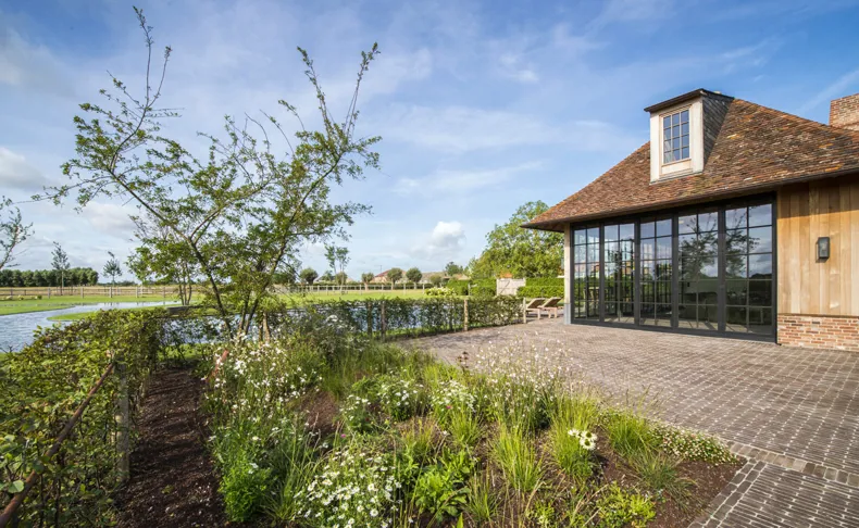 Grâce à l’intégration de nombreux éléments du paysage de polder situé à l’arrière, le jardin forme un tout avec son environnement. Ainsi, une rangée de saules têtards vieux de 80 ans a été plantée pour donner au jardin structure et caractère.