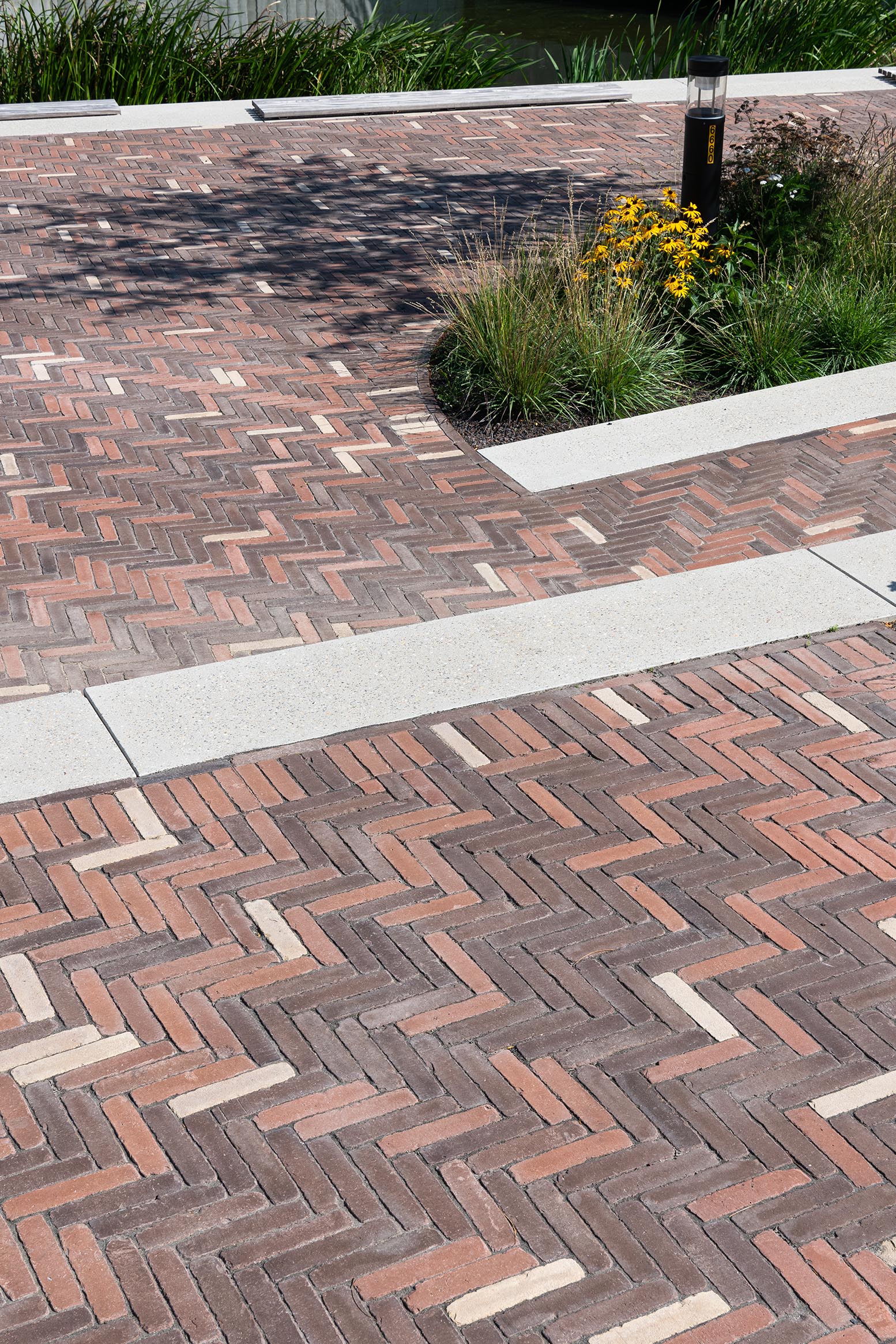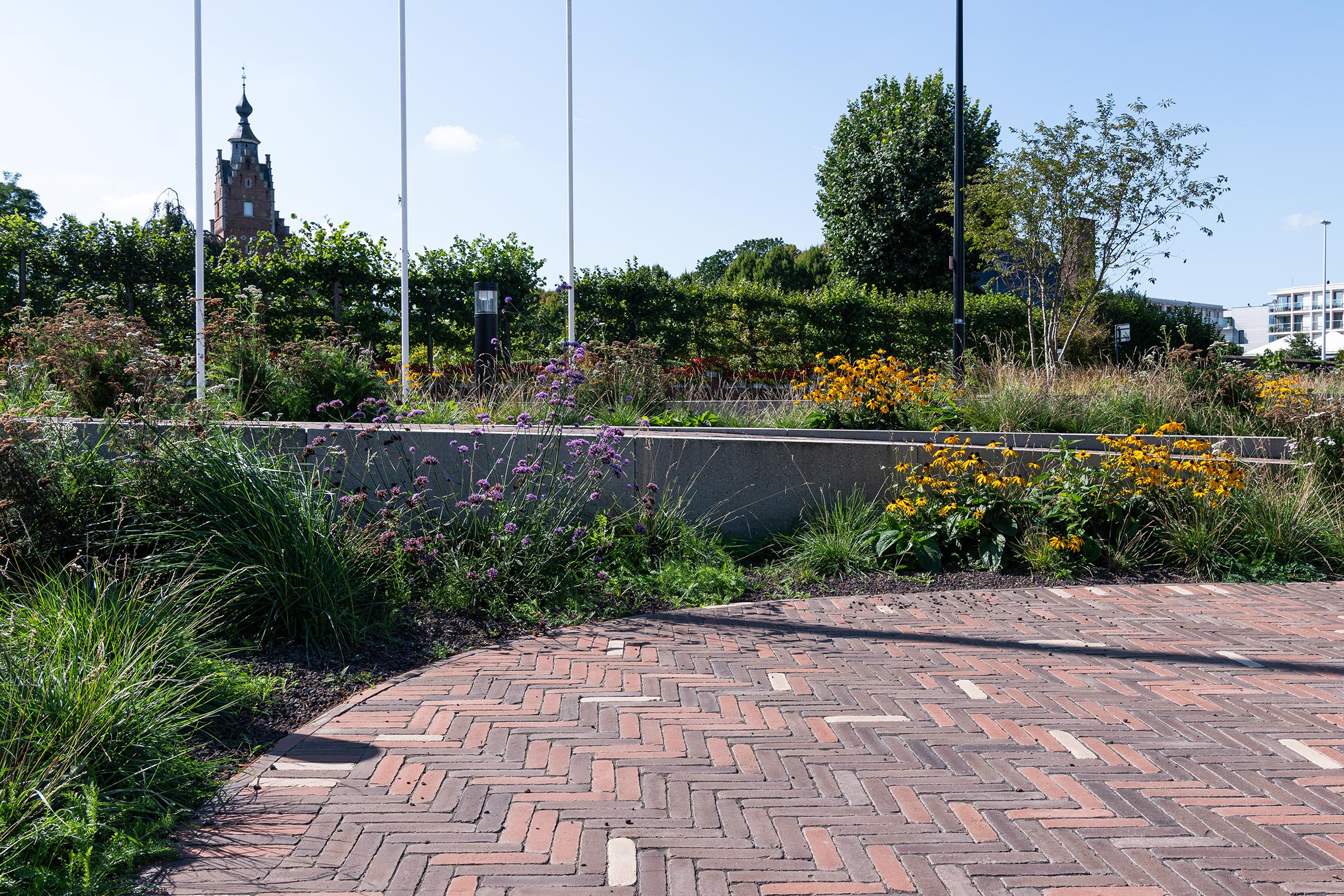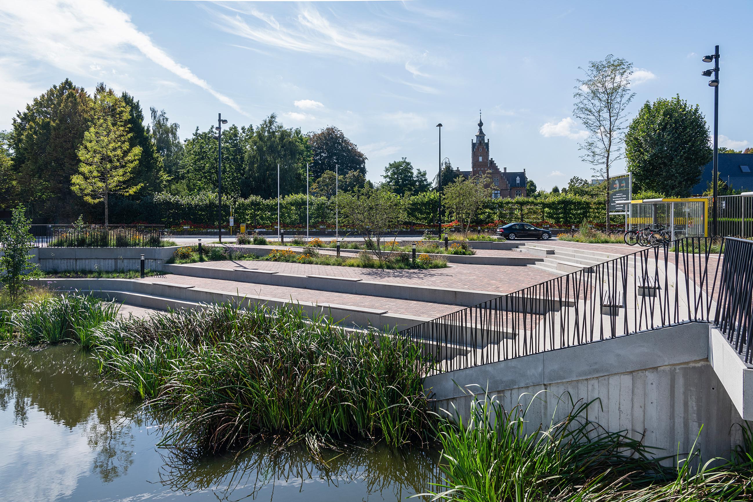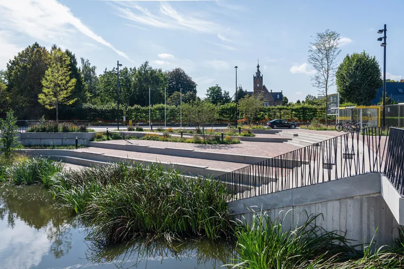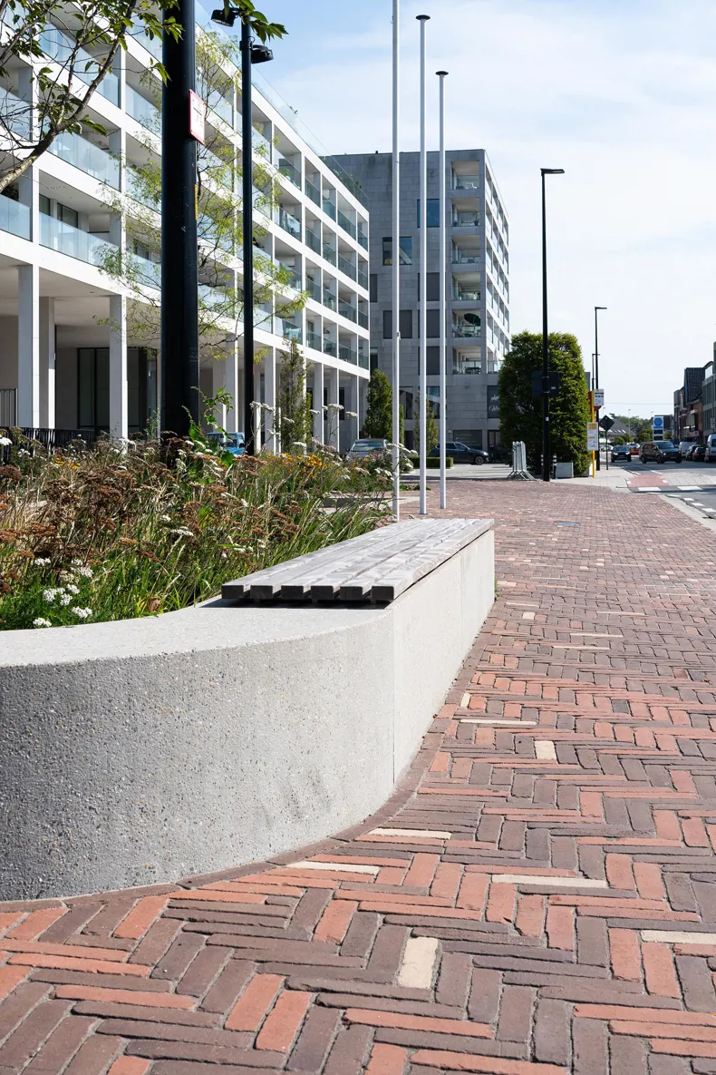 L'aménagement paysager a été abordé avec le même soin. La place étant flanquée d'immeubles de grande hauteur, un choix stratégique a été fait en matière de plantation : de grands arbres sur les bords assurent une structure verticale et de l'ombre, tandis que dans la partie centrale, des arbustes à plusieurs troncs et des plantations basses renforcent la stratification du paysage à chaque marche. Cet aménagement végétal s'adapte de manière flexible aux variations du niveau d'eau du Gaverbeek, ce qui est non seulement écologique, mais aussi visuellement intéressant.