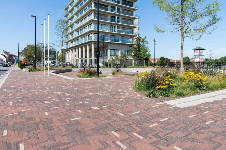 Les pavés en terre cuite SeptimA contribuent non seulement à l'identité visuelle de la place, mais ils offrent également une finition durable, facile d'entretien et intemporelle. Leur caractère robuste s'harmonise avec les matériaux solides des escaliers, tandis que les nuances de couleurs créent une harmonie avec la végétation environnante. De plus, les pavés en terre cuite sont un choix naturellement écologique : ils sont fabriqués à partir de matières premières naturelles, ont une durée de vie exceptionnellement longue et conservent leur qualité esthétique pendant des décennies, même en cas d'utilisation intensive. Le pavé SeptimA choisi, au format ECO-7, renforce ce caractère durable. Grâce à leur format compact, ils contribuent à une utilisation plus efficace des matières premières et à un impact environnemental réduit, ce qui en fait un choix judicieux dans tout aménagement paysager contemporain.