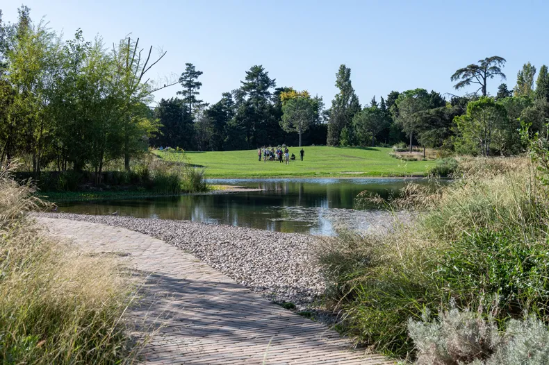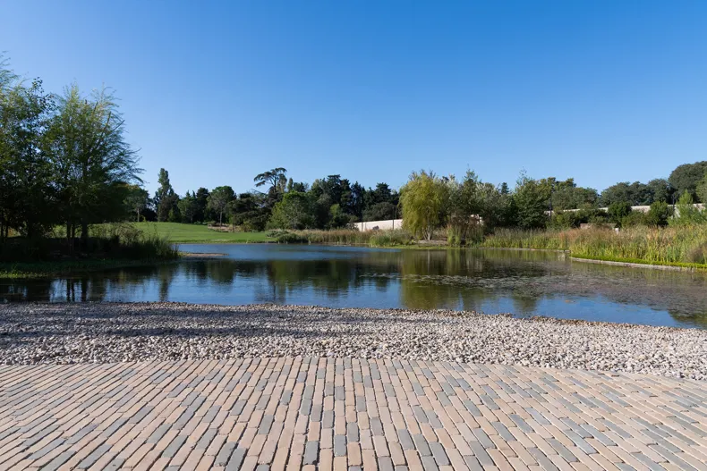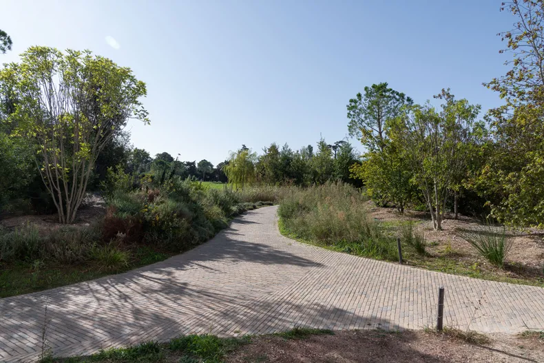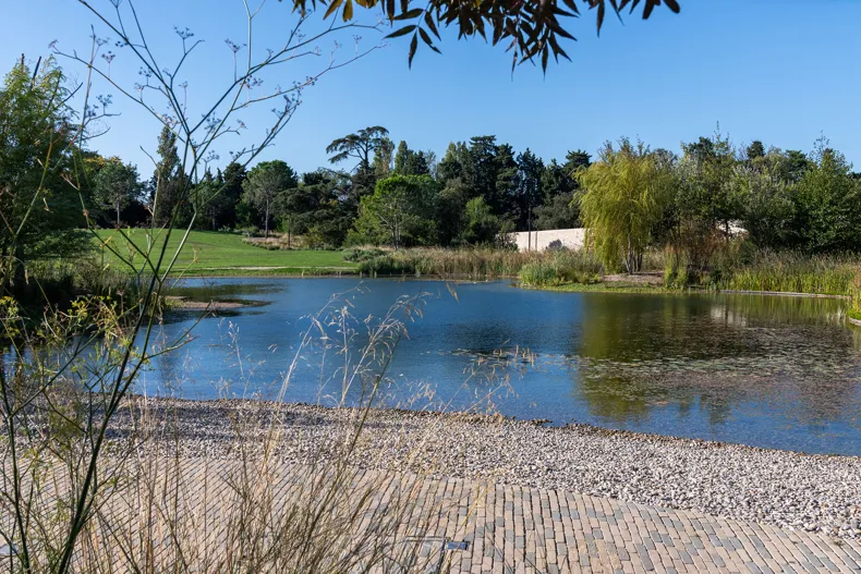 La croissance de la végétation est rendue possible par un système de circulation d’eau durable qui puise sa source dans le Canal de Craponne, situé à proximité du parc. Le large étang sert à la fois de réservoir d’eau pour l’irrigation et de dispositif de refroidissement pendant les chaudes journées d’été. L’étang, ainsi que la nouvelle topographie et sa végétation, produisent un microclimat, transformant efficacement le désert de béton en un parc public foisonnant.