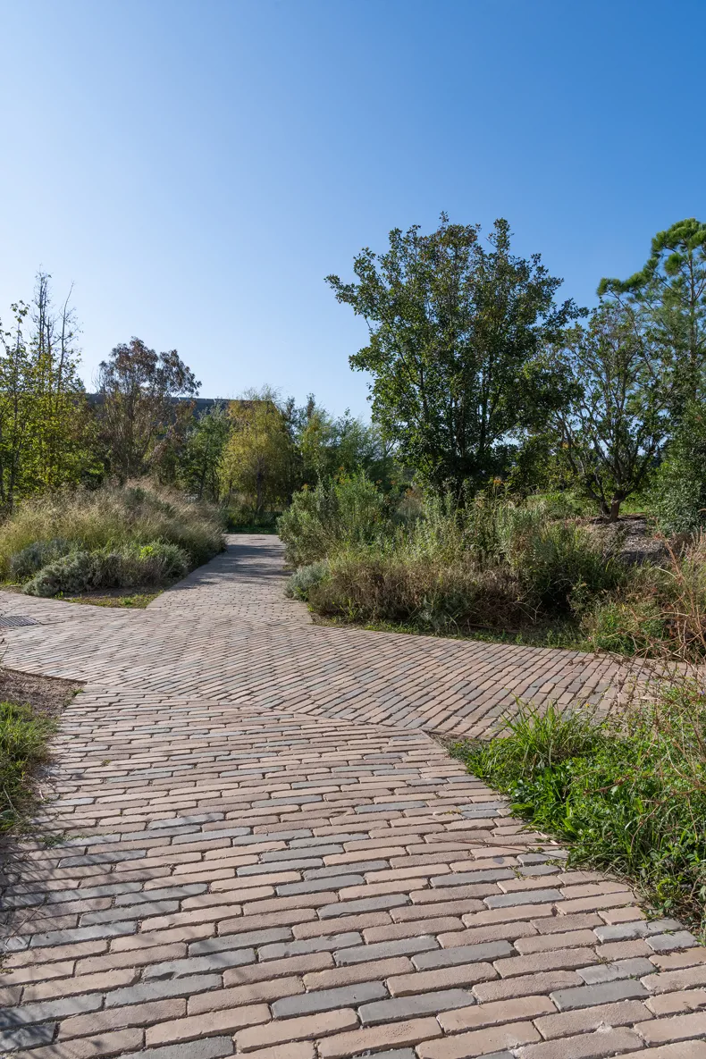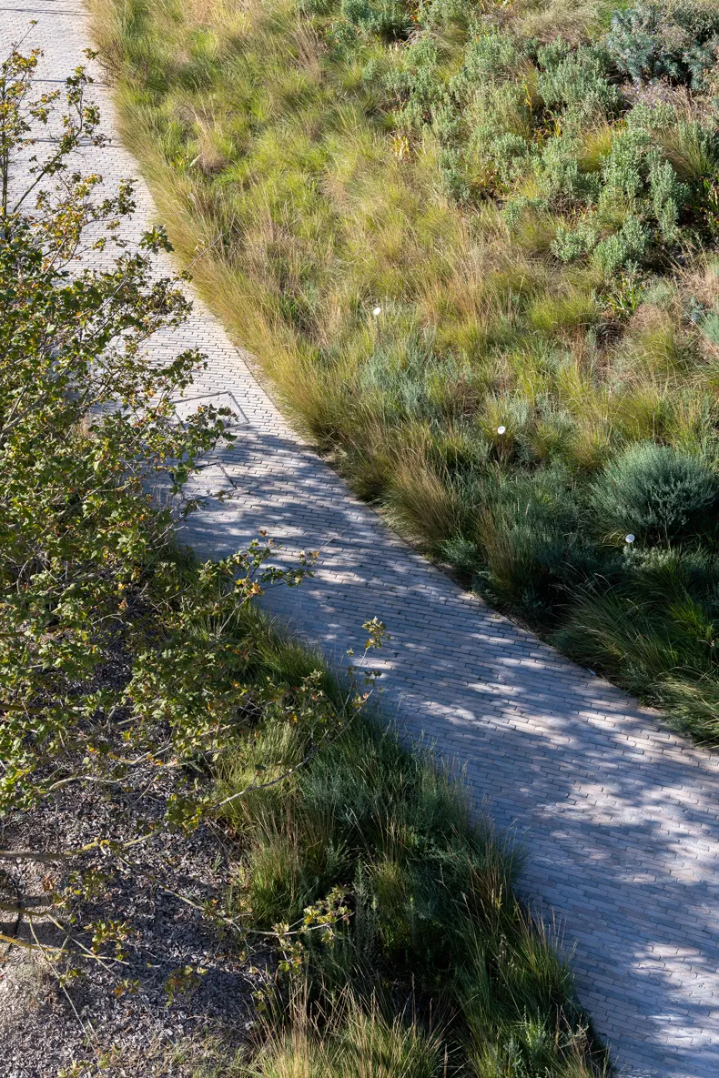 Les visiteurs peuvent se promener d'un bâtiment à l'autre dans cet environnement inspirant en empruntant les chemins organiques pavés de terre cuite. Pour la création de ces chemins, le choix s'est porté sur le pavé en terre cuite SeptimA de format ECO-7-SIZE en trois couleurs différentes. Un mélange spécifique a ainsi été créé pour ce projet. Chaque couleur est liée à un aspect particulier du parc. Le gris représente l'acier inoxydable de la tour, le jaune représente le revêtement en pierre naturelle de la tour et la couleur gris-jaune plus claire fait référence au gravier du parc. En mélangeant ces couleurs, les pavés s'harmonisent avec le projet et créent une cohérence dans l'ensemble du parc.