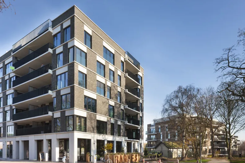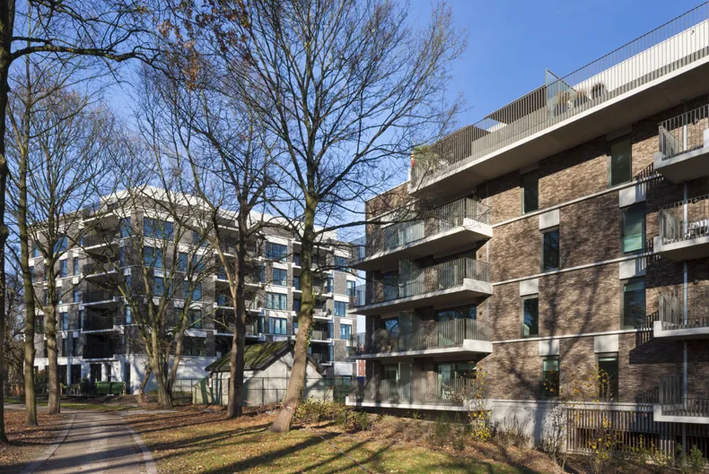 Ils sont reliés entre eux par une large allée piétonne, réalisée avec des pavés en terre cuite de couleur anthracite de Vande Moortel, et sous laquelle se trouve un vaste garage souterrain. Les abords sont conçus comme un parc, donnant au projet une connexion parfaite avec les fortifications vertes environnantes.