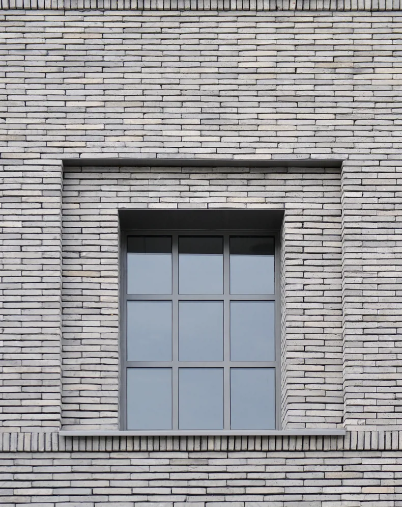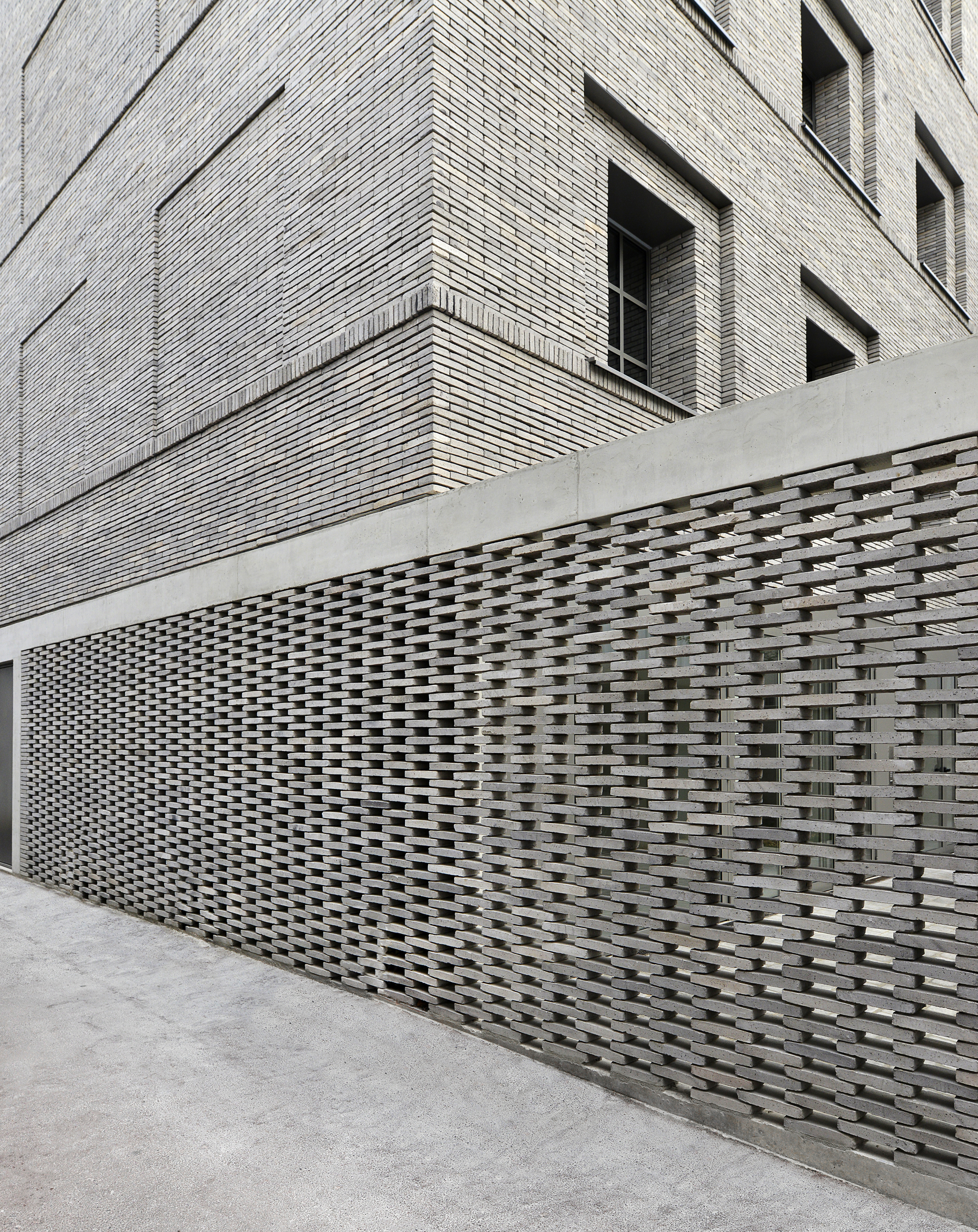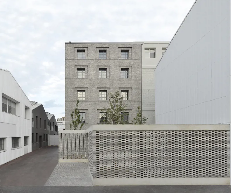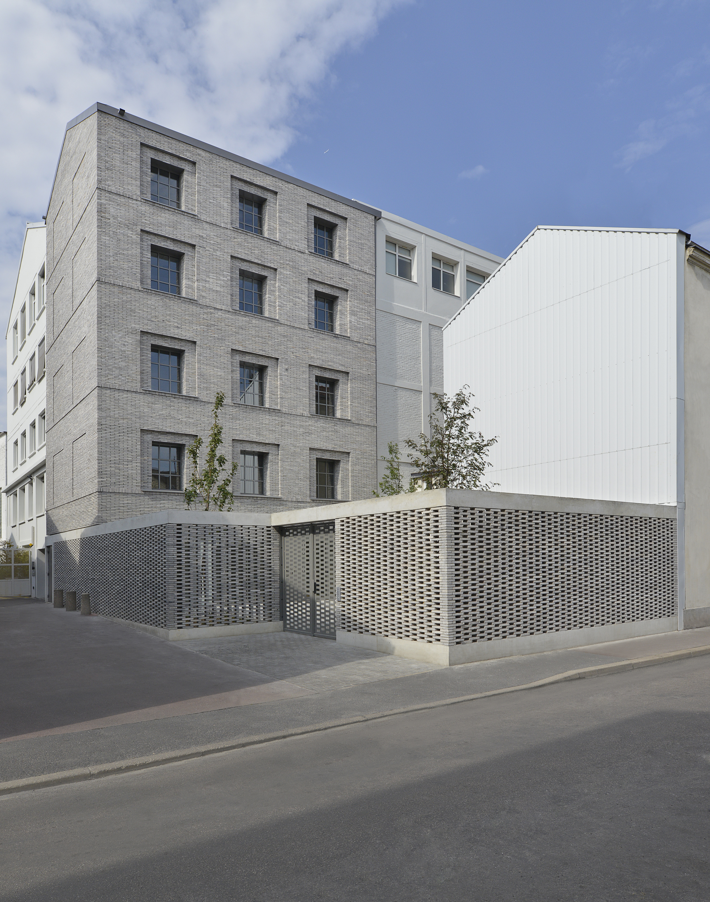 Nous avons pris le parti d’une clôture en moucharabieh de brique permettant ainsi de conserver la porosité visuelle depuis la rue Lesault tout en intégrant les locaux vélos et ordure ménagère de l’immeuble. La brique se linea 7035 prolonge sur la façade du bâtiment d’entrée avec un jeu de modénature et d’appareillage dialoguant avec le parvis. »