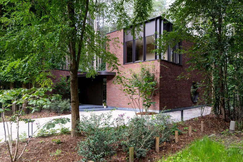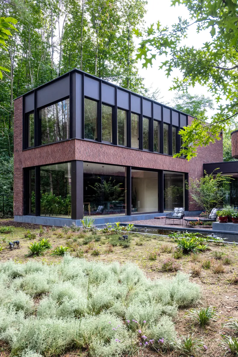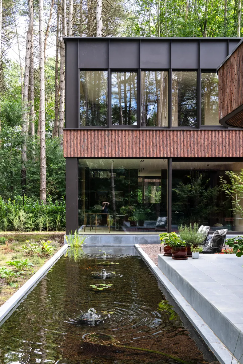 La maison se situe dans le décor verdoyant d'une vaste zone boisée. Cette proximité avec la nature a été considérée dès le départ comme une source d'inspiration essentielle. Les habitants souhaitaient une maison qui établisse un lien indéniable avec le paysage, sans pour autant sacrifier l'expression personnelle. La réponse à cette ambition se trouve dans une structure en U s’articulant autour d'un patio central. Ce jardin intérieur avec une pièce d'eau constitue non seulement le cœur visuel et fonctionnel de la maison, mais sert également d'espace de transition serein entre l'intérieur et la forêt environnante.