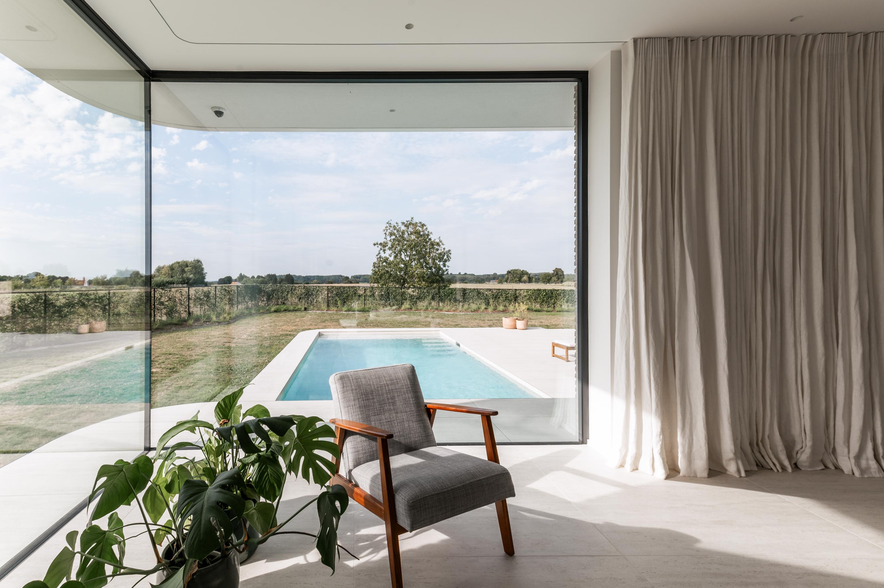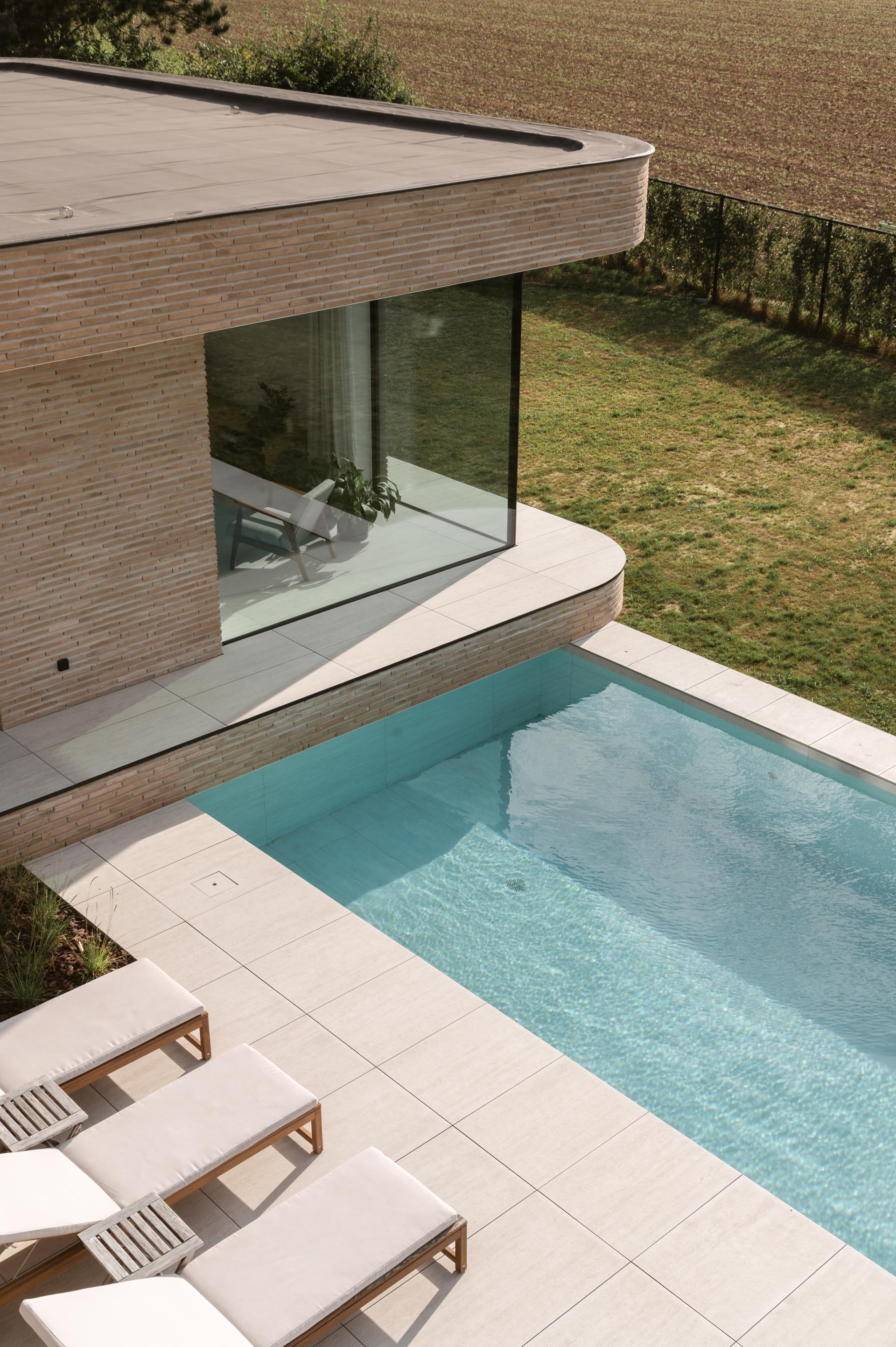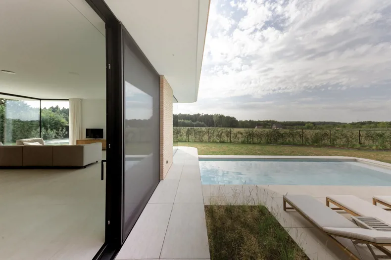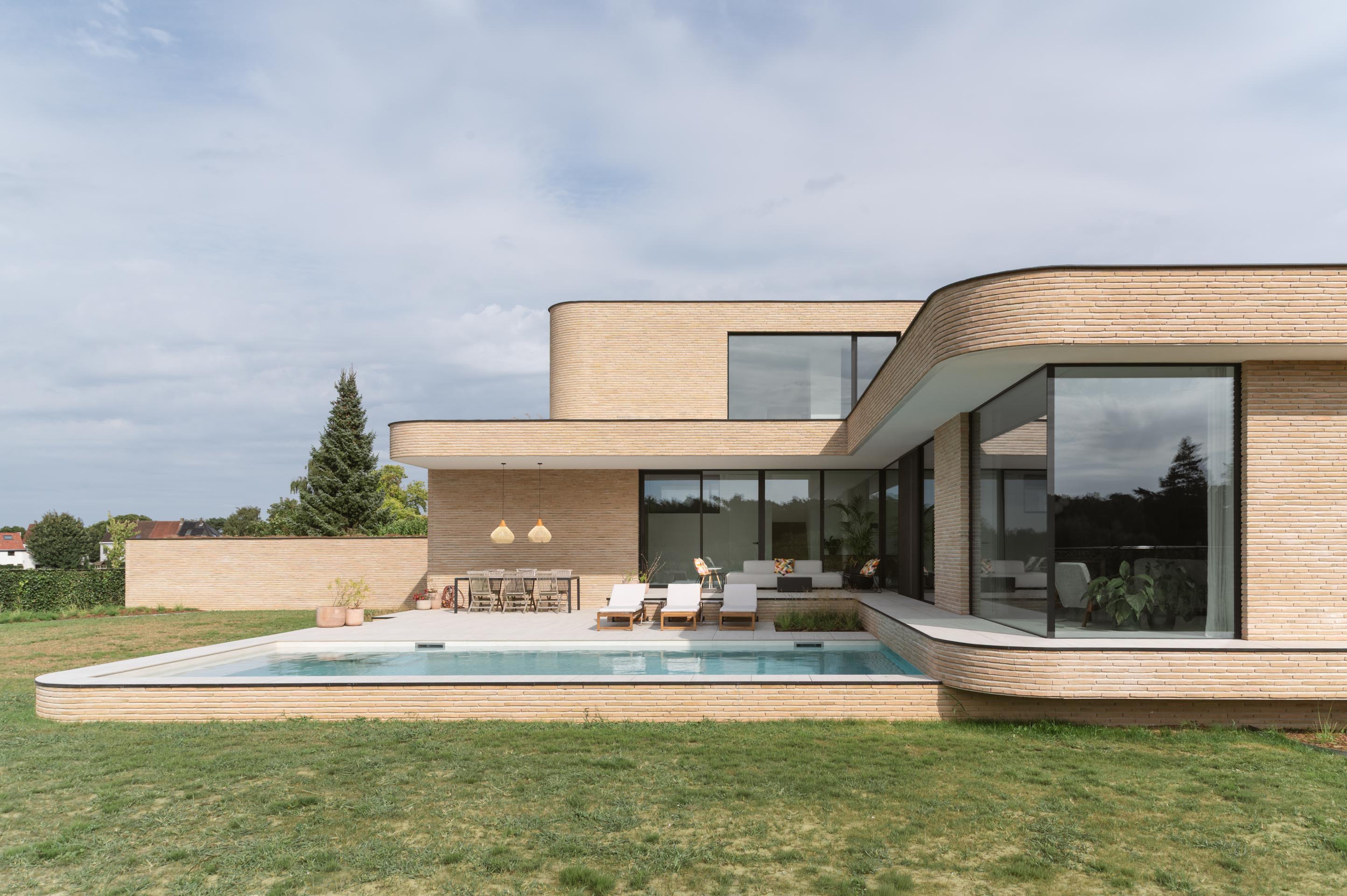 Une villa en briques claires avec piscine et terrasse à différents niveaux, à deux pas de Bruxelles: cette maison est vraiment remarquable. Il fallait bien cela pour répondre à la demande. La parcelle est entourée par deux sentiers pédestres. Ainsi, c'est précisément le magnifique environnement naturel qui menace l'intimité des habitants. En utilisant intelligemment les importants dénivelés du terrain et en jouant sur les niveaux de construction, cet inconvénient devient le moteur d'un projet extraordinaire.