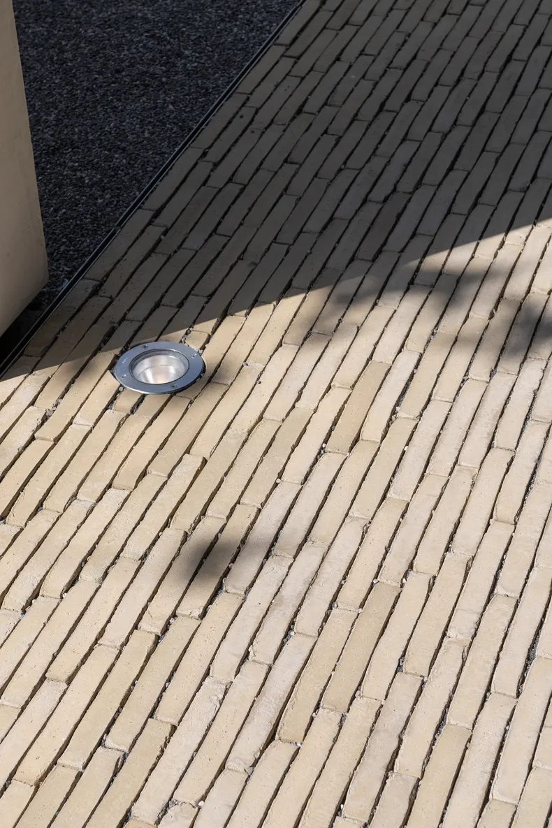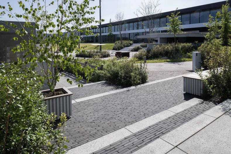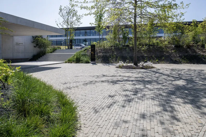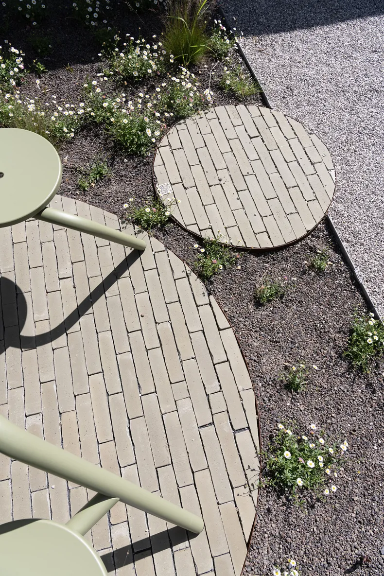 Un autre pavé en terre cuite joue un rôle crucial dans le revêtement perméable du parking extérieur. Le SeptimA Olive y a été utilisé selon le principe du H2O Natural Clay Paving. Ce parking est accessible au visiteur lorsqu'il pénètre sur le site depuis la zone industrielle. Il a immédiatement l'impression d'être dans un autre monde. Il se trouve au point le plus bas et ressent un fort sentiment d'isolement. Après s'être garé – on peut aussi se garer sous le bâtiment par mauvais temps – il traverse le pavillon d'accueil jusqu'à l'entrée principale. Il passe par la place centrale, qui est dédiée aux événements de réseautage et aux conférences pour les professionnels de l'architecture des jardins et des paysages. Cette « Plaza » incarne la cour intérieure d'un hôtel-boutique.