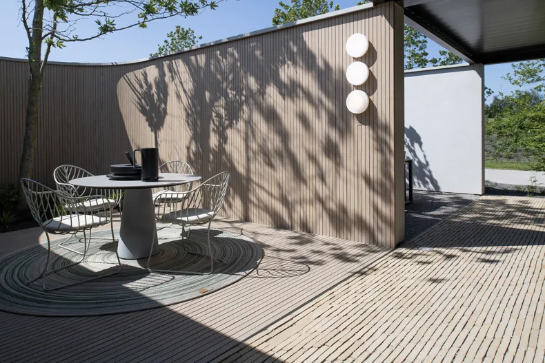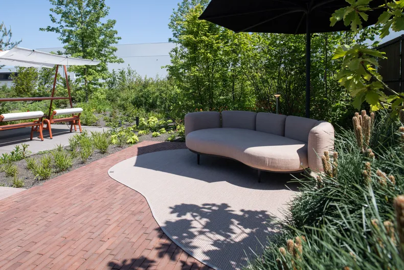 Ainsi, outre la Plaza, on peut découvrir le « Pavillion », le « Lounge » et l' « Eden ». Ces jardins arborent les pavés en terre cuite Elegantia Titane et Ancienne Belgique Gris perle. Le jardin d’exposition « City » montre comment décorer un petit jardin de ville de manière créative. Le contraste noir et blanc entre le SeptimA Graphite et les murs de jardin enduits de blanc qui l'entourent est très élégant. De son côté, l'Elegantia Vanille s'harmonise très bien avec le bois dur tropical et, grâce à son format étroit et à sa couleur jaune clair, crée une agréable sensation d'espace ouvert. Dans un autre compartiment de « City », le SeptimA Sauge est mis en œuvre de manière ludique en cercle, ce qui en fait un socle idéal pour le banc assorti d'Extremis.