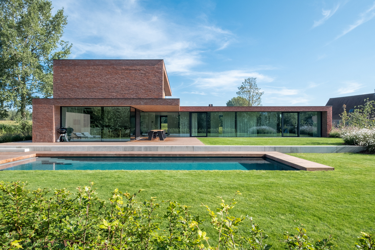 CAS, qui a l'expérience des projets situés hors zone, a insisté dès le départ sur une architecture contemporaine. Mais en respectant l'environnement naturel. Pieter-Jan Leenknecht, CAS : « Une conception basée sur les lois de la nature implique que la forme et la matérialité d'une maison ne peuvent être en opposition avec la nature. Un volume en crépi blanc aurait été inapproprié à cet endroit. Nous avons recherché une palette de matériaux équilibrée, composée de matériaux naturels. Nous sommes rapidement arrivés à une combinaison de béton, de bois et de brique. Les grandes fenêtres maintiennent la sveltesse de l'ensemble et font entrer la nature à l'avant et à l'arrière. Pour soutenir la sobriété de l'architecture et permettre en même temps au bâtiment de se fondre dans la nature, nous avons opté pour une brique mince de couleur brun-rouge. Linea 3011 n'est pas une brique ordinaire mais une brique fine, sablée, nuancée. Nous ne l'avons pas jointoyée de manière traditionnelle, mais avons utilisé une maçonnerie à joint mince dans un appareillage aléatoire. Grâce au mortier gris foncé appliqué en retrait, chaque brique est mise en avant. De cette façon, nous avons pu accentuer encore mieux le jeu de lignes de l'architecture à travers la maçonnerie. »