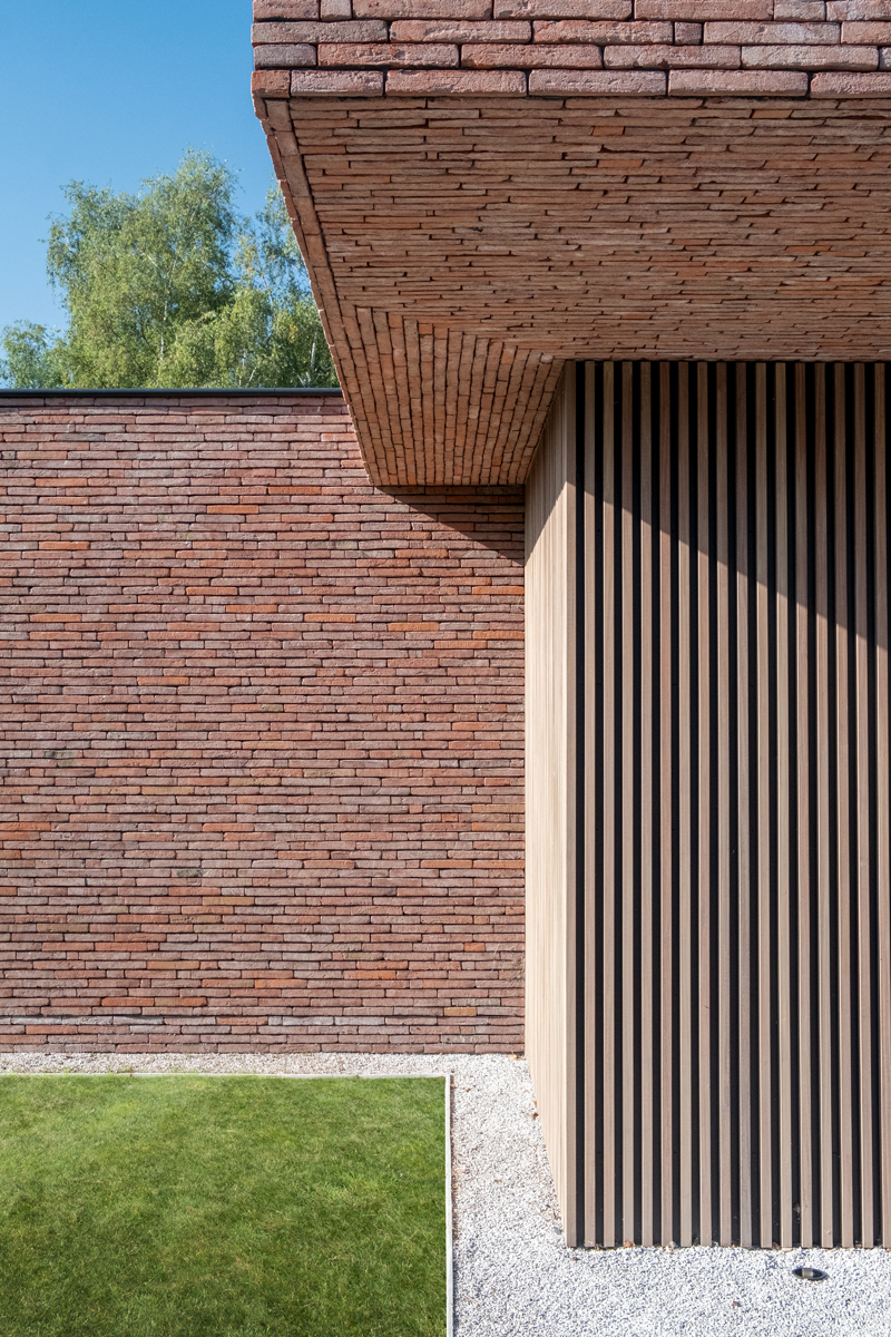 Afin de permettre à l'architecture de s’exprimer à travers la matérialité, CAS a décidé d'étendre le langage formel de manière cohérente dans toute la maison. Des plaquettes de Linea 3011 ont ainsi été réalisées et placées sur la face inférieure des surplombs. « Les plaquettes de parement permettent de réaliser de fins détails. En habillant les parties couvertes avec un seul et même matériau, on accentue la volumétrie. Et en les appliquant de façon aléatoire, on n'obtient pas un joint nuancé. Il en aurait résultéune ligne visuellement droite avec l'auvent en ligne droite et l'auvent perpendiculaire. Tous les volumes sont maintenant joliment imbriqués. Et le souci du détail est présent, comme dans le cas des colonnes de la façade. Ainsi, la brique de parement affiche tous ses atouts et souligne ainsi la puissance de l'architecture. »