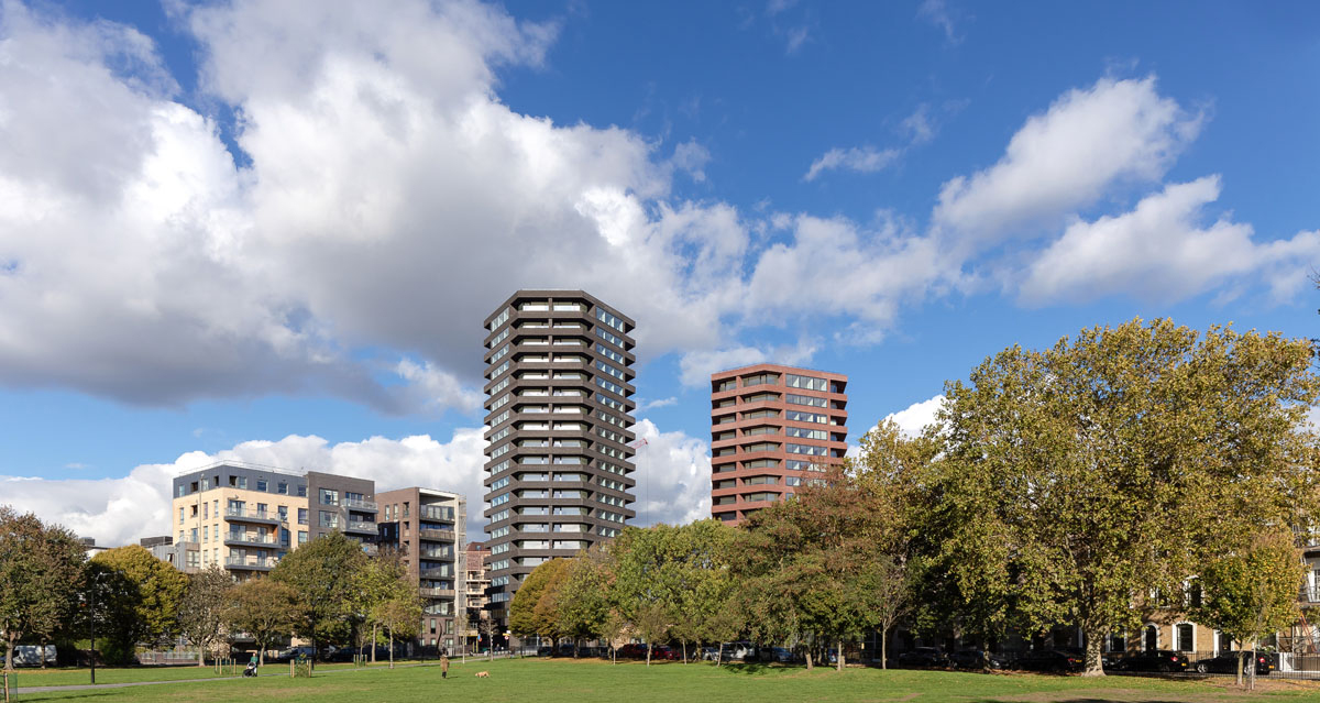 Hoxton Press op het Colville-domein, een woonproject in Hackney, het oosten van Londen, werd ontworpen door de wereldberoemde architecten David Chipperfield Architects en Karakusevic Carson Architects.
