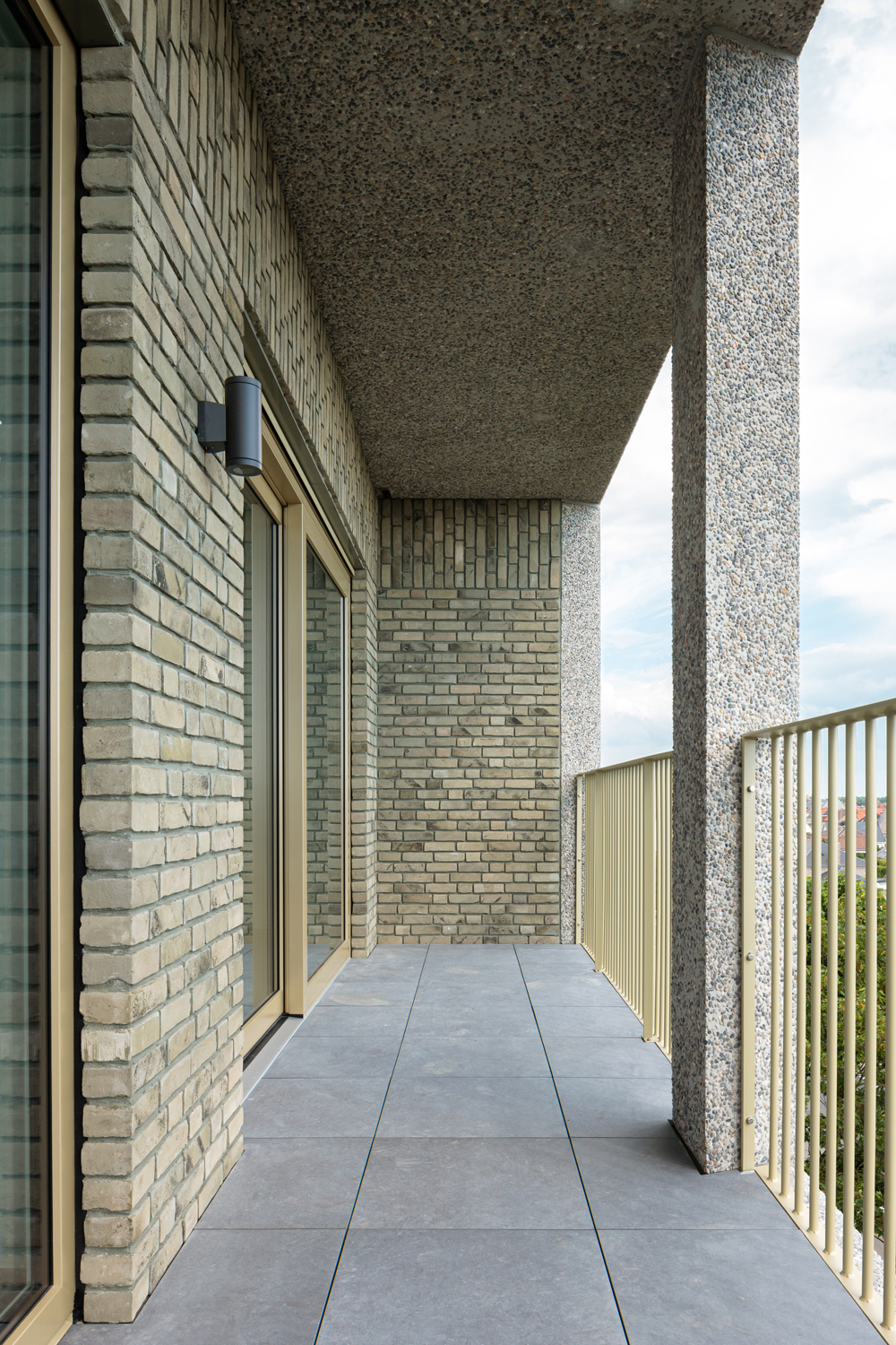 In een woonbuurt in het Vlaamse Oostende nabij de kust staat woongebouw De Boeg met negentien appartementen voor ouderen. Het ademt de Noordzee met zijn grijsgroene gemetselde stenen binnen een frame van gewassen beton.