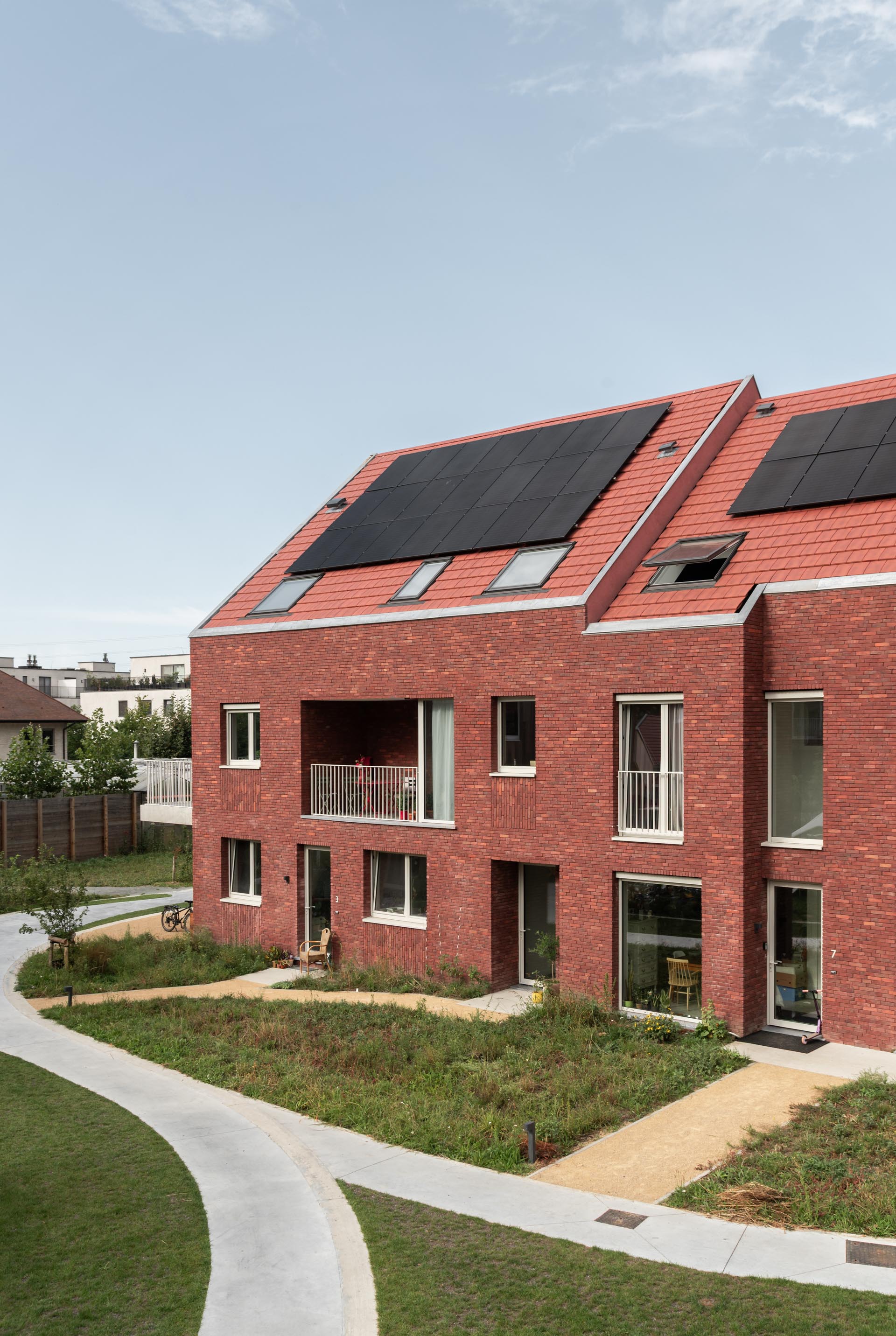Aan de rand van Gent, op het terrein van een voormalige serre in Merelbeke, verrees het ambitieus ecologisch cohousingproject BloM. In dit kleinschalig dorp midden in het groen aan het Liedemeerspark gaan duurzaamheid, collectiviteit en architecturale verfijning hand in hand. De ontwikkeling van Cohousing Projects, uitgewerkt door Groep 3 architecten, omvat 23 wooneenheden, waarvan 13 grondgebonden woningen en 10 appartementen, gegroepeerd rond een royale collectieve tuin van 5.400 m². Bij 3 van de 10 appartementen gaat het om een ‘stapelwoning’, een duplex die als een puzzelstuk in de woningen naast en onder hen passen.