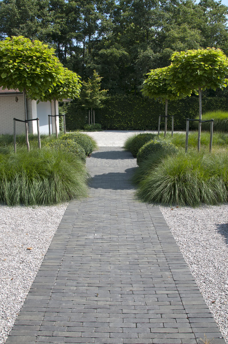 Voor de aanleg van tuinpaden zonder verkeersbelasting volstaat een funderingsdikte van min. 10 cm.