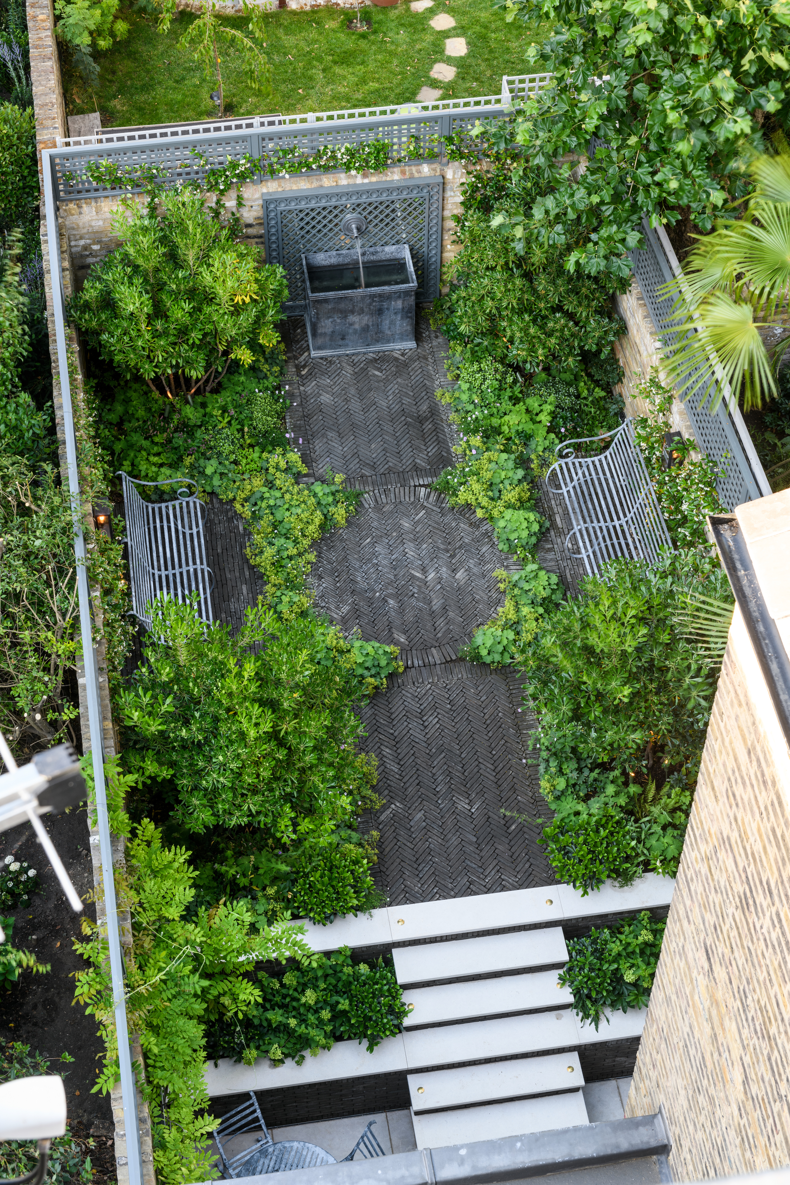 Stefano Marinaz: “Onze heraanleg van de grote, op het westen gerichte tuin van dit prachtige Georgiaanse gebouw in South Kensington sloot aan op de volledige restauratie van het huis door de Londense architecten MWAI en aannemer Taramelli, die projecten uitvoert over de hele wereld.