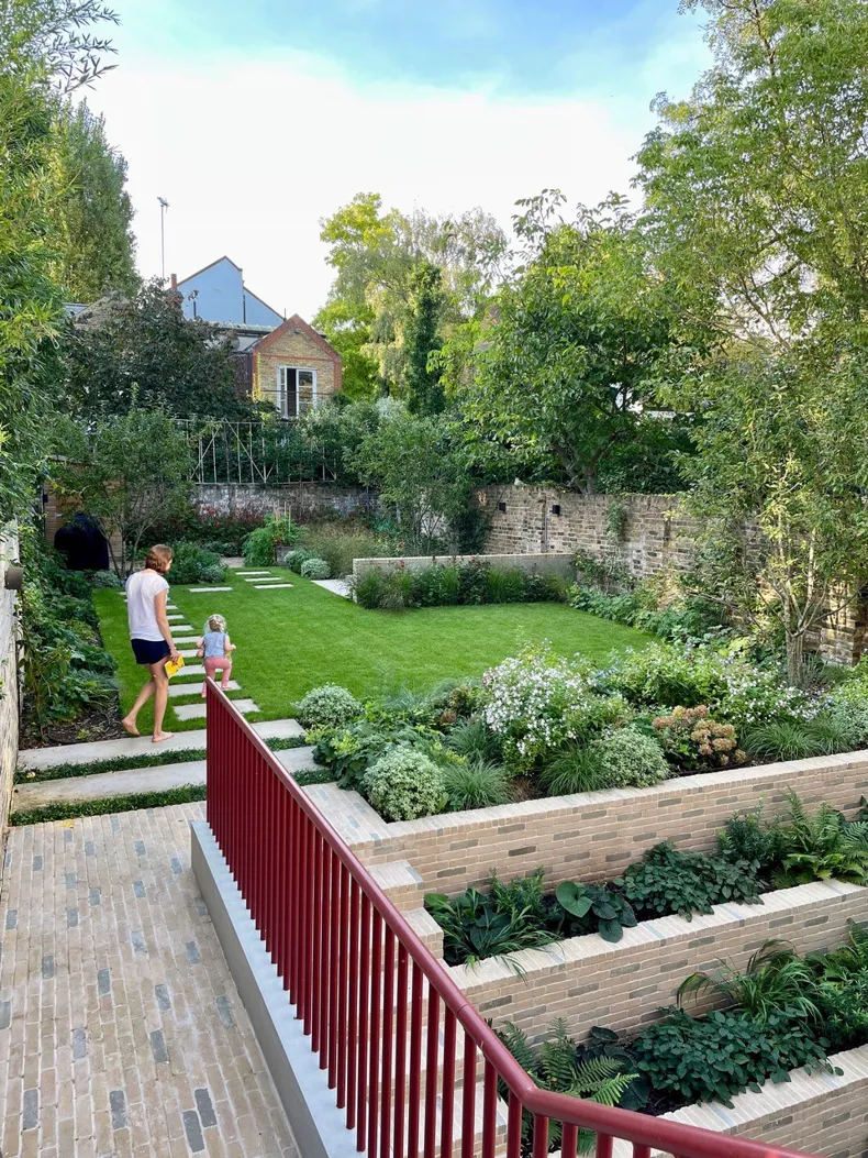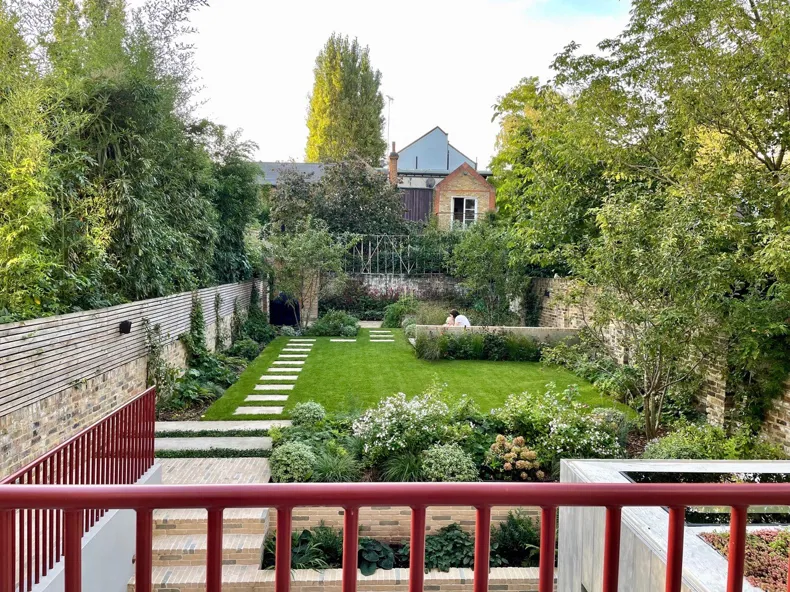 Deze prachtig ontworpen woontuin in Belsize Park in Londen is een balans tussen functionaliteit, esthetiek en ecologische duurzaamheid. De tuin, die bijna twee meter boven de benedenverdieping en meer dan een meter onder de verhoogde begane grond van het huis ligt, vormde een unieke ontwerpuitdaging. Het project vereiste de integratie van een gazon voor de jonge kinderen van de klant, een zithoek in het zonnigste deel van de tuin, een groentebed, voldoende opslagruimte en weelderige beplanting.