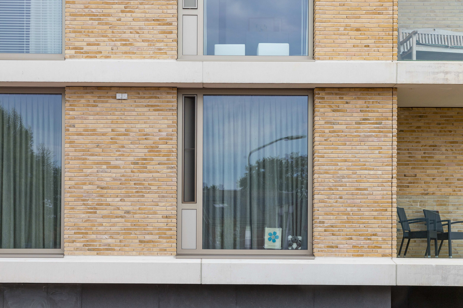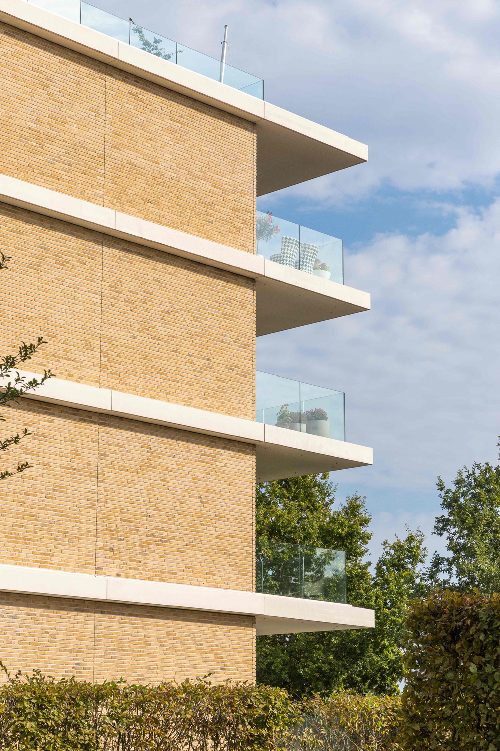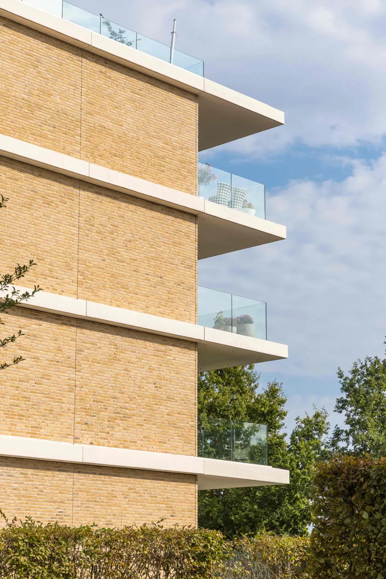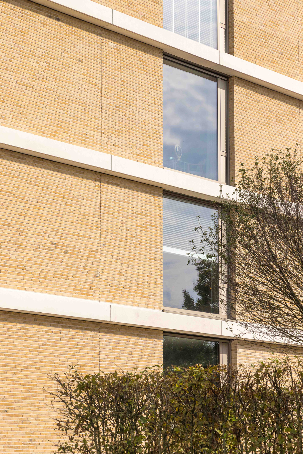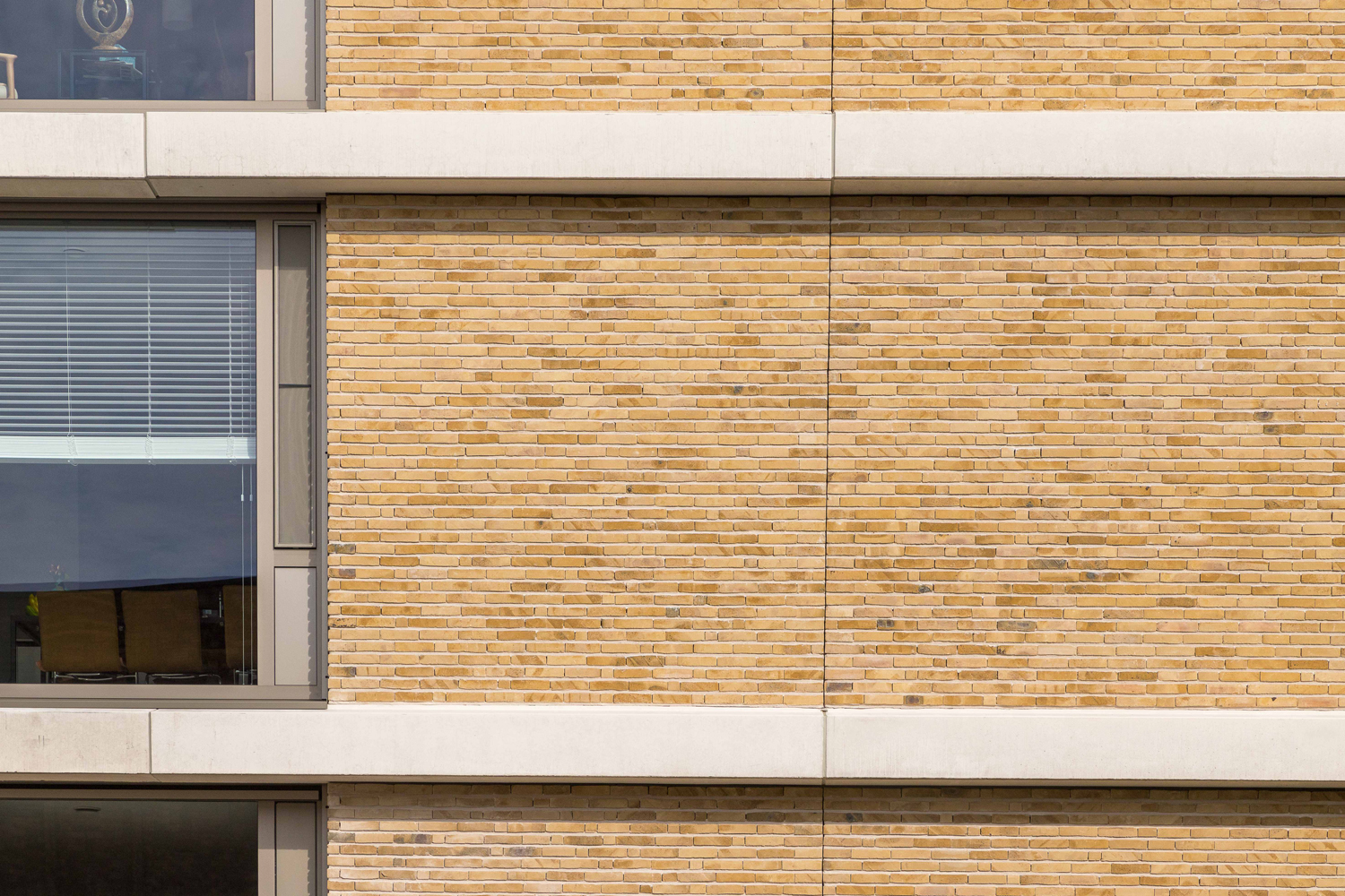 "Daarnaast speelt baksteen een hoofdrol. Door een wijziging in het bouwsysteem waren we op zoek naar een steen met minder diepte om het gewicht en bouwvolume te beperken. Vanwege de beperkte diepte van 7 cm bleek het ecologische Brick7-formaat een ideale keuze. Bovendien sluit de okerkleur perfect aan bij het beeld dat wij voor ogen hadden. De zachte zandkleurige toon blendt heel mooi met de andere materialen. Vooral de gemêleerde tekening geeft het gebouw extra textuur en nuance. Door de steen zonder stootvoeg te verwerken worden de horizontale lijnen ook nog eens extra geaccentueerd. In zijn totaliteit ontstaat er een harmonieus evenwicht tussen steen, beton, natuursteen, glas en de natuurlijke omgeving", besluit Pascal Grosfeld.