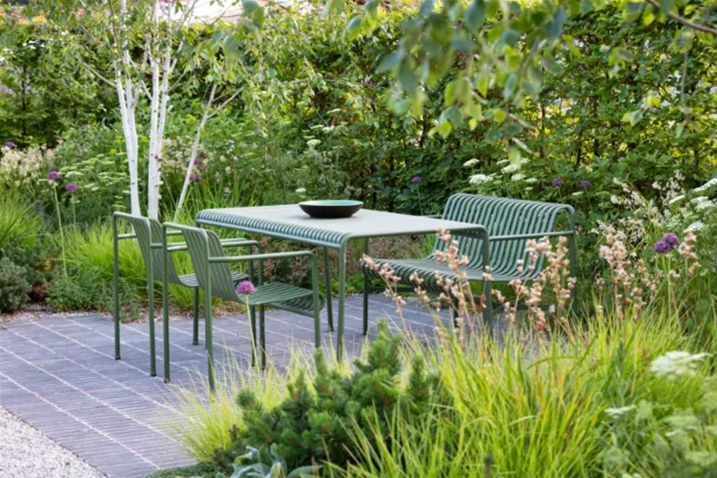De voortuin bestaat uit een minimalistische compositie van gesnoeide beuk en siergrassen die refereren aan de rietvelden langs de nabijgelegen riviermonding. Vervolgens vloeit de ruimte over in een weelderige grindtuin, omringd met lokale beplanting zoals berken, dwergdennen en grassen. De berken geven hoogte aan de tuin en bakenen de kamers op subtiele wijze af. Tegelijk kaderen ze het geheel en bieden ze gefilterde zichten op de rest van het groen. Vervolgens leidt een pad via een wilde bloemenweide naar een moestuin waar de bewoners eigen, verse producten kunnen kweken. Daar is ook een regenwateropvangsysteem aanwezig voor het duurzaam hergebruik van regenwater in de moestuin.