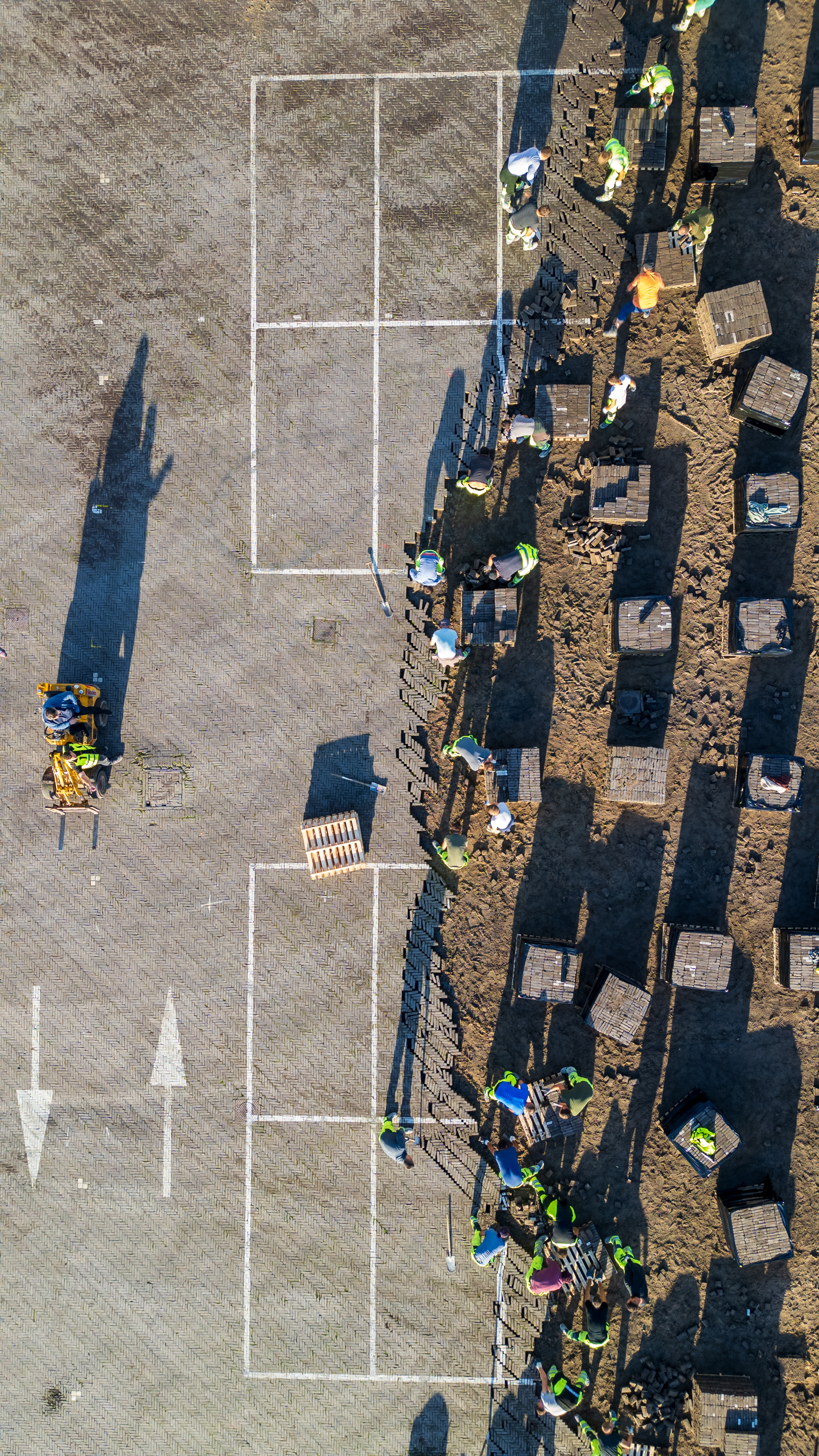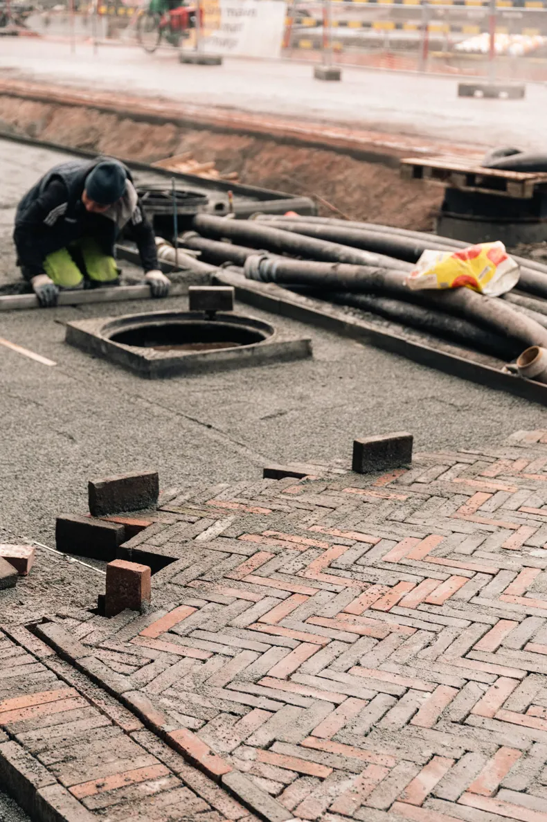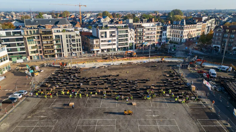 De reeds aanwezige kleiklinkers werden zorgvuldig uit de ondergrond gehaald en gesorteerd. Daarna werden ze op pallets gestapeld, klaar om opnieuw gelegd te worden. Het resultaat is indrukwekkend: meer dan 60% van de klinkers wordt opnieuw verwerkt in het vernieuwde ontwerp. Dit maakt het project niet alleen duurzaam, maar ook economisch aantrekkelijk, aangezien deze herbruikbare materialen een nieuwe bestemming vinden, of het nu op de Grote Markt is of als recup kleiklinker beschikbaar voor een particulier terras of oprit. Het transport en de verwerking van de klinkers gebeurden bovendien met minimale CO2-uitstoot, wat de impact op het milieu verder verkleint. Dit project benadrukt hoe hergebruik niet alleen afval vermindert, maar ook bijdraagt aan een efficiënter bouwproces.