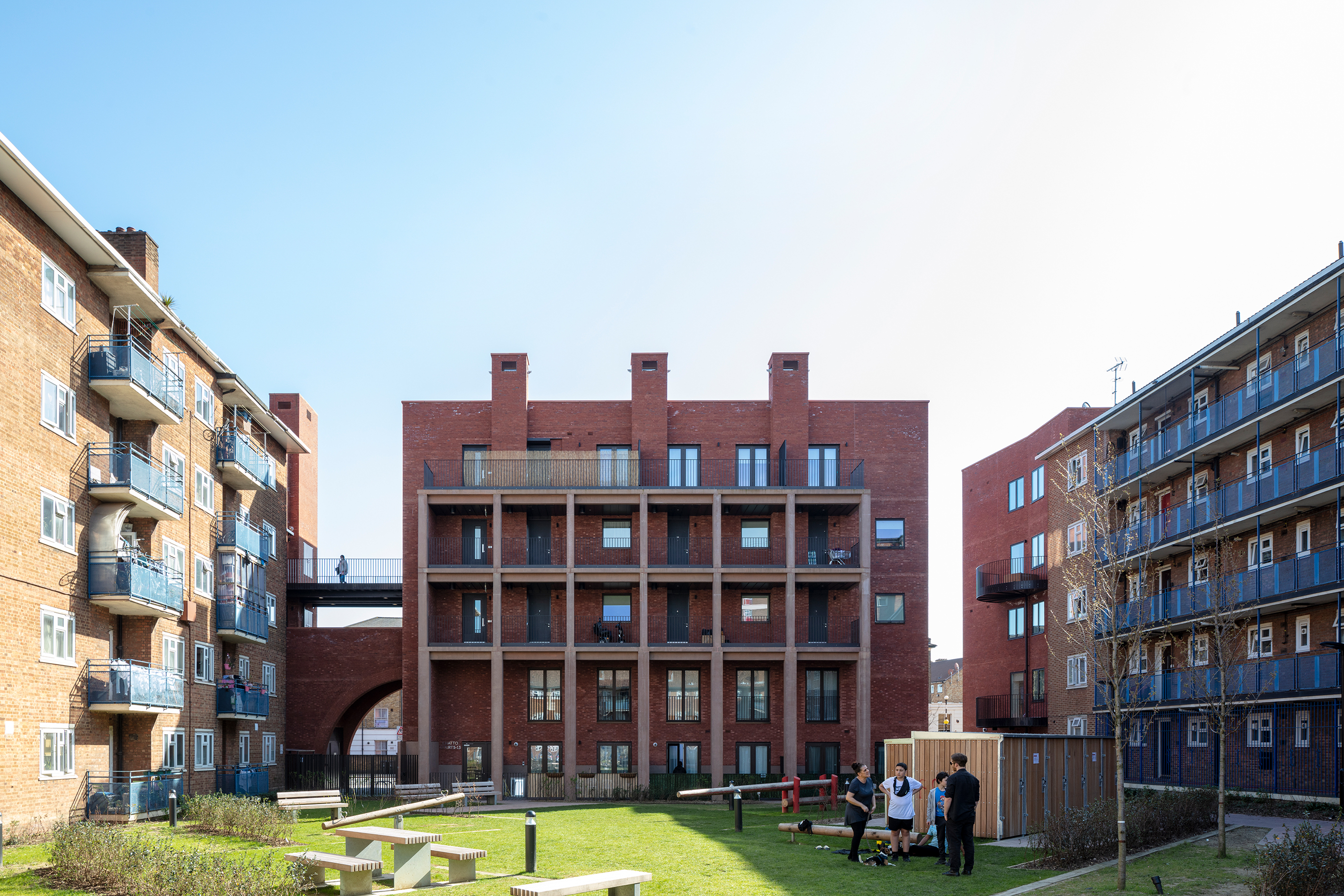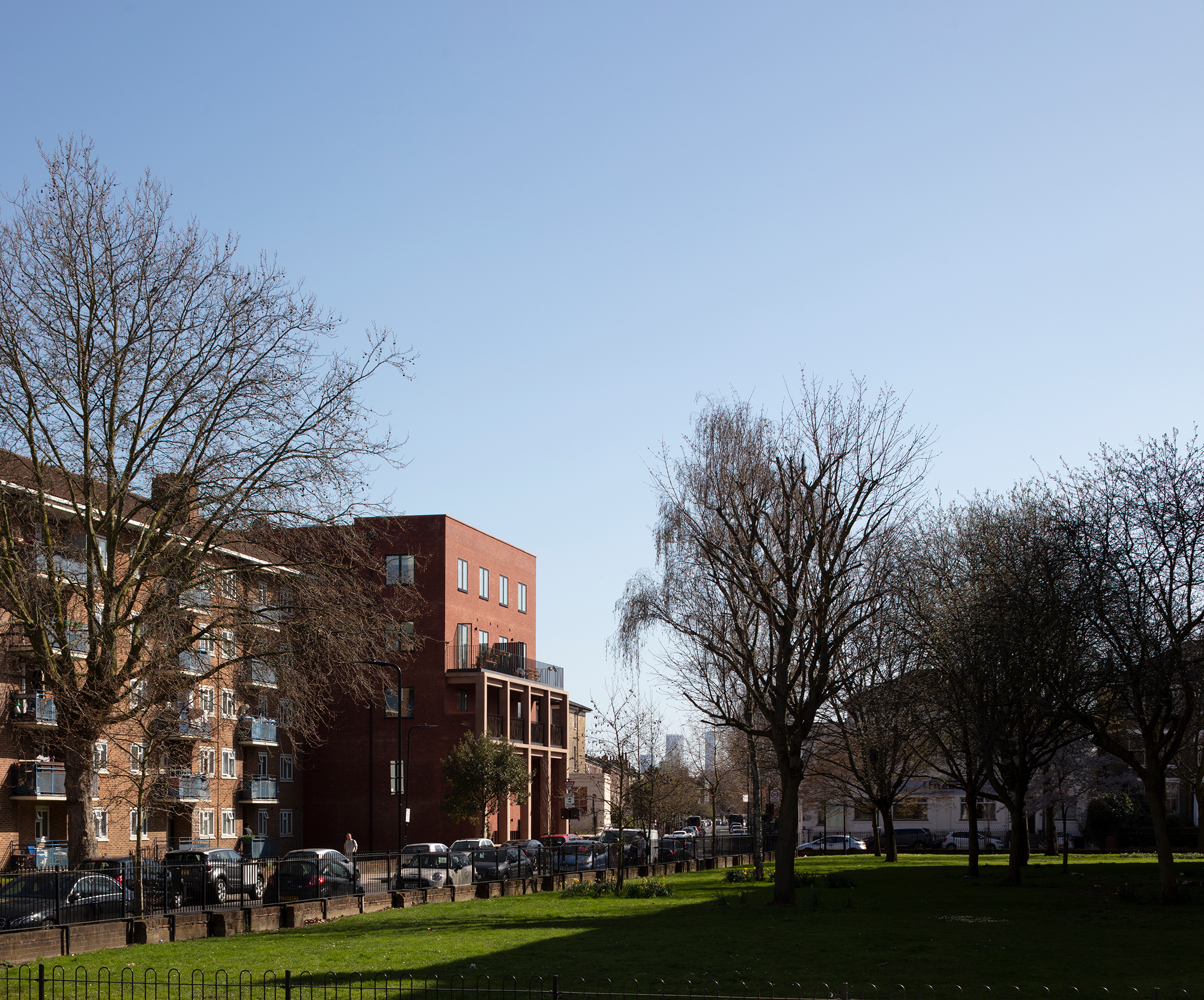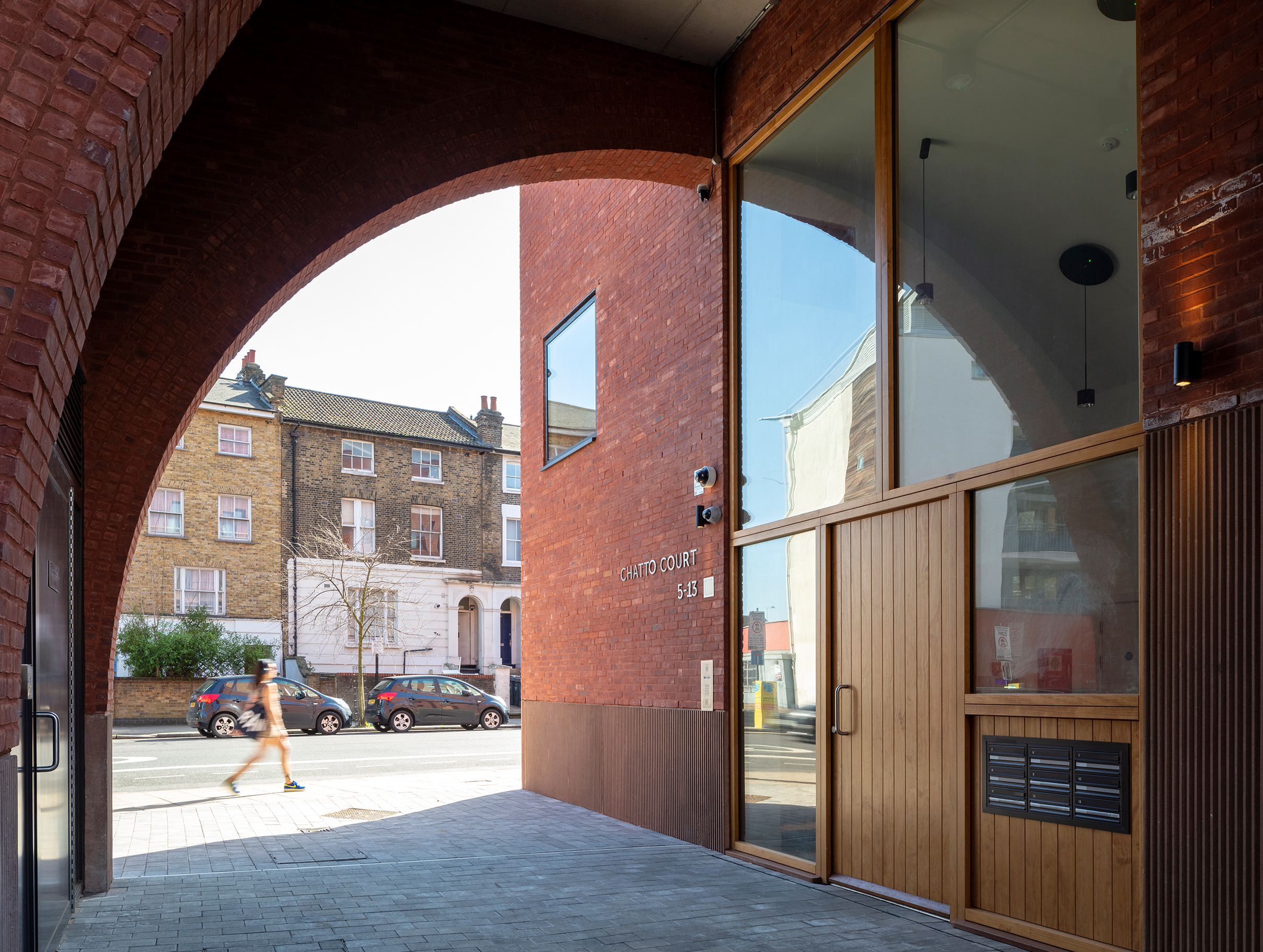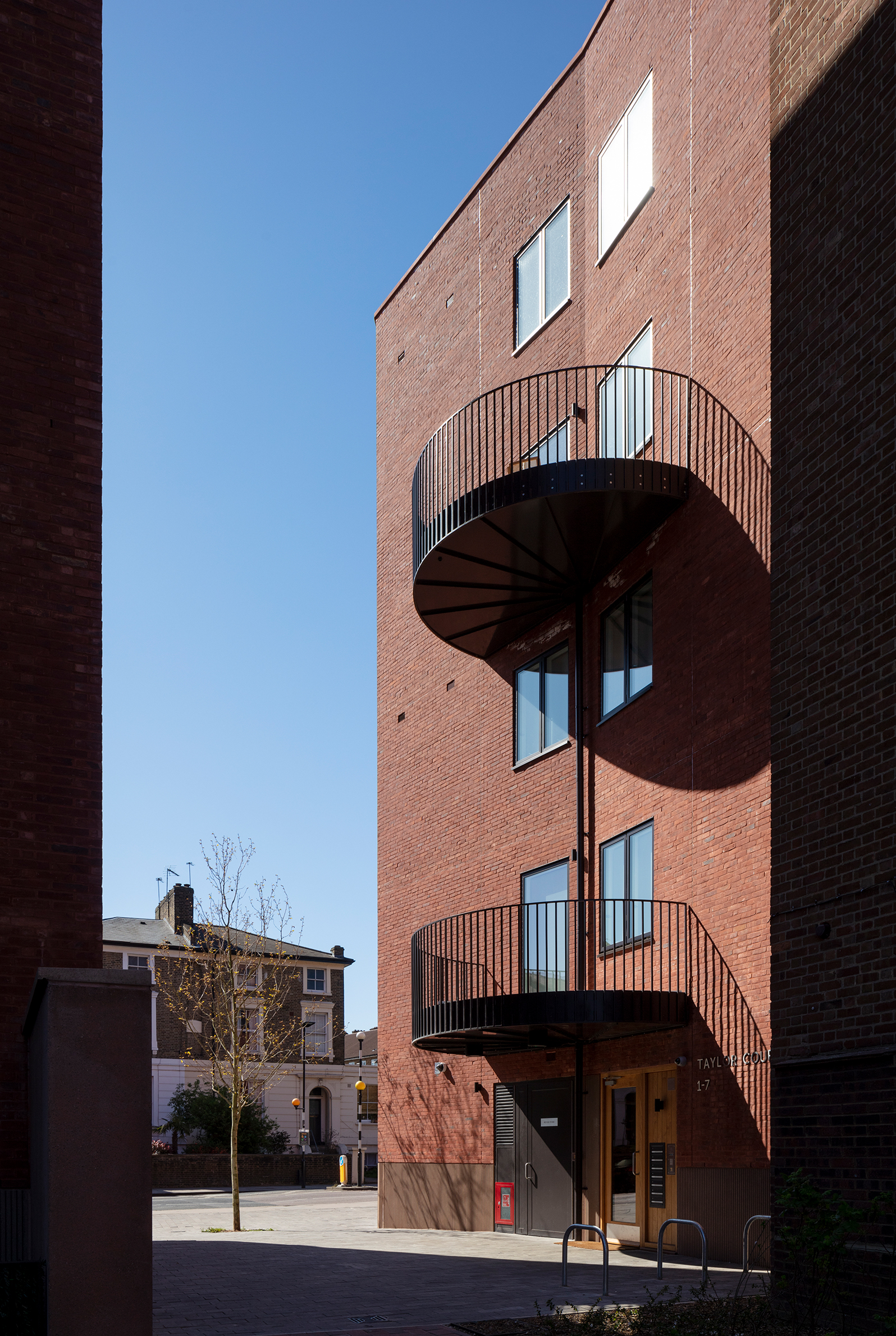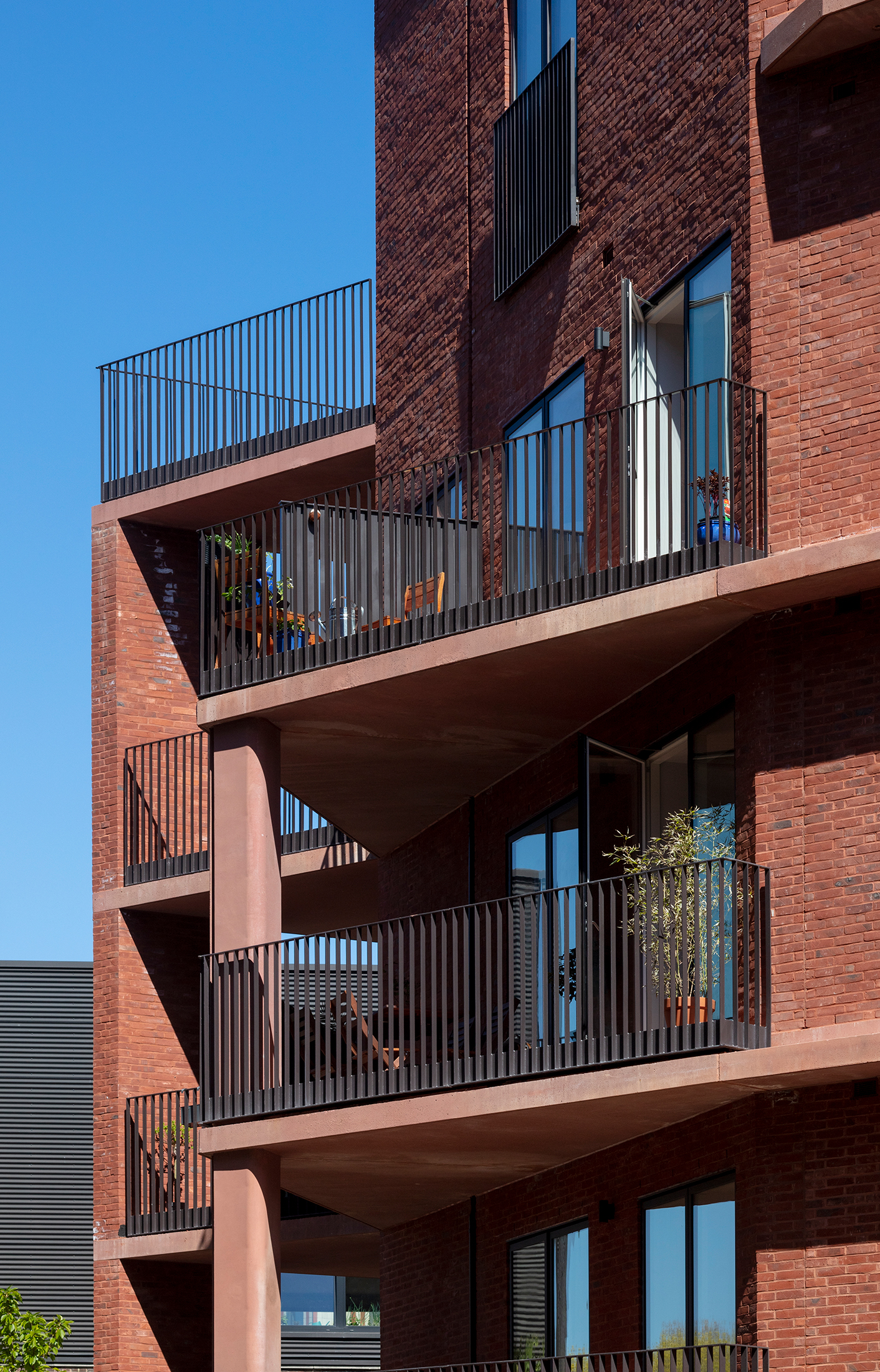 Award-winning bold architectural statement in urban setting with vibrant red facing brick