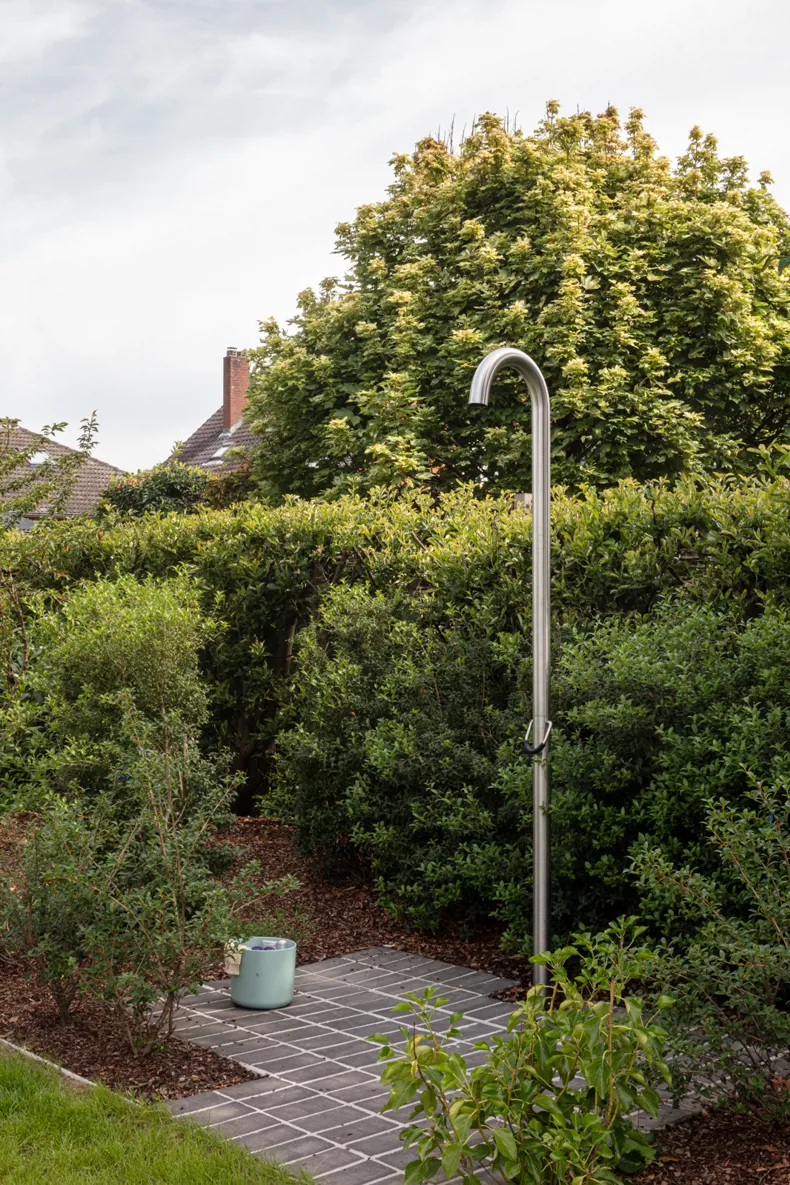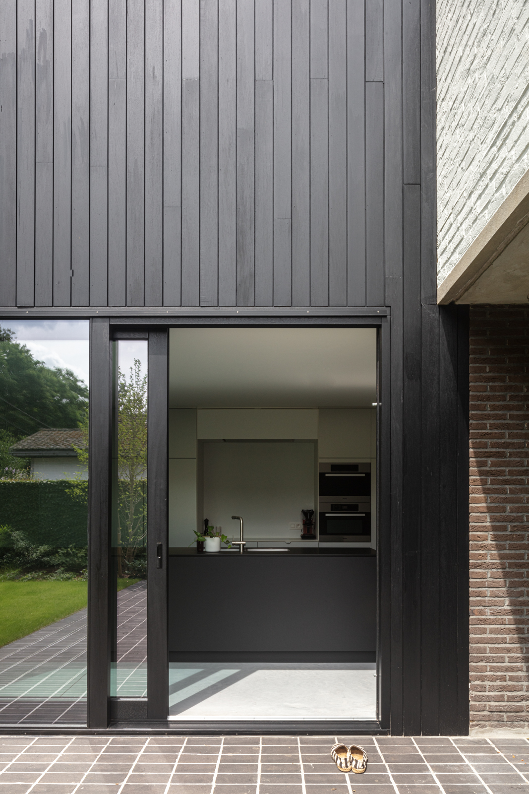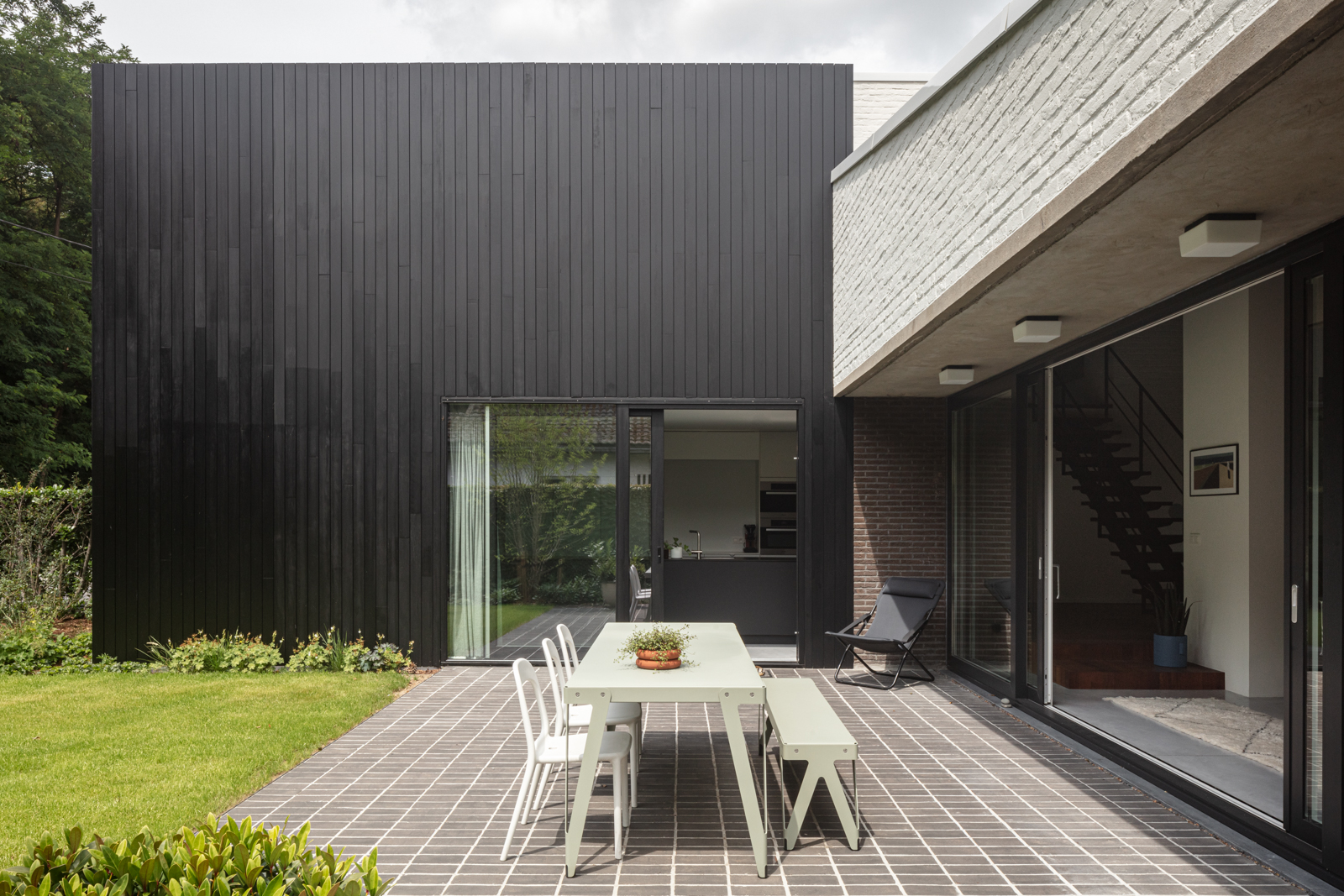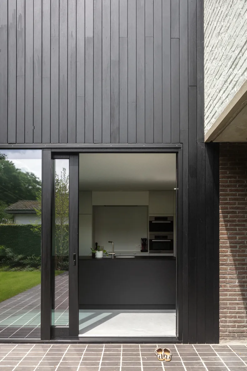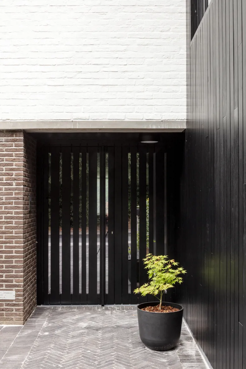 Het ontwerp werd zorgvuldig afgestemd op de architectuur van de woning. De keuze voor een donkere kleiklinker benadrukt de verbinding tussen binnen en buiten, doordat deze perfect aansluit bij de gevelsteen van de woning. Zo ontstaat een harmonieus geheel waarbij de tuin niet als los element wordt ervaren, maar als een natuurlijke verlenging van de woning.