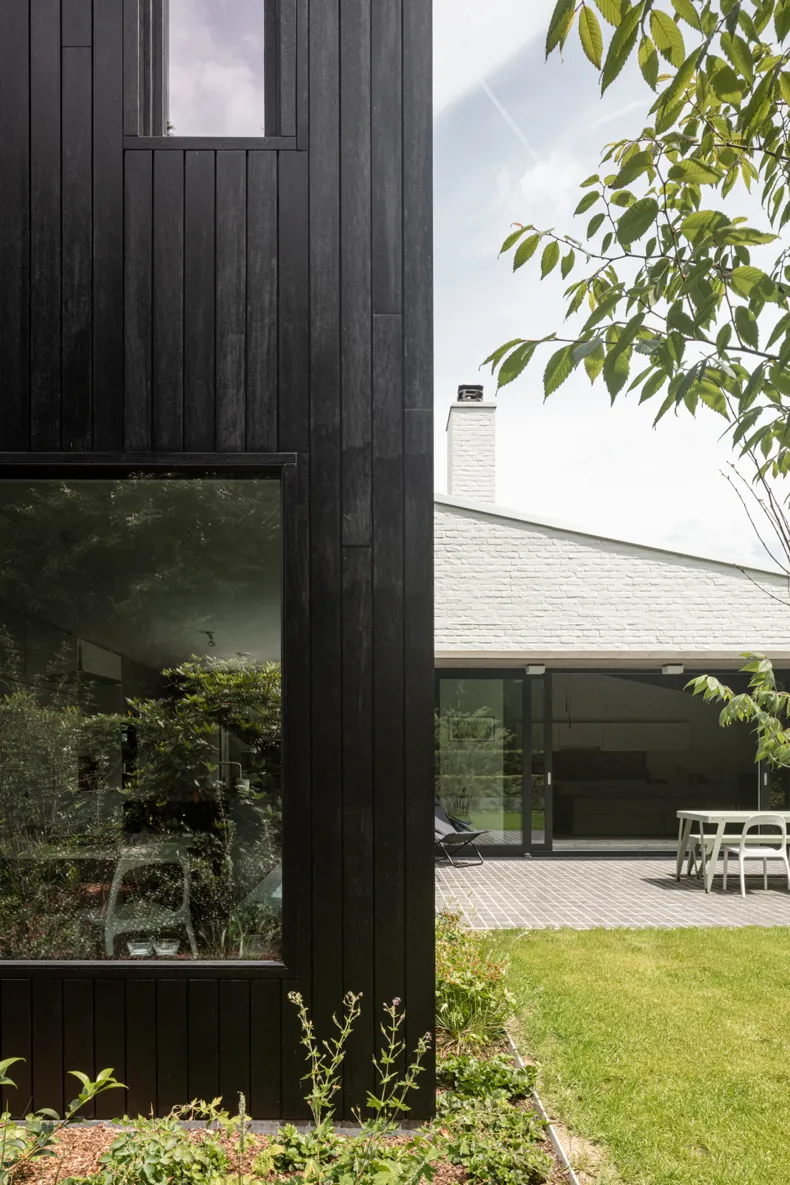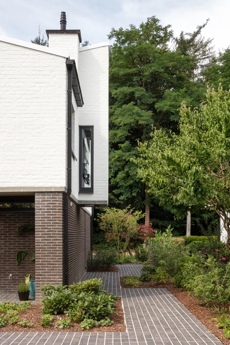 Naast de verhardingen en paden werd ook een zitbank ontworpen met dezelfde antracietkleurige kleiklinkers. Door deze op identieke wijze af te werken als de terrassen, wordt een visuele samenhang gecreëerd die de buitenruimte een rustgevende uitstraling geeft. De beplanting in de tuin werd zorgvuldig geselecteerd om zowel structuur als kleur toe te voegen, met een combinatie van meerstammige bomen, wintergroene sierstruiken en bloeiende vaste planten.