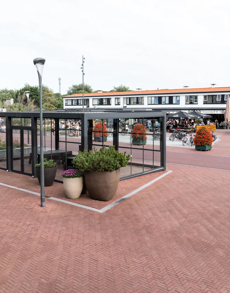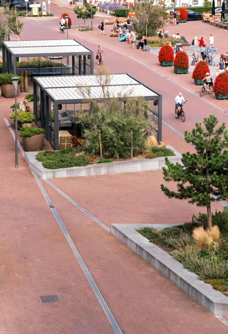 Dezelfde vormentaal wordt doorgetrokken naar de duinen waar doorgangen in cortenstaal meer besloten plekken creëren, die door de groeiende beplanting steeds intiemer worden. Natuurlijke duinvegetatie en beplantingsvakken met zilte gewassen verzachten de verharding en versterken de landschappelijke context. Groen en kleiklinkers gaan hier een evenwichtige dialoog aan, waarin duurzaamheid, beleving en esthetiek samenkomen.