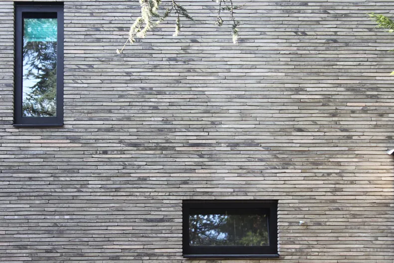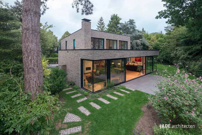 Voor de transformatie van de villa koos JADE architecten voor de groen-grijze gevelsteen infinitum 6013: “Het ontwerp en materialenonderzoek leidde naar een steen die het huis inbedt in zijn omgeving met het levende groen dat verandert onder invloed van weer en jaargetijden, in plaats van een contrast te zoeken in de gevels. Bovendien sluit het Hand-Made karakter van de gevelsteen aan bij het natuurlijke karakter, terwijl het lange formaat een exclusiviteit biedt die past bij de uitstraling van een villa.”