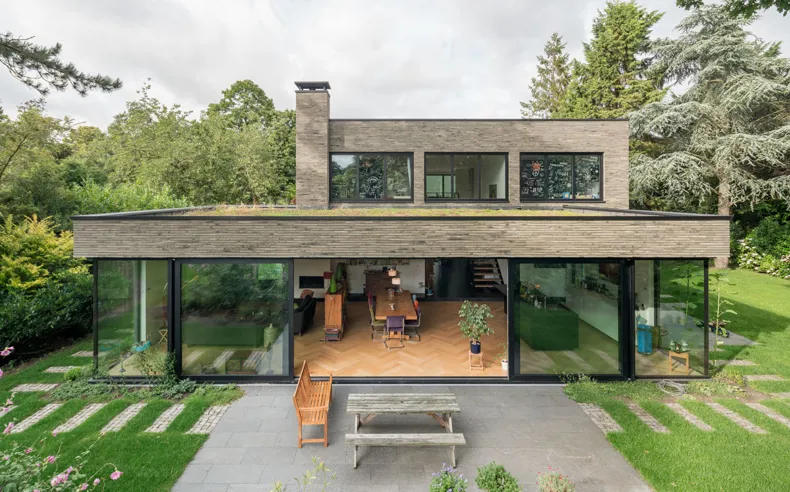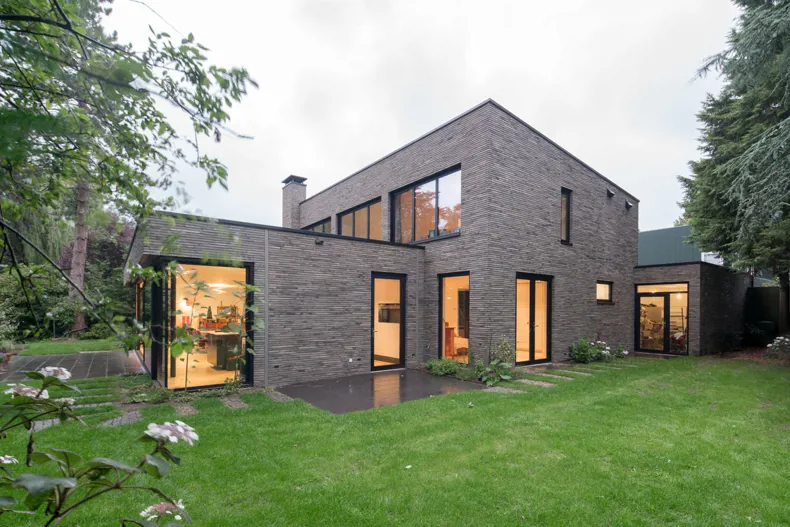 De villa als geheel is omringd door groen en bestaat zelf weer uit een schakeling van drie volumes, elk met een eigen grootte en oriëntatie op de tuin. De leesbaarheid van deze vorm en een terughoudendheid tegenover de plek waarop het staat wordt benadrukt door het huis op te trekken uit één materiaal: de groen-grijze gevelsteen infinitum 6013. Grote glasvlakken verbinden het leven van buiten met dat binnenin de woning, in de zomer zelfs letterlijk doordat je de grote ramen volledig kan openen.