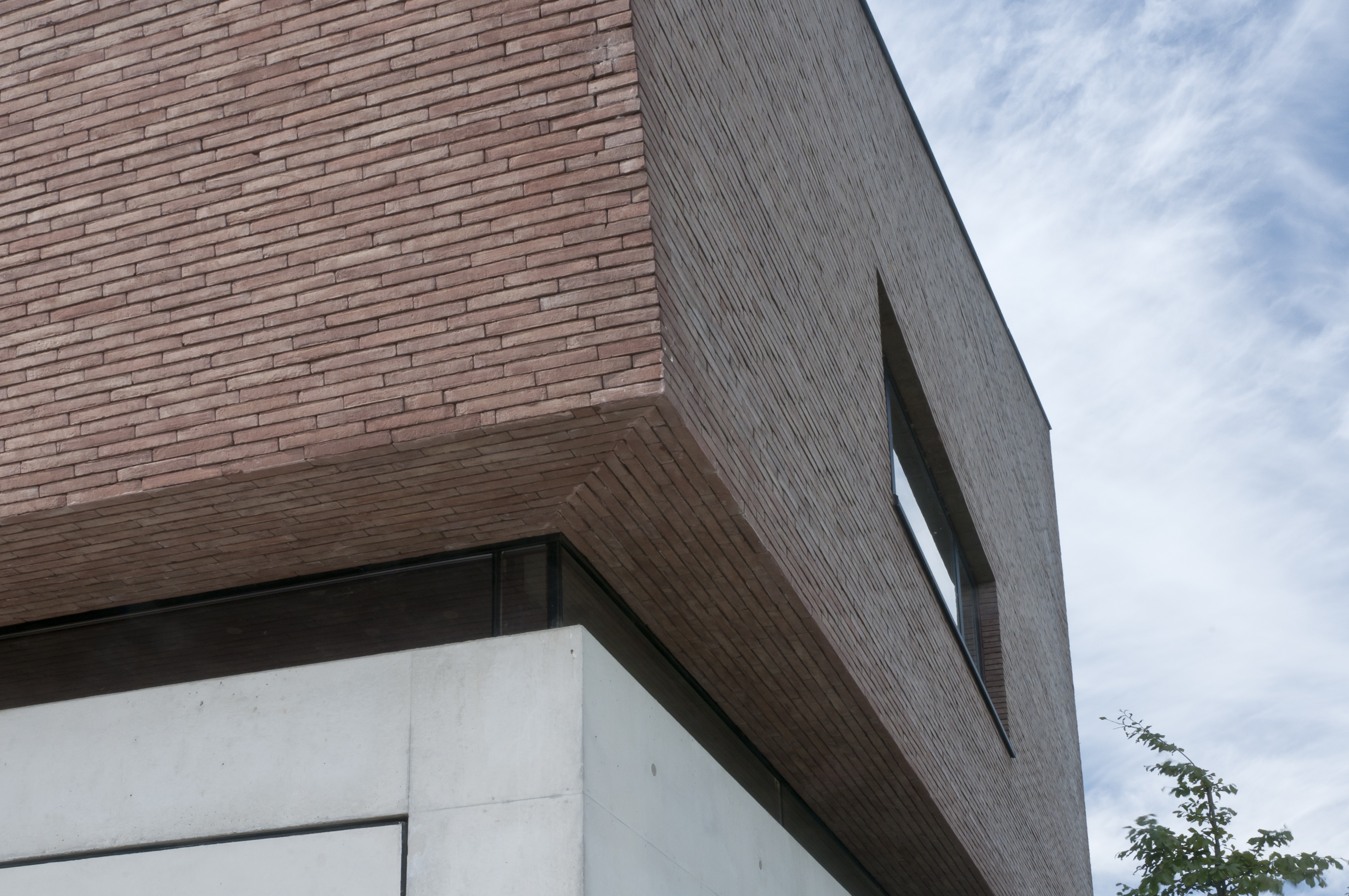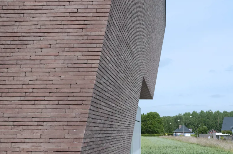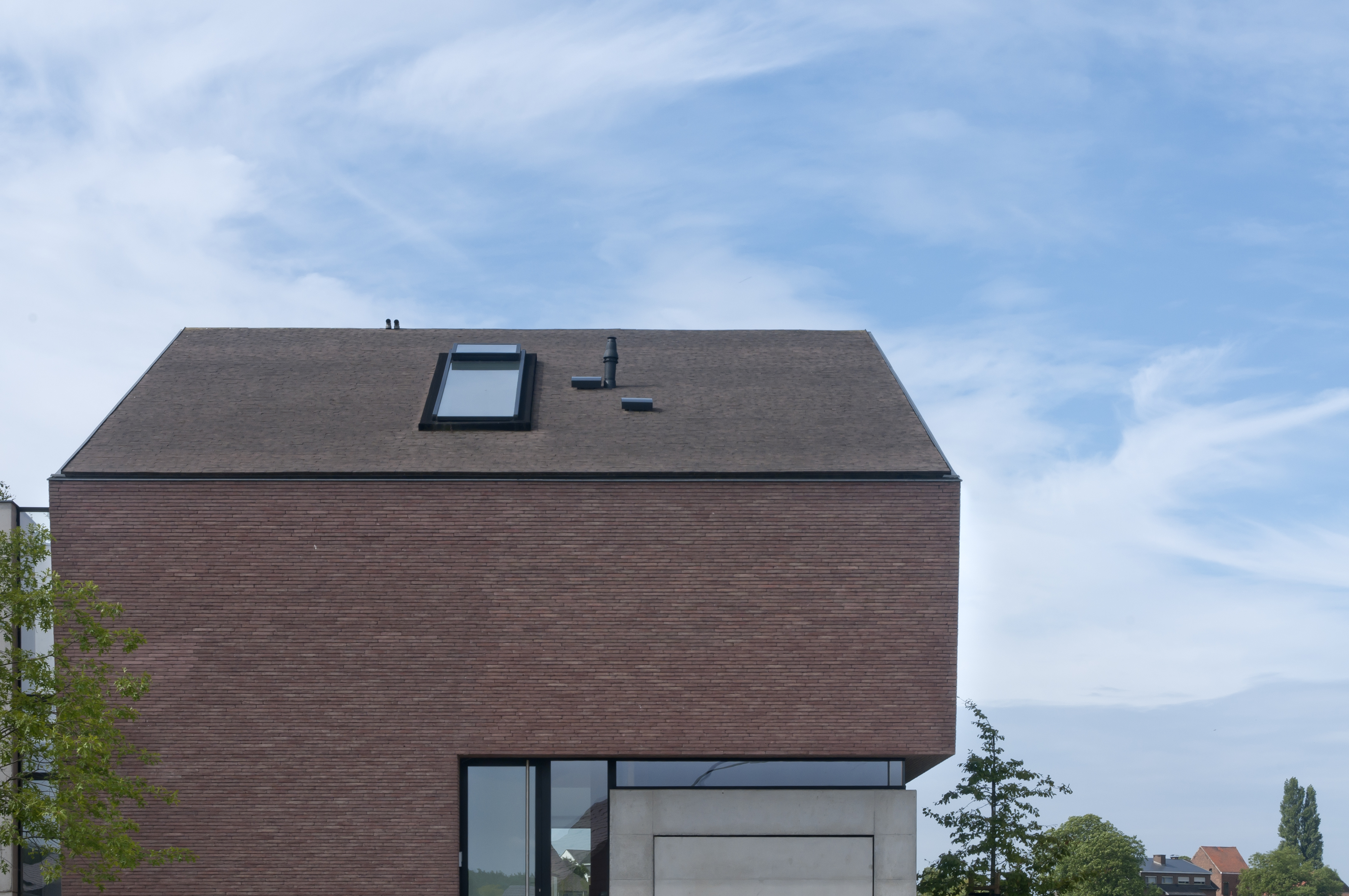 Op het dak zijn de gevelstenen dan weer plat verlijmd op de EPDM dichting die de betonplaat en dakisolatie bedekt. Door de bezanding aan de bovenzijde van de steen vormt het dak zo één geheel met de andere steenvolumes.