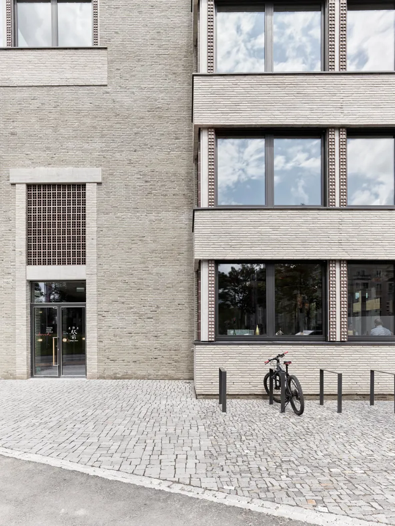 De architecten kozen voor gevelstenen met een beige en groenachtige tint, geïnspireerd op de Bollinger zandsteen die gebruikt wordt in het metselwerk van de villa. Deze keuze weerspiegelt het streven naar visuele continuïteit tussen de oude en nieuwe structuren. Na een uitgebreide zoektocht selecteerde het team de bakstenen linea 7035 en 7036. Deze gevelstenen voldeden aan de esthetische en technische eisen van het project en boden kleur, textuur en veelzijdigheid. De beige en groenachtige tinten pasten perfect bij het stenen metselwerk van de villa en zorgden voor een subtiele maar effectieve visuele verbinding. Het gestructureerde oppervlak van de bakstenen en het “platte steenformaat benadrukten de verticaliteit van het nieuwe gebouw, versterkten de proporties en vulden het ontwerp aan”, aldus Bolthauser architecten. De uniformiteit en de mogelijkheid om de tinten van de bakstenen te combineren maakten nauwkeurig maatwerk mogelijk, waardoor de gevel resoneerde met het erfgoed van de villa.
