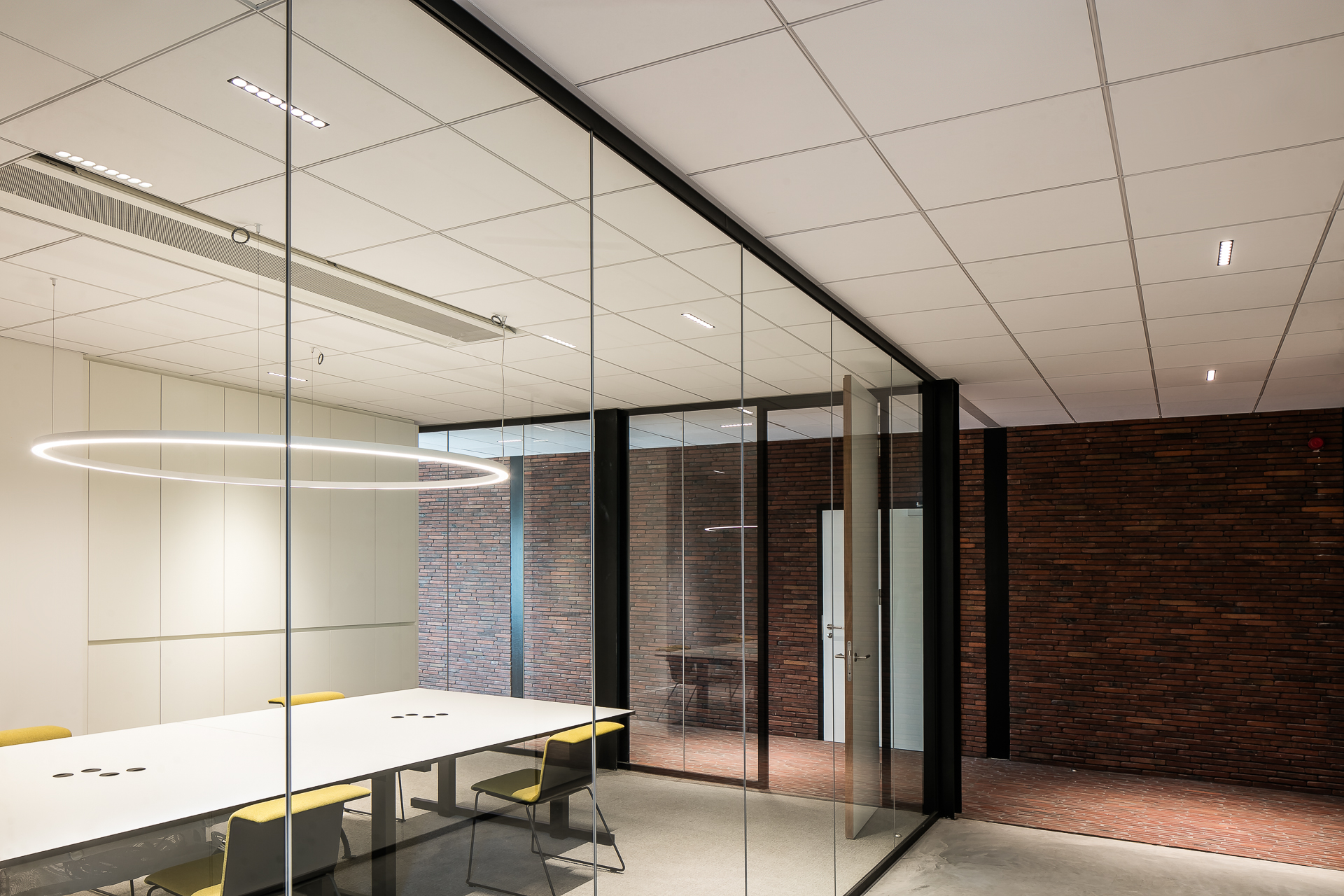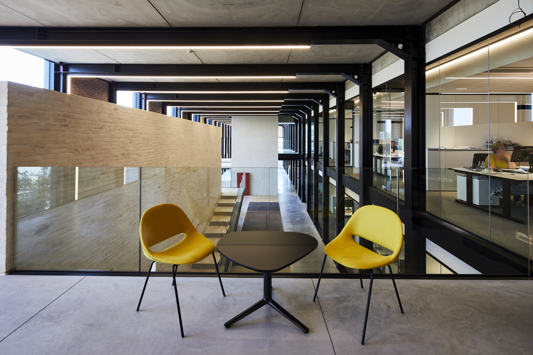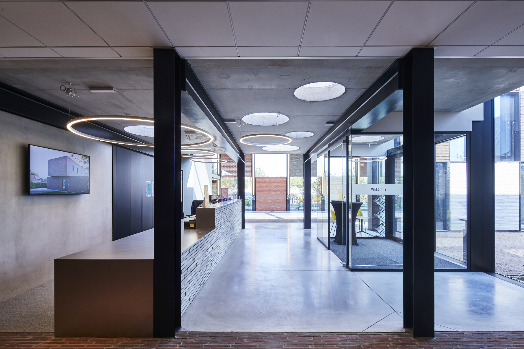 Je betreedt het nieuwe gebouw via de incisie tussen de oude loodsen van de steenbakkerij en de nieuwe showroom, die als eyecatcher werkt en de identiteit van de gebruiker onmiddellijk prijsgeeft. Oud en nieuw worden gelinkt door een transparante schakel, waar de kantoren als ader fungeren binnen de steenbakkerij.