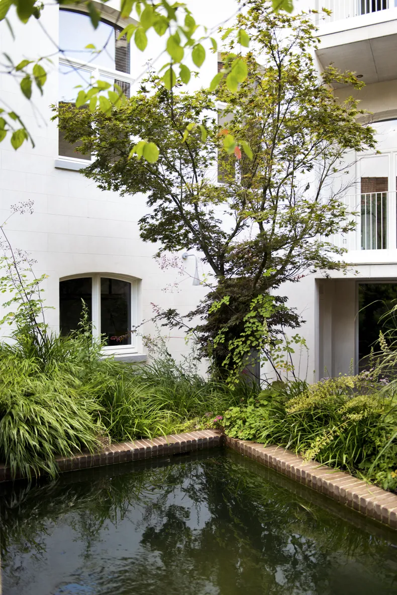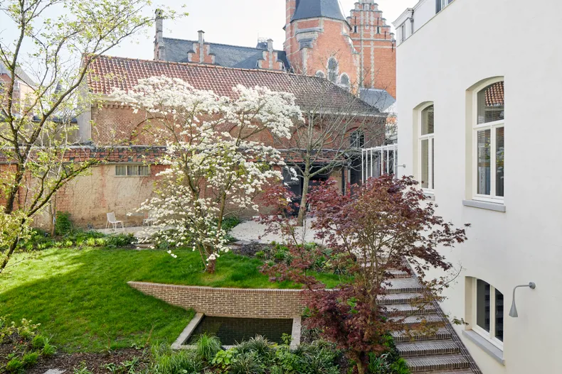 Bij het ontwerp van deze groene oase speelde ook het belang van de historiek van de site. De ingesloten tuin met een oppervlakte van ca. 300 m² grenst aan een oud koetshuis dat ook de achtergevel vormt. De authentieke Ancienne Belgique Camel kleiklinkers verbinden naadloos de nieuwe en oude architecturale vormgeving. De klinkers vertrekken vanuit de souterrain en vloeien via het terras over in de trappen, keermuren en vijver die de visuele connectie maken met de bakstenen muur van het koetshuis.