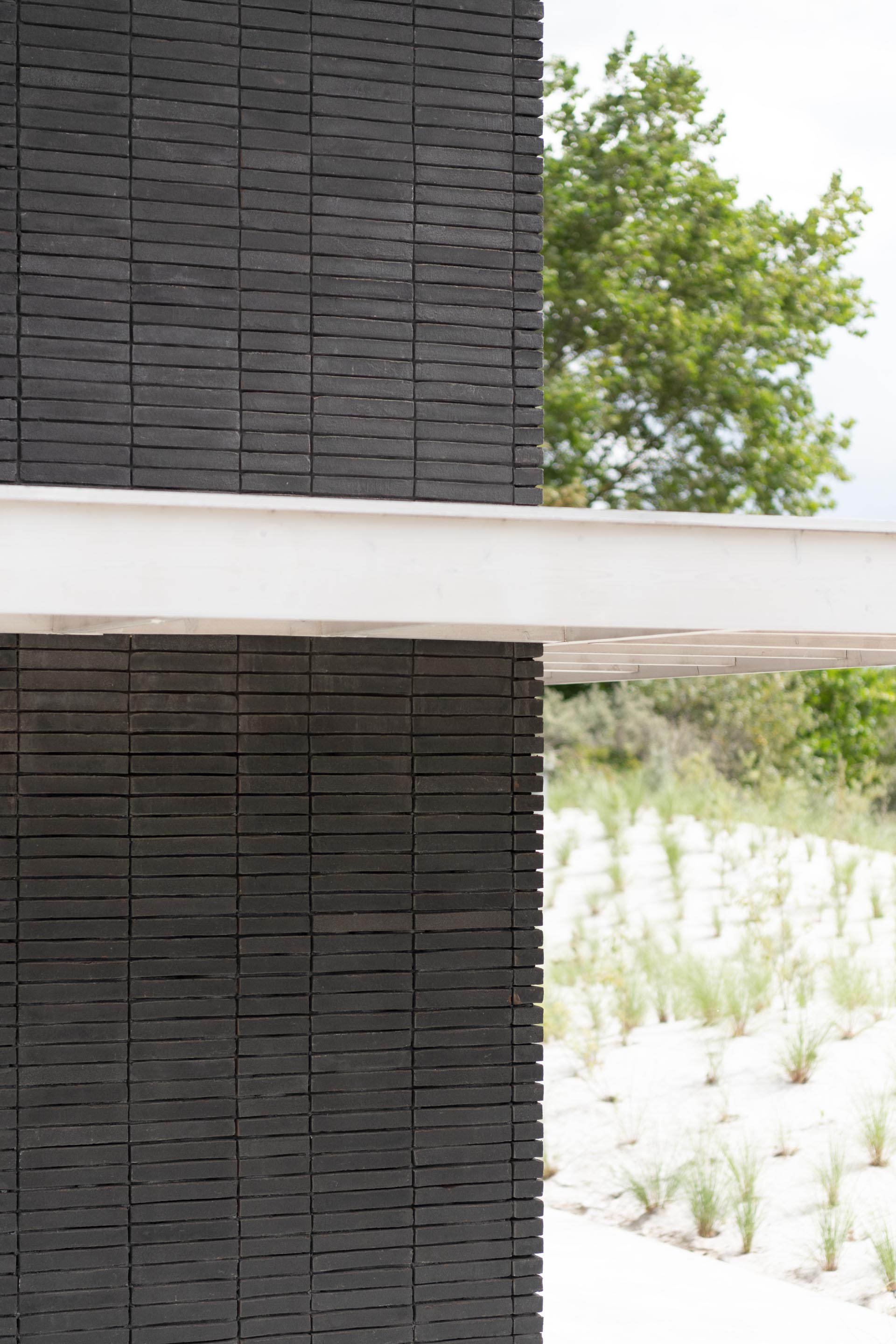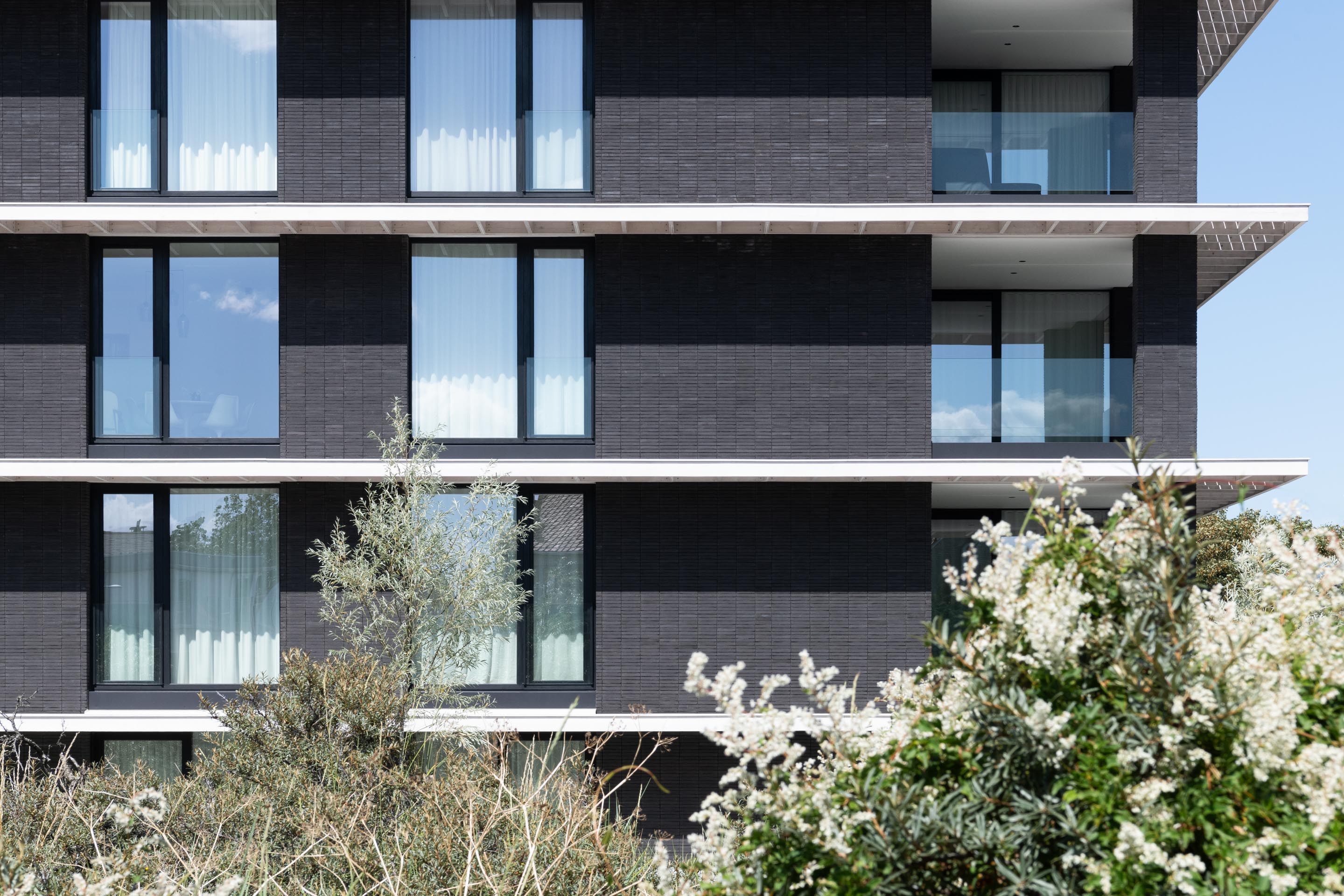 Het orthogonaal metselverband en de verlijmde verwerkingstechniek versterken het stapeleffect van de gevelsteen, wat bijdraagt aan de verfijning van het geheel. Dankzij het langgerekte formaat en de vormvastheid van de linea7 7021 baksteen slaagden de architecten erin een gevel te realiseren die zowel robuust als elegant oogt. De kleurkeuze, zo donker mogelijk, werd bewust gemaakt om het gewenste contrast en de dieptewerking in de gevel te bekomen. Deze antraciet slanke baksteen accentueert de horizontale lijnen en is bovendien een ecologisch formaat. De ECO-7-size gevelsteen biedt meer plaats voor isolatie of bewoonbare oppervlakte en vergt minder energie en grondstoffen bij de productie ten opzichte van traditionele formaten.