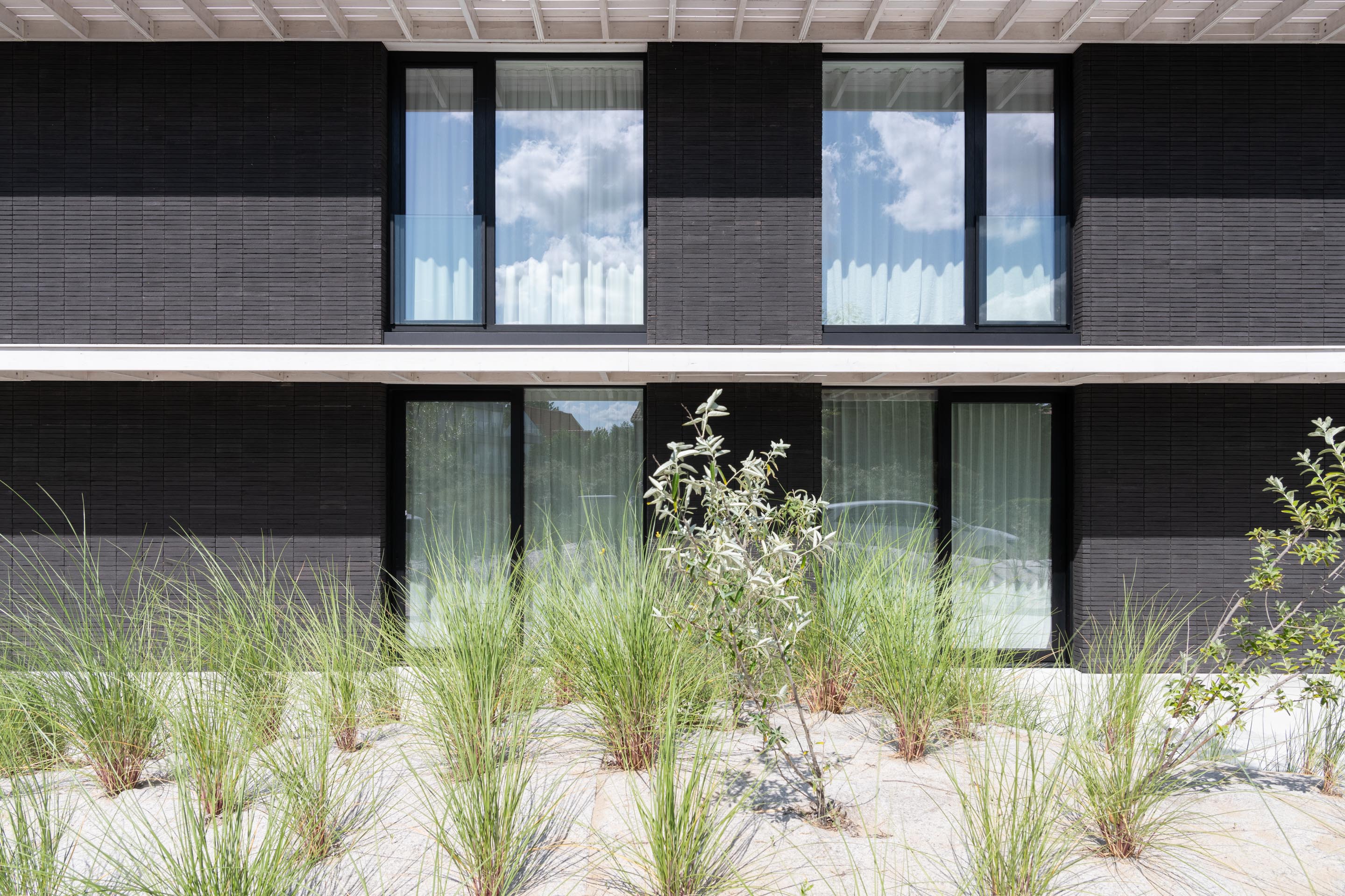 De keuze voor de Vande Moortel gevelsteen linea7 7021 is daarbij essentieel. De donkere baksteen zorgt voor een krachtig contrast met de wit gebeitste houten luifelstructuren, waardoor het project een uitgesproken hedendaags en karaktervol uitzicht krijgt. Van op afstand oogt de gevel egaal en monolithisch, terwijl de steen van dichtbij een subtiele textuur en een fijn lijnenspel prijsgeeft. De bezande afwerking van deze vormbaksteen zorgt voor deze subtiele textuur, waar de strakke vormgeving van de gevelsteen eigen aan het Kaliber gamma zorgt voor het fijn lijnenspel.
