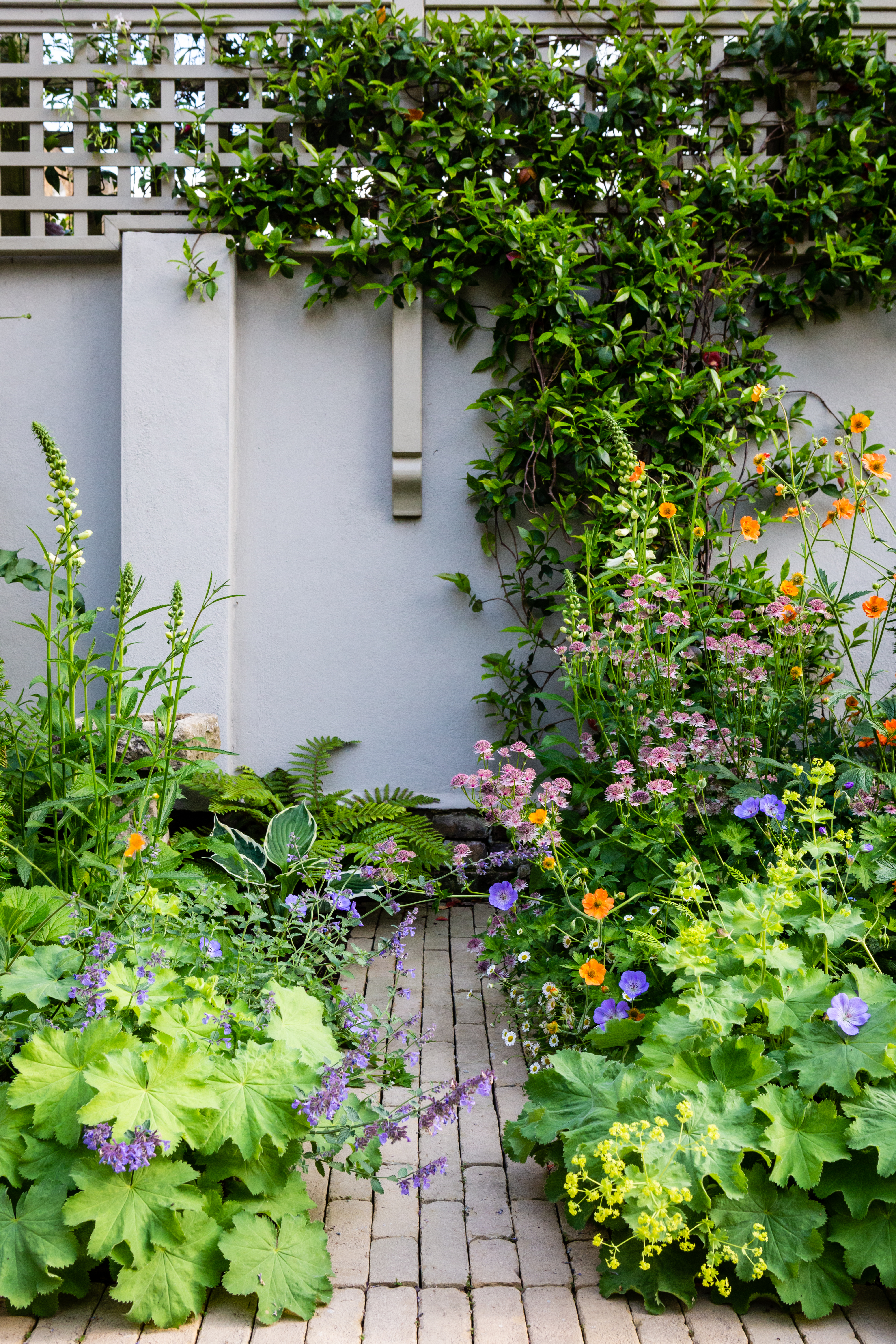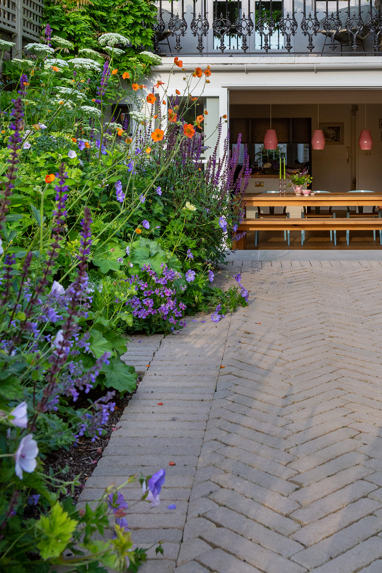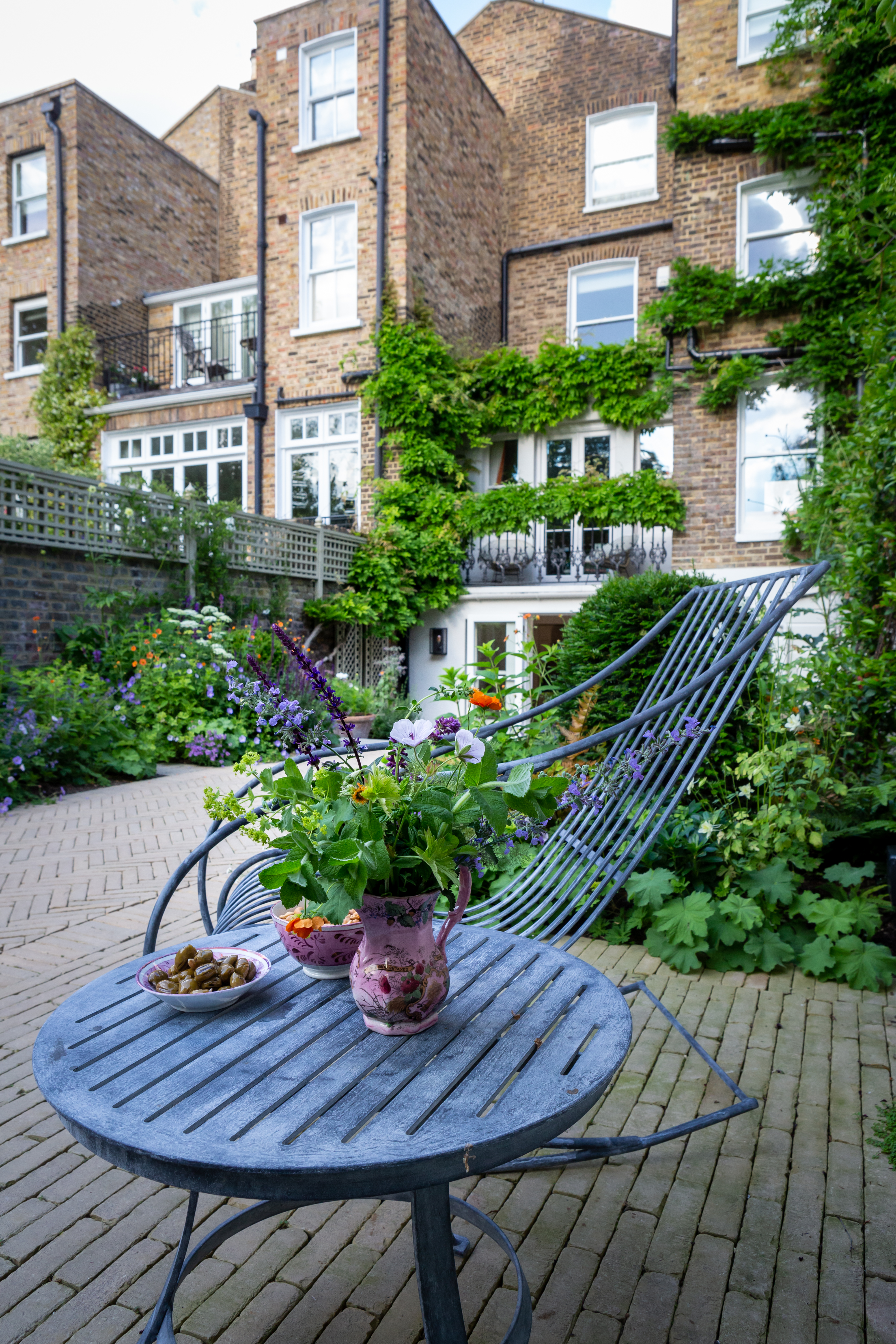 Deze prachtig ontworpen woontuin in Belsize Park in Londen is een balans tussen functionaliteit, esthetiek en ecologische duurzaamheid. De tuin, die bijna twee meter boven de benedenverdieping en meer dan een meter onder de verhoogde begane grond van het huis ligt, vormde een unieke ontwerpuitdaging. Het project vereiste de integratie van een gazon voor de jonge kinderen van de klant, een zithoek in het zonnigste deel van de tuin, een groentebed, voldoende opslagruimte en weelderige beplanting.