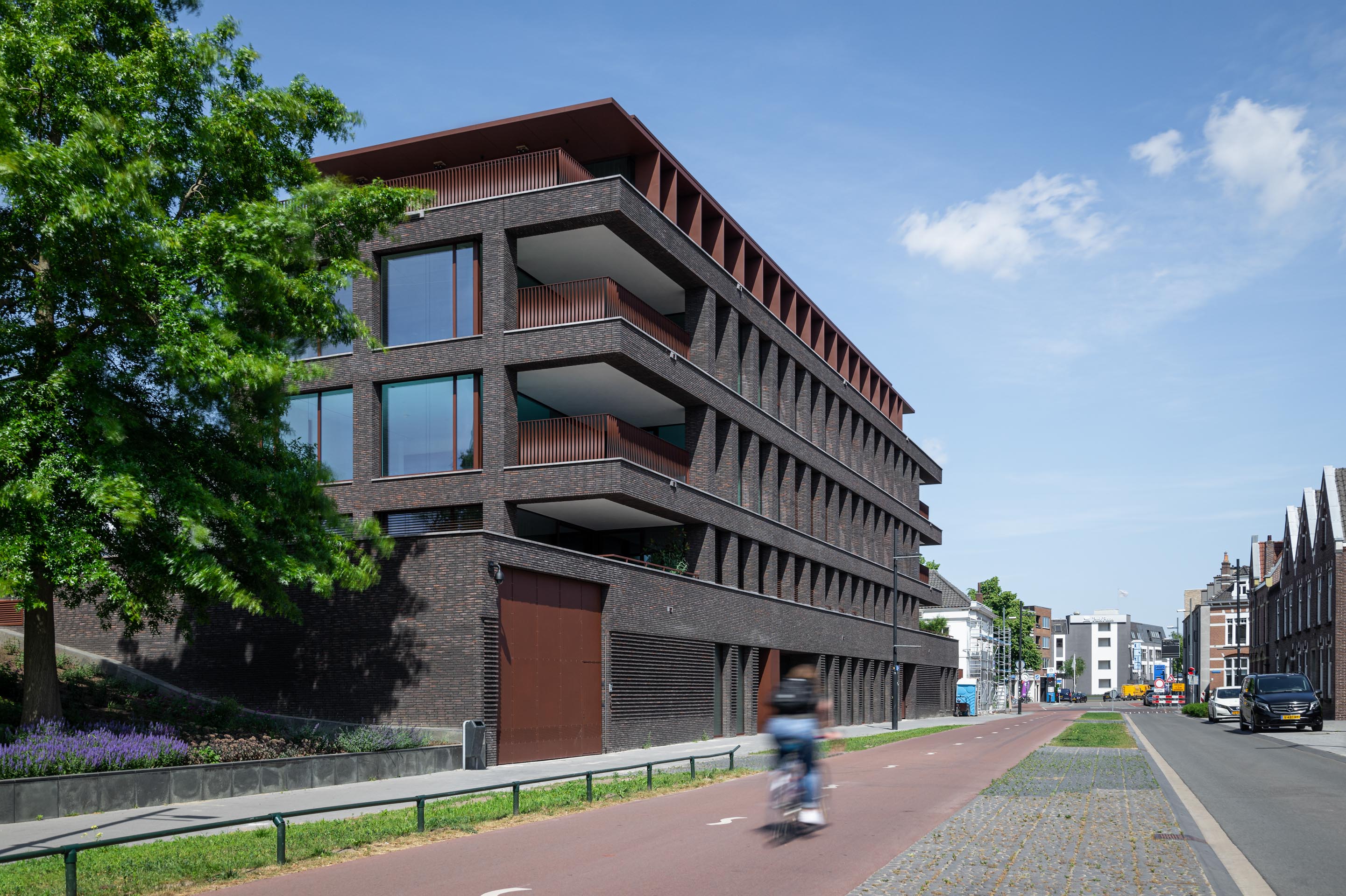 De appartementen zijn open met genoeg lichtinval dankzij deze grote glasramen. De schuiframen verbinden de binnenruimtes met de buitenruimtes, zodat de bewoners direct hun terras kunnen betreden. De buitenruimtes van de penthouses zijn dan weer iets terug gezet wat voor meer ruimte en privacy zorgt. De bruine, grote garagepoort geeft toegang tot de expeditieruimte van het achterliggende museum. De twee gebouwen zijn dus niet alleen esthetisch verbonden, maar ook letterlijk dankzij de toegangen. Dit ontwerp van Diederendirrix Architectuur heeft een eigen bouwstijl en identiteit, maar vormt toch een harmonieuze eenheid met het Van Abbemuseum.