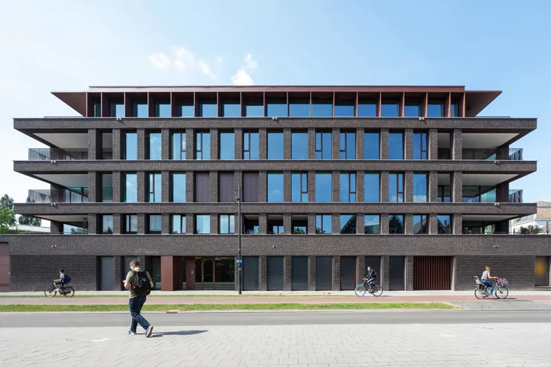 Het hoofdvolume, bestaande uit de vier eerste verdiepingen, is vervaardigd uit de bezande linea 3007 gevelsteen met unieke zwartbruine kleurenschakeringen. Door atmosferische verschillen in de bakoven en de hand-made techniek hebben een aantal stenen blekere en donkere zijden, wat deze baksteen uitzonderlijk maakt. De bezande afwerking van deze handvorm gevelsteen met natuurlijke nerven geeft het woongebouw een ruwe, natuurlijke uitstraling. De gevel past zodoende mooi bij de roodbruine gevel van het Van Abbemuseum. De baksteen wordt in dit woongebouw gecomplementeerd door de afwijkende materialen en detaillering van het penthouse. Deze heeft een aluminium luifel die opgebouwd is uit lamellen, wat het penthouse transparantie en privacy bezorgt. Ook op de gelijkvloerse verdieping wordt de gevelsteen afgewisseld met de aluminium accenten en werd decoratief uitspringend metselwerk toegepast voor een speels maar toch strak effect. Dankzij de diepe neggemaat van de raamopeningen oogt het gebouw introvert in het straatbeeld. In frontaal zicht is het gebouw juist erg transparant door de grootte en de hoeveelheid van de raamopeningen.