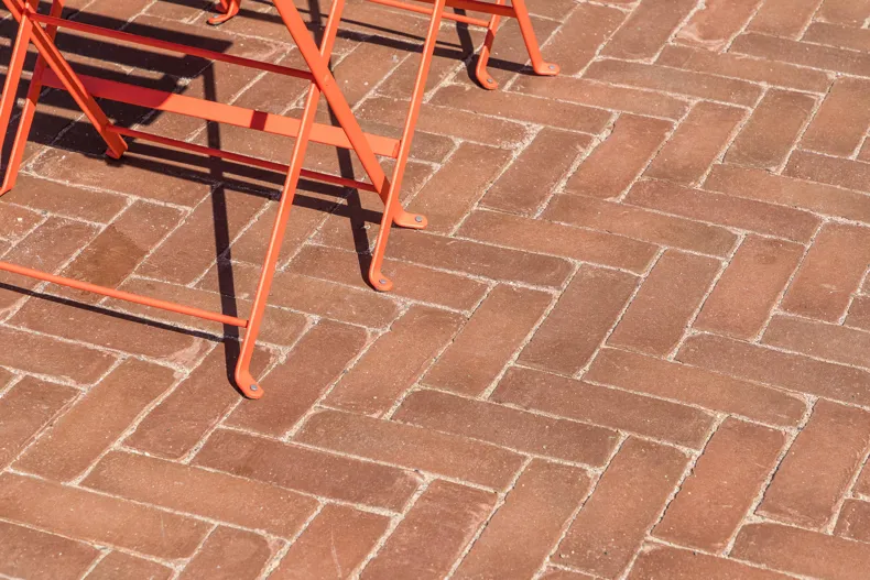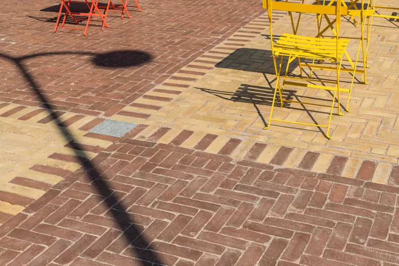 Wat meteen in het oog springt als je het plein benadert is de unieke bestrating. Er werd gekozen voor de straatbakstenen SeptimA DF Amarant en Vanille, verwerkt in een origineel dambordpatroon en geplaatst in elleboogverband. “De grootste ontwerpuitdaging was om er één plein van te maken en niet iedere zone een andere kleur of verband te geven”, benadrukt Simon Sprietsma. Dat is met deze keuzes en uitvoering goed gelukt. Het kleurrijke tapijt zorgt voor een vriendelijk en speels karakter, precies zoals het ontwerp beoogde. De levendige kleur en onbezande textuur van deze klinkers geven het plein niet alleen een warme uitstraling, maar zorgen ook voor een blijvend verzorgde look, zelfs bij intensief gebruik.