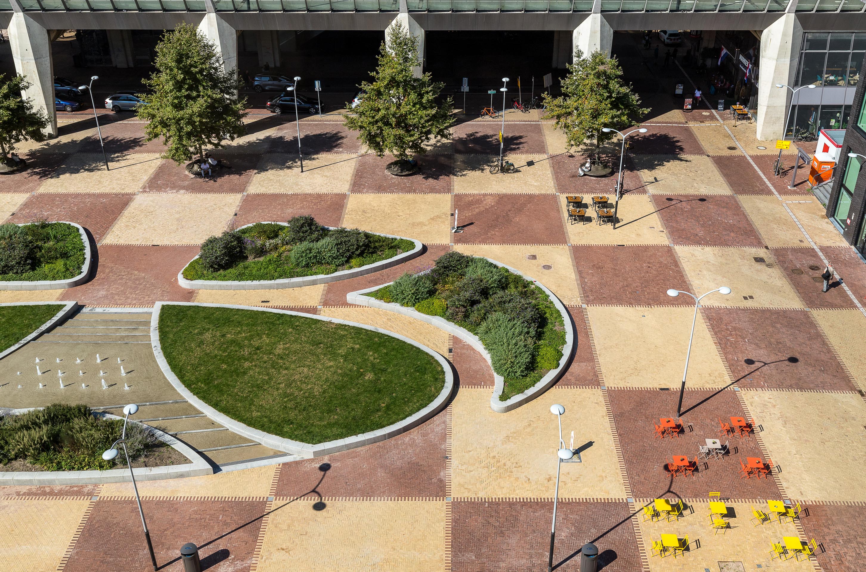 Het centrale deel van het plein is ingericht met groenvakken in ellipsvormige patronen, voorzien van zitranden in natuursteen en een fontein, die samen een organisch lijnenspel vormen. Rondom het plein vinden we horecazaken, een supermarkt en een ruime fietsenstalling. Onder het viaduct is ruimte voor taxi’s en kort parkeren, waarmee functionaliteit hand in hand gaat met esthetiek.